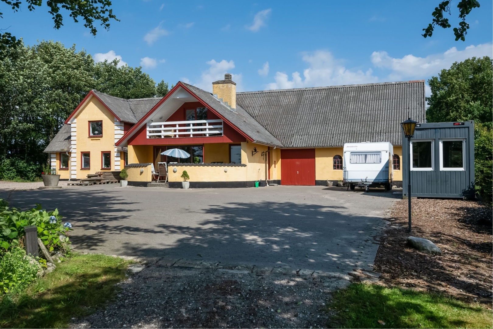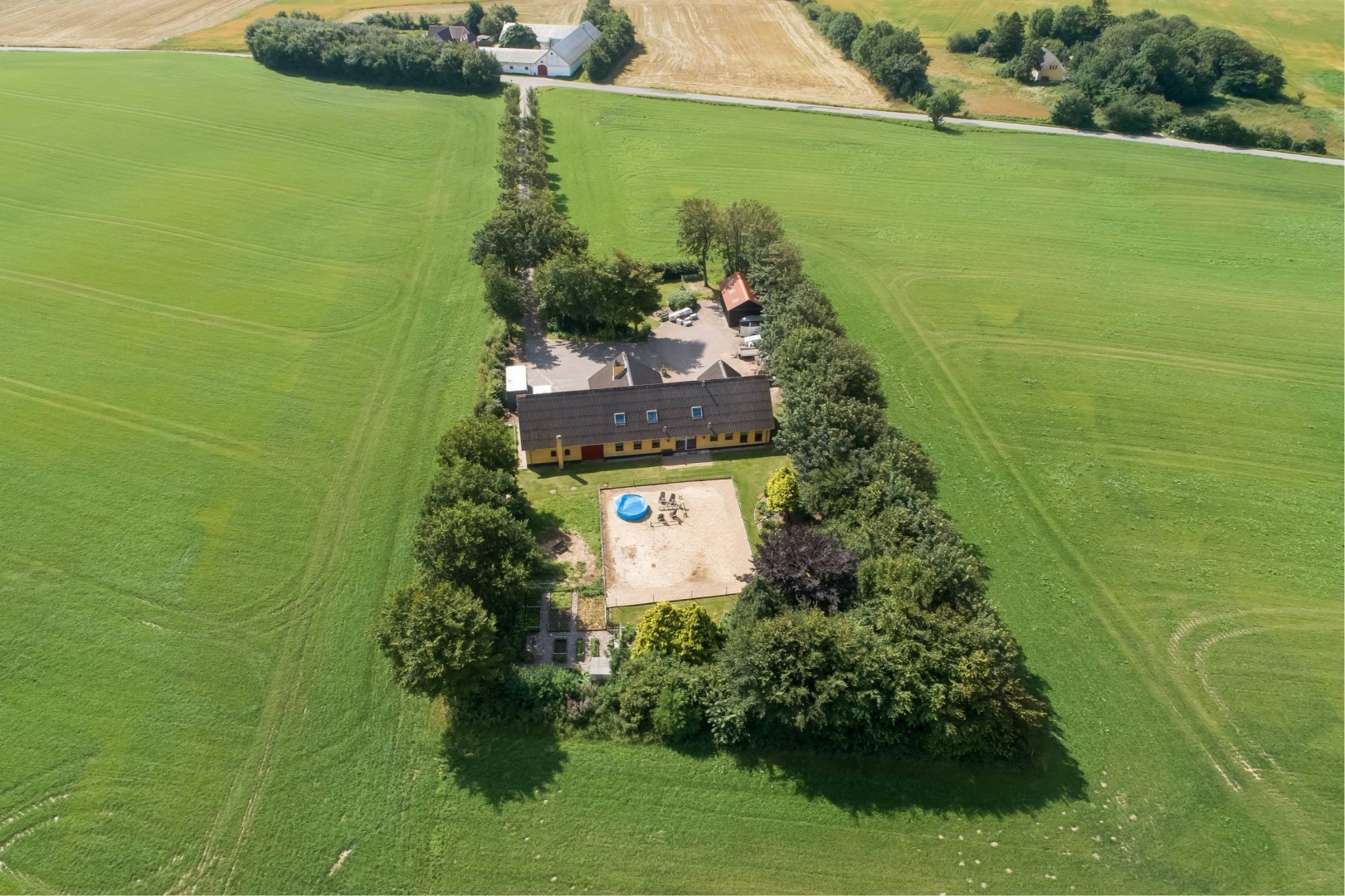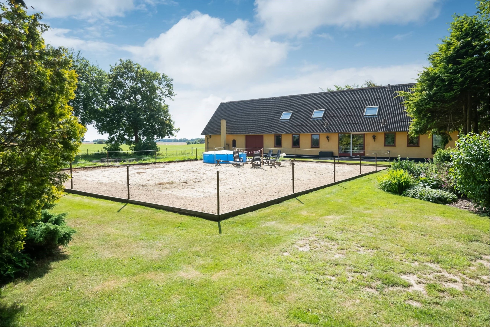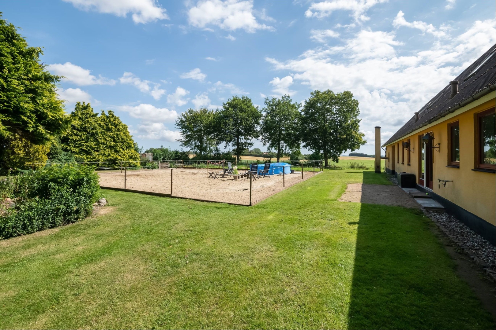 Ejendommens udenomsareal er omkranset af store træer. Velanlagt gårdsplads, dejlig ugeneret have med gode terrasser. På grunden er der anlagt en lille indhegnet ridebane.