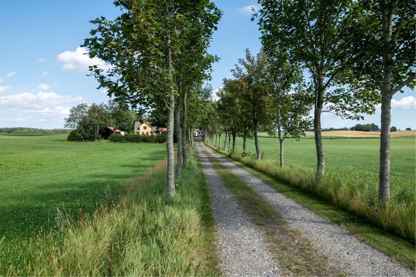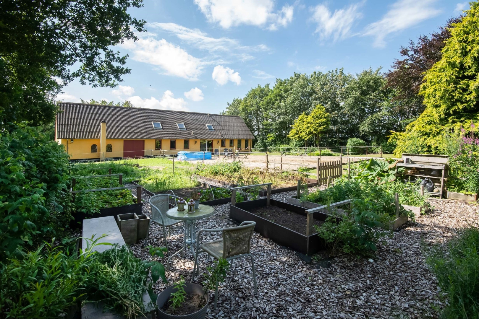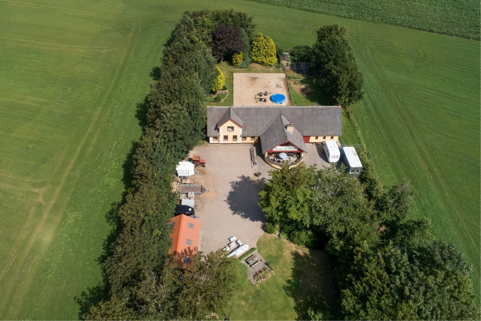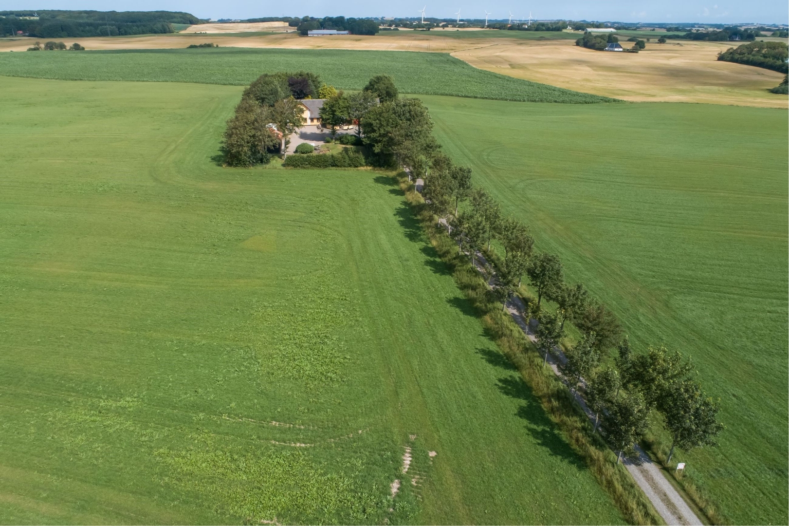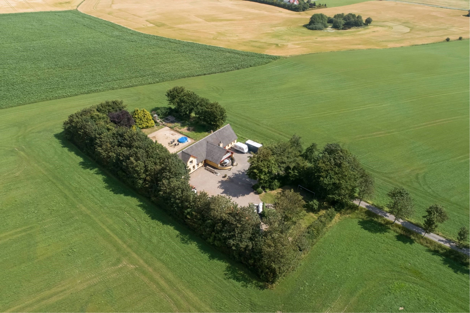 Ejendommens udenomsareal er omkranset af store træer. Velanlagt gårdsplads, dejlig ugeneret have med gode terrasser. På grunden er der anlagt en lille indhegnet ridebane.