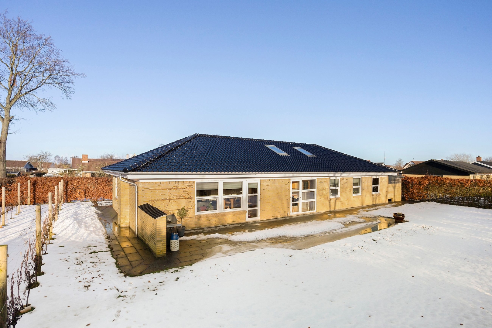Grunden er på 871 m² og er nem at holde, da den primært er anlagt med græsplæne etableret for blot to år siden. Samtidig er der anlagt flisebelægning rundt om huset, ny indkørsel samt en stor, ca. 60 m² sydvendt terrasse, hvor der er rigelig plads til grill, loungemøbler og lange sommeraftener med familie og venner.