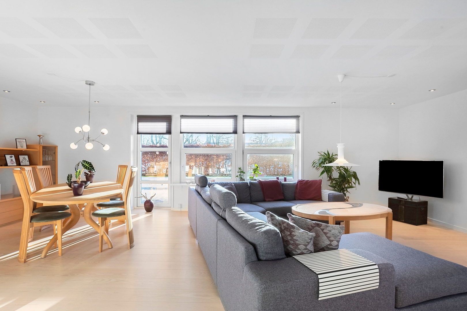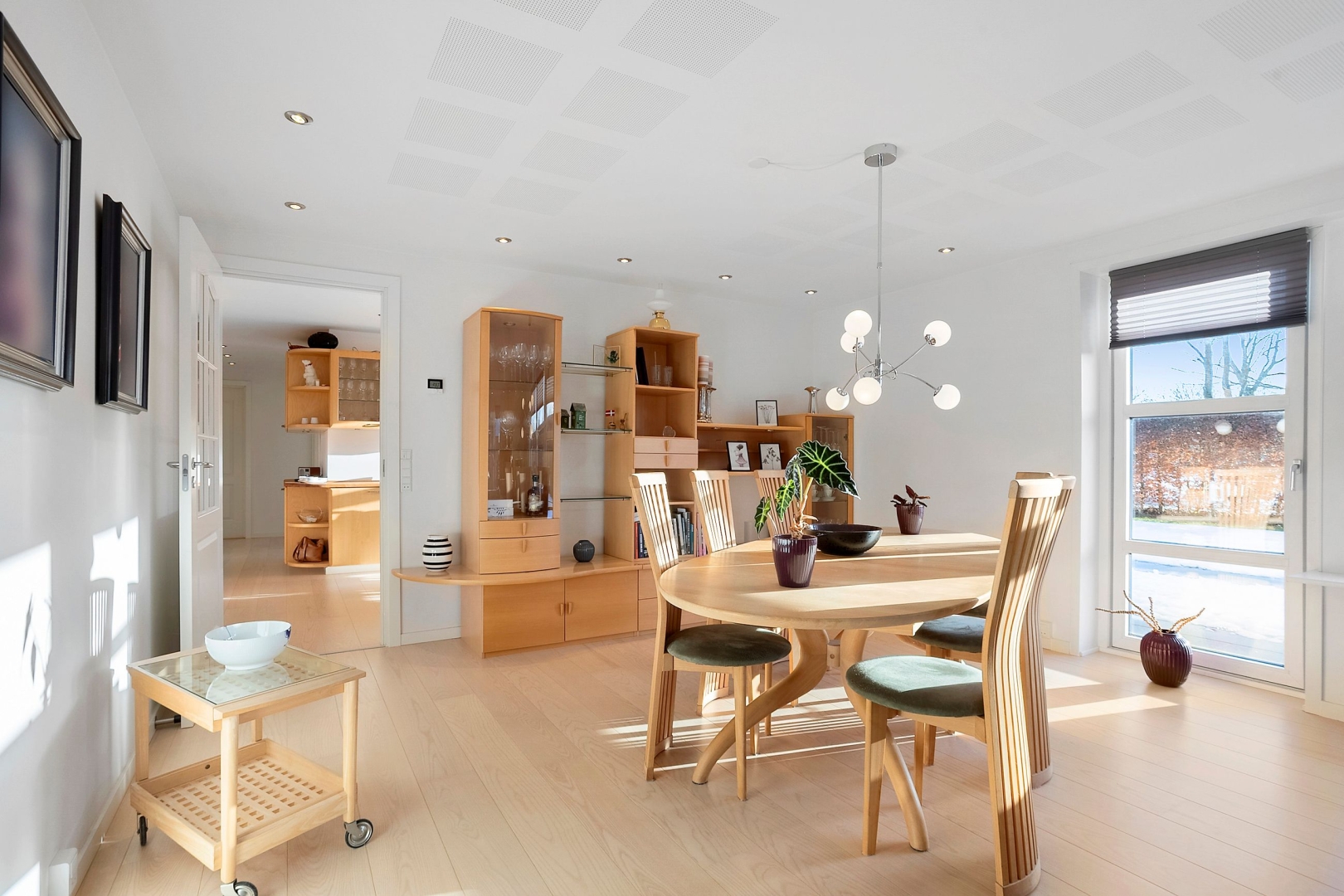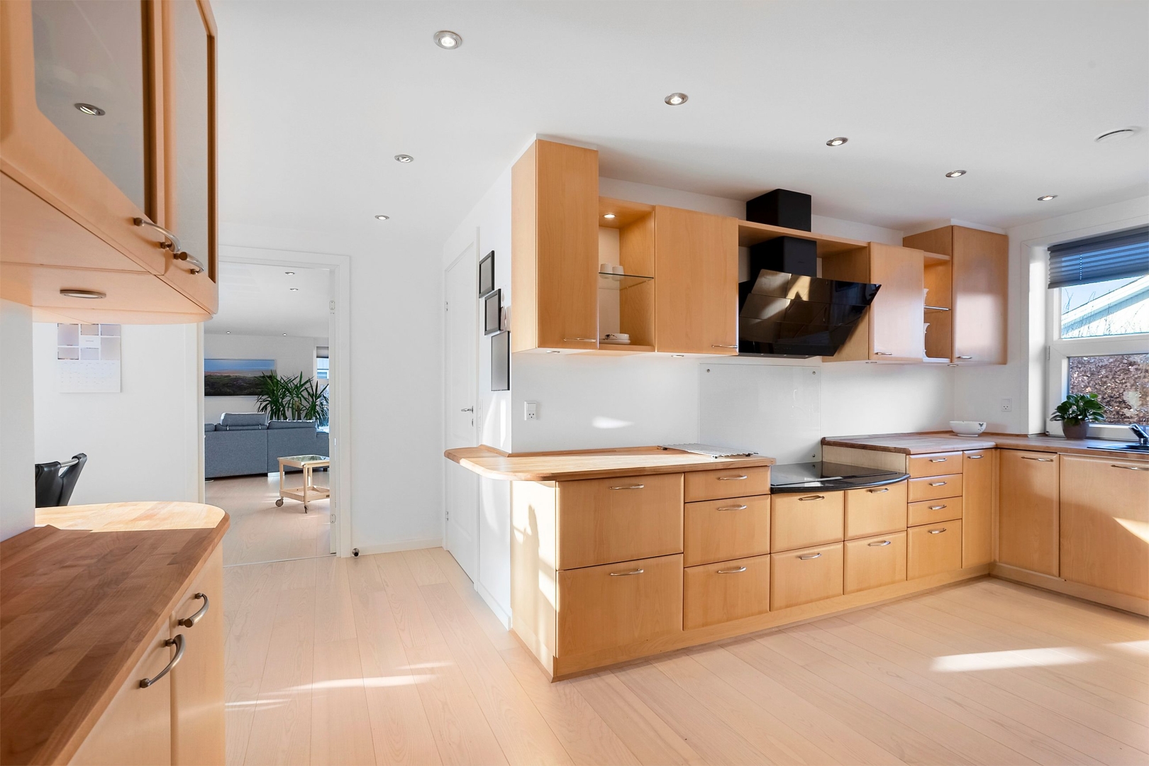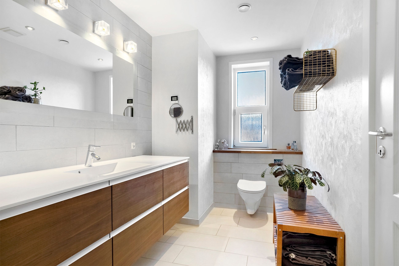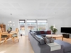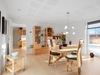 Indretningen er både funktionel og indbydende med et praktisk bryggers med klinkegulv og gulvvarme samt JKE-skabsinventar med indfræset greb og plads til både vaskemaskine og tørretumbler. Køkken/alrummet er husets naturlige samlingspunkt med et JKE-køkken, masser af opbevaringsplads, cooker og induktionskogeplade. Herfra er der via et stort gulv-til-loft-vinduesparti direkte udgang til den sydvendte, flisebelagte terrasse. Opholdsstuen byder på akustiklofter, brændeovn og et skønt lysindfald samt endnu en udgang til terrassen. Boligen rummer tre børneværelser, hvoraf det ene er et mindre værelse indrettet med trappe til en stor hems med alkove, ovenlysvinduer og trægulv (hemsen er loftrum og ikke godkendt boligareal). Derudover er der et flot gæstebadeværelse med bruseniche, gulvvarme, væghængt toilet og Corianbordplade samt et soveværelse med indbyggede JKE-skabe og direkte adgang til et lækkert forældrebadeværelse, ligeledes med gulvvarme, bruseniche, væghængt toilet, håndklædevarmer og Corianbordplade.##