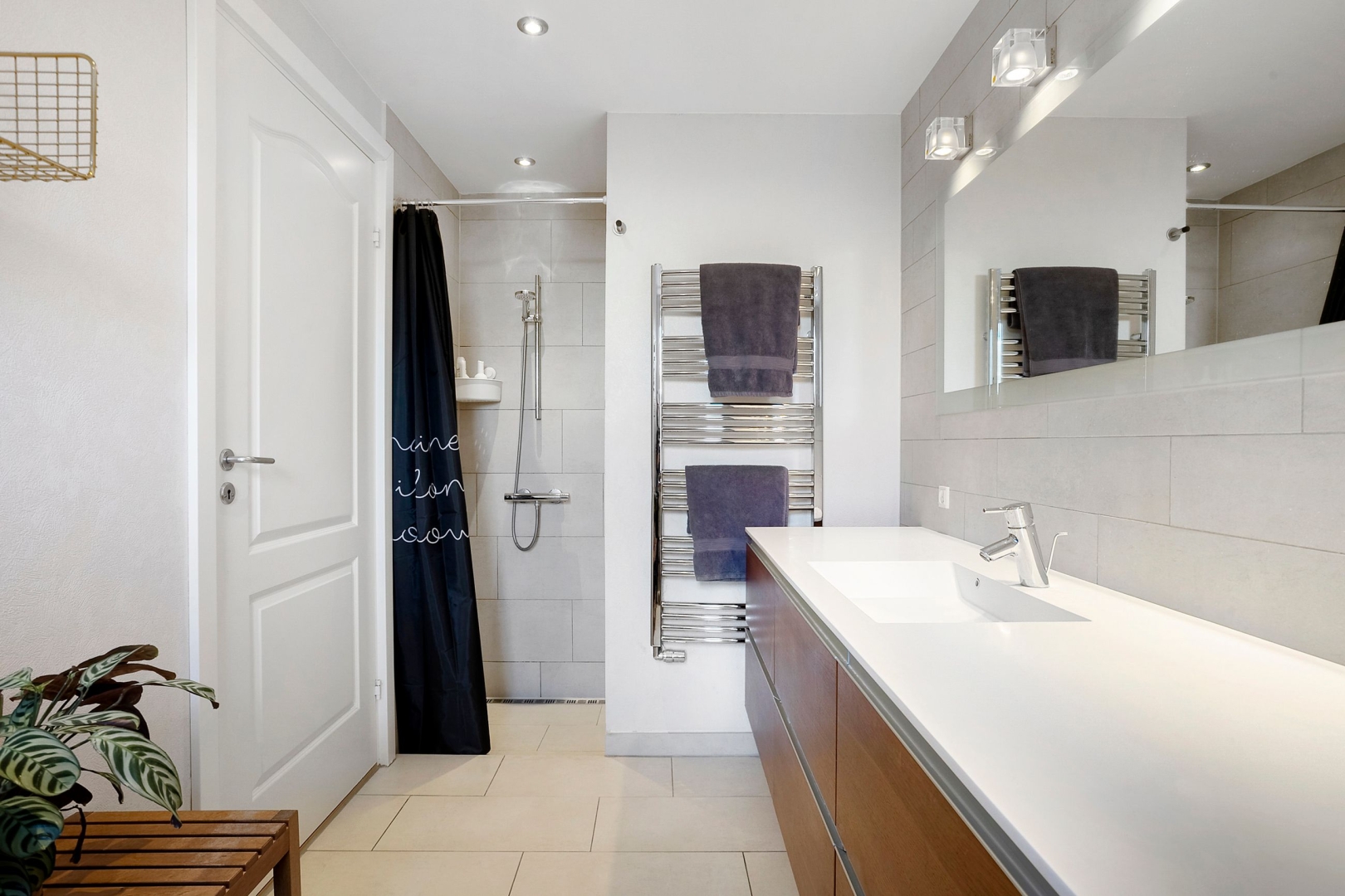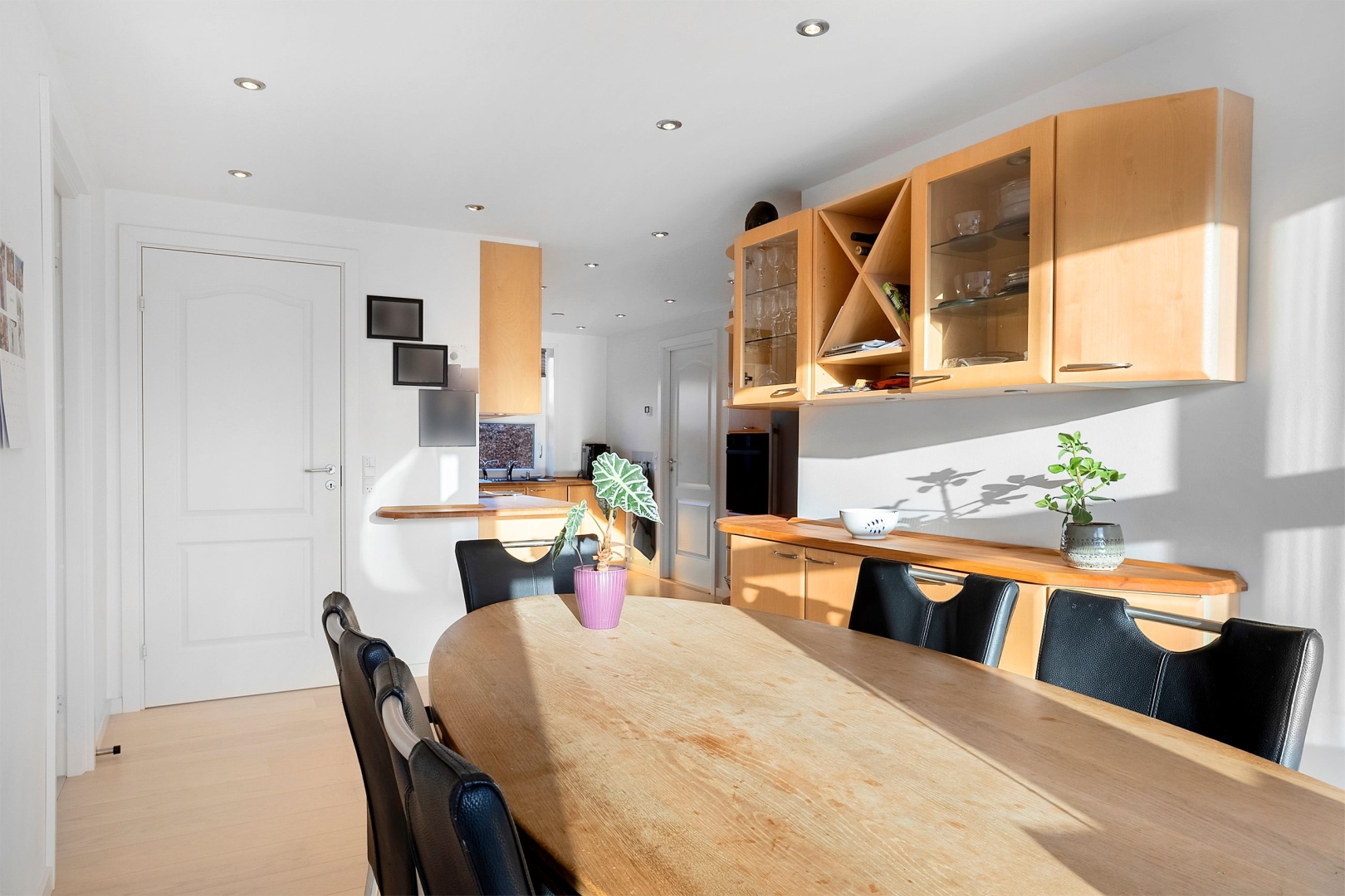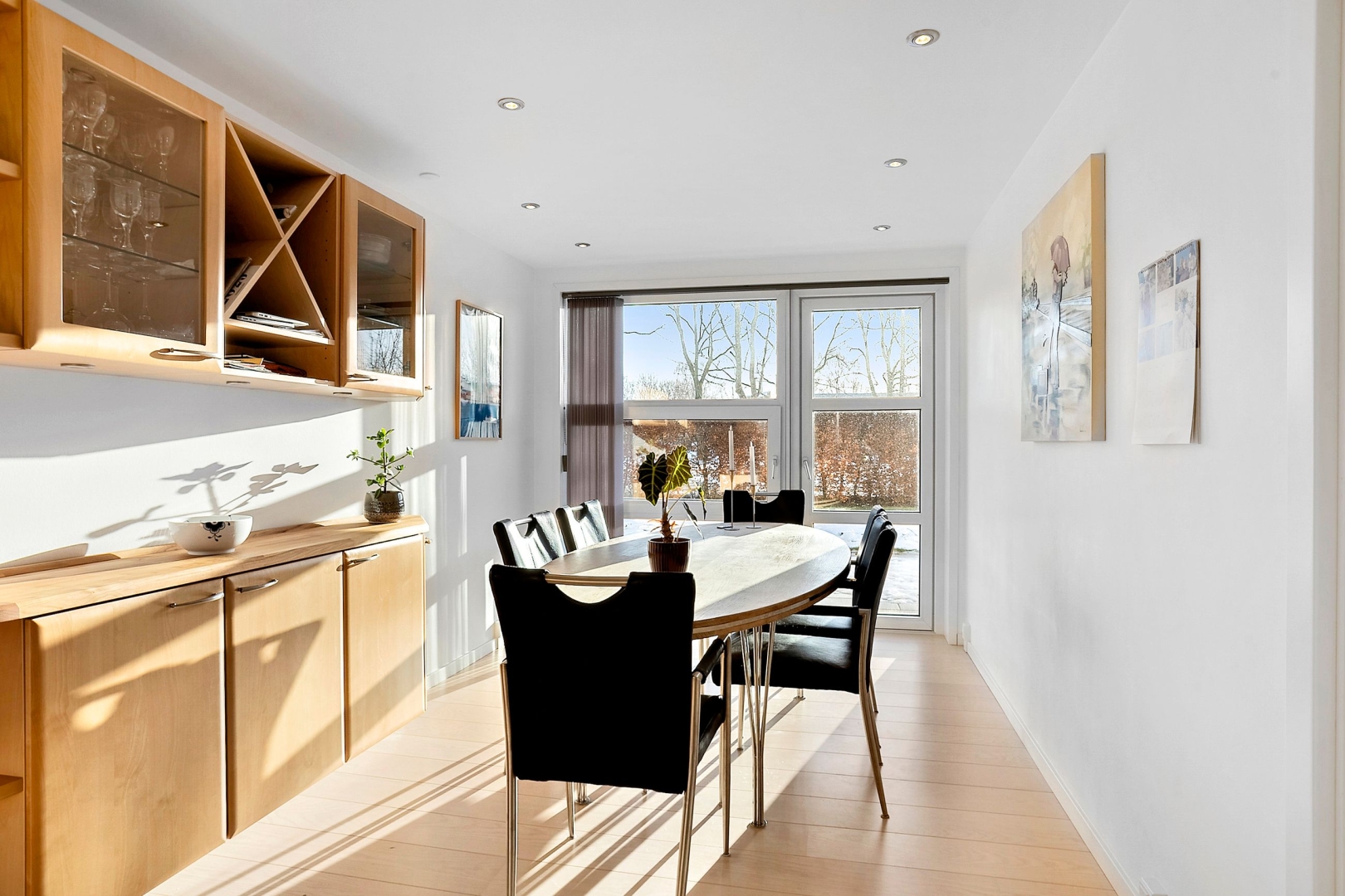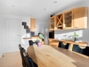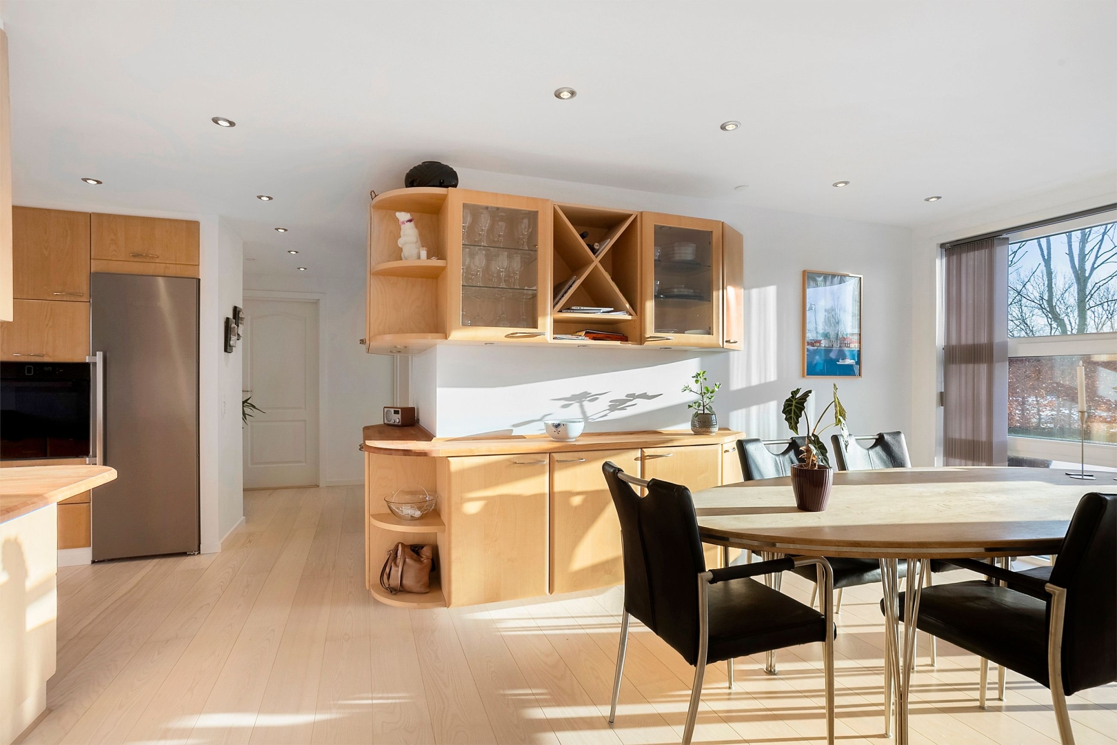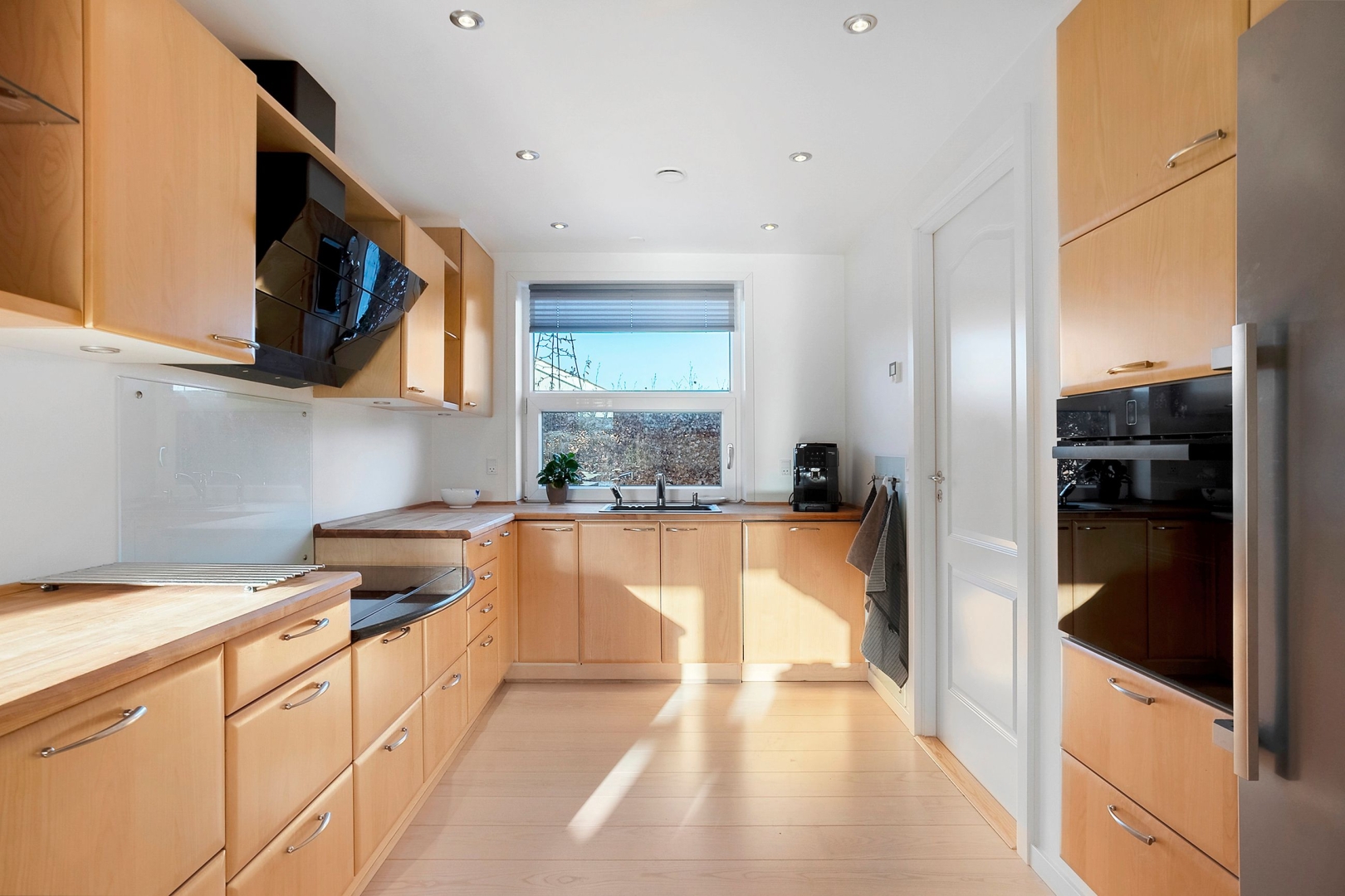 Indretningen er både funktionel og indbydende med et praktisk bryggers med klinkegulv og gulvvarme samt JKE-skabsinventar med indfræset greb og plads til både vaskemaskine og tørretumbler. Køkken/alrummet er husets naturlige samlingspunkt med et JKE-køkken, masser af opbevaringsplads, cooker og induktionskogeplade. Herfra er der via et stort gulv-til-loft-vinduesparti direkte udgang til den sydvendte, flisebelagte terrasse. Opholdsstuen byder på akustiklofter, brændeovn og et skønt lysindfald samt endnu en udgang til terrassen. Boligen rummer tre børneværelser, hvoraf det ene er et mindre værelse indrettet med trappe til en stor hems med alkove, ovenlysvinduer og trægulv (hemsen er loftrum og ikke godkendt boligareal). Derudover er der et flot gæstebadeværelse med bruseniche, gulvvarme, væghængt toilet og Corianbordplade samt et soveværelse med indbyggede JKE-skabe og direkte adgang til et lækkert forældrebadeværelse, ligeledes med gulvvarme, bruseniche, væghængt toilet, håndklædevarmer og Corianbordplade.##