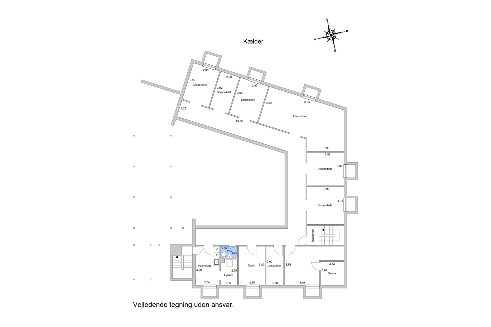 Den højloftede kælder indeholder mange gode og brugbare kvadratmeter og rummer rigtig mange anvendelsesmuligheder.