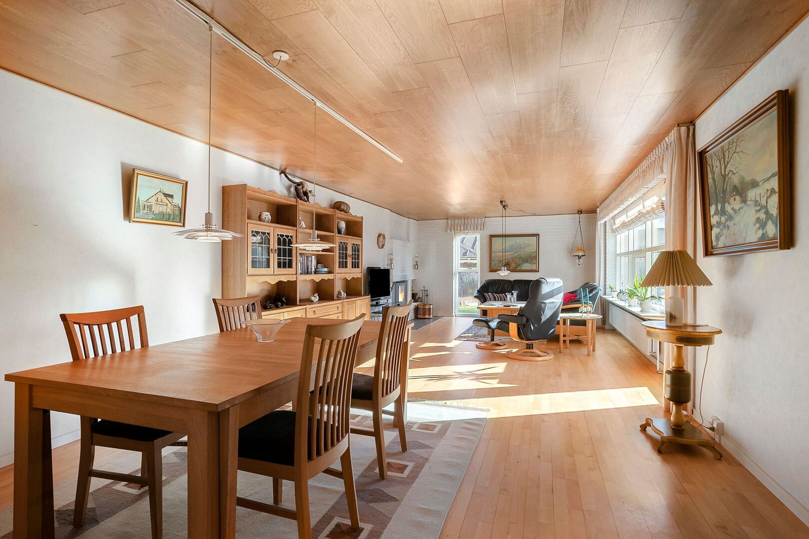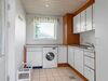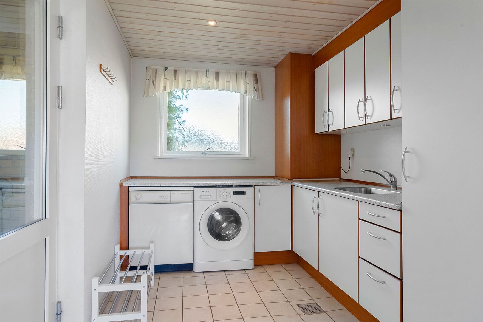 Villaen indeholder et funktionelt bryggers med klinkegulv, vask og plads til både vaskemaskine og tørretumbler. Husets naturlige samlingspunkt er køkkenalrummet med et stort skydedørsparti mod terrassen, som sikrer et skønt lysindfald og direkte udgang til den flisebelagte, delvist overdækkede terrasse. Herudover en rummelig opholdsstue med brændeovnsindsats og stort sydvendt vinduesparti med terrassedør.