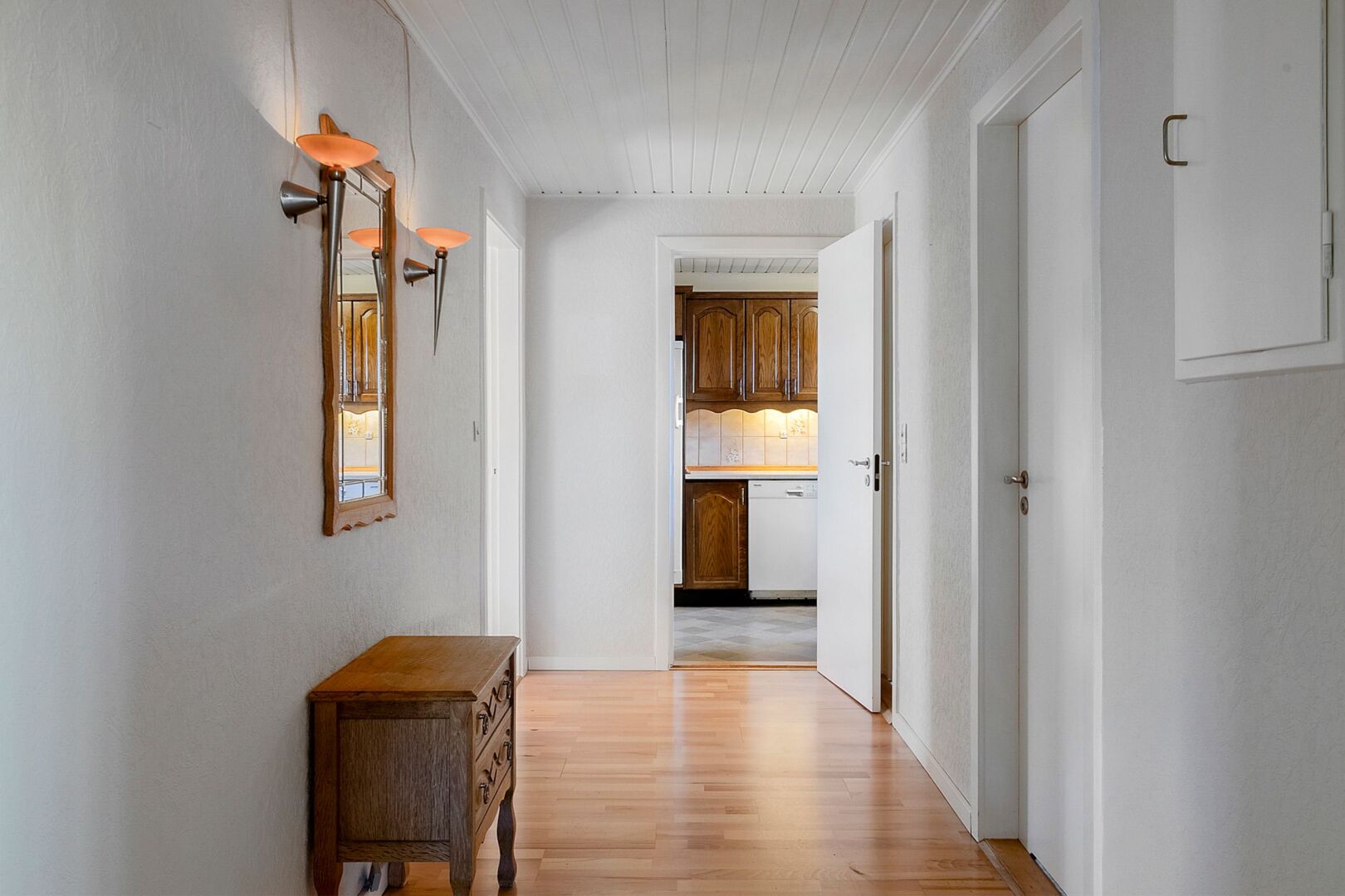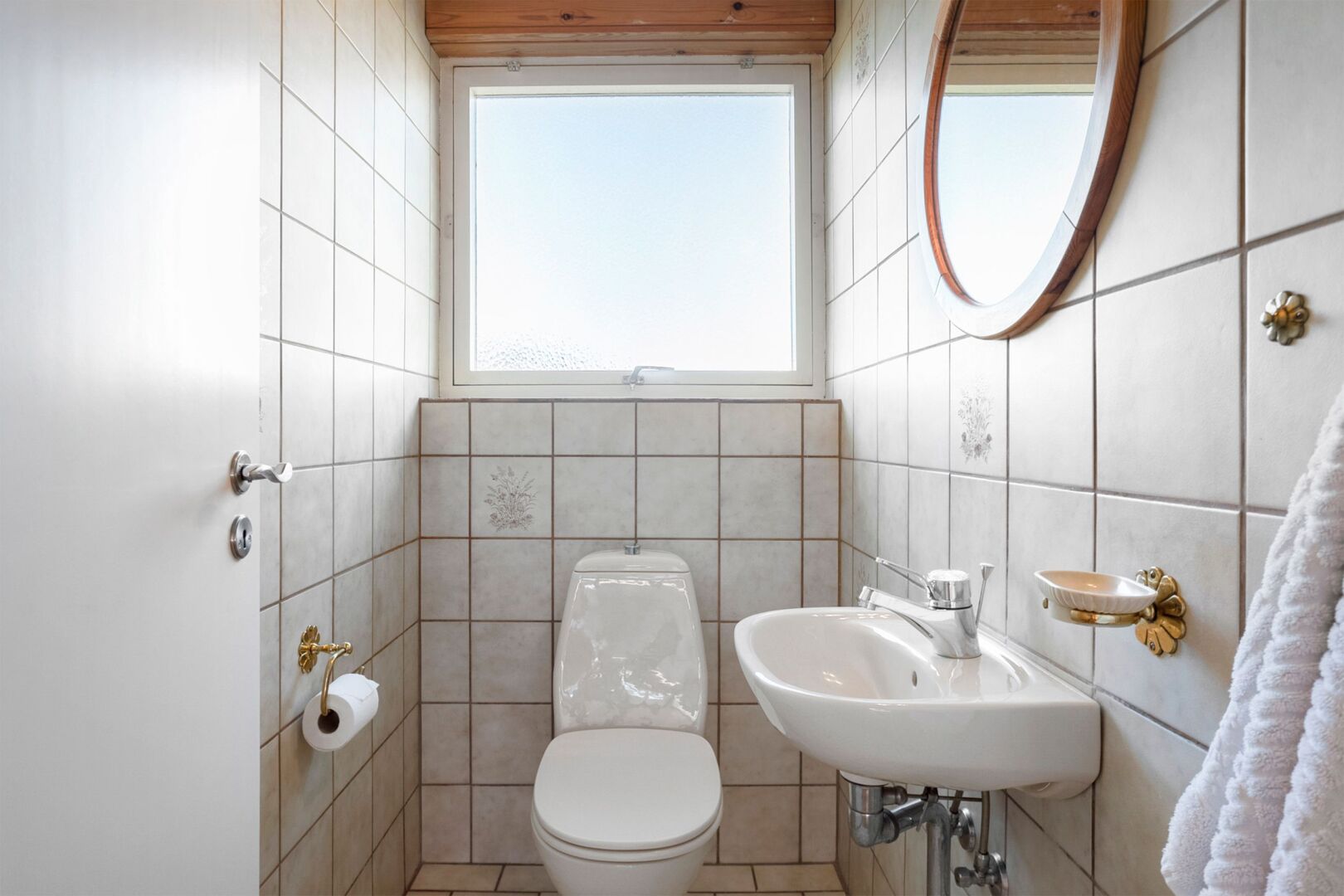 Boligen rummer desuden fordelingsgang, gæstetoilet, badeværelse med bruseniche og gulvvarme, entré, et børneværelse med skabe samt et stort børneværelse, der tidligere har været opdelt i to og nemt kan reetableres. Endelig et soveværelse med skabe og udgang til egen terrasse samt haven.
