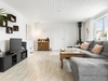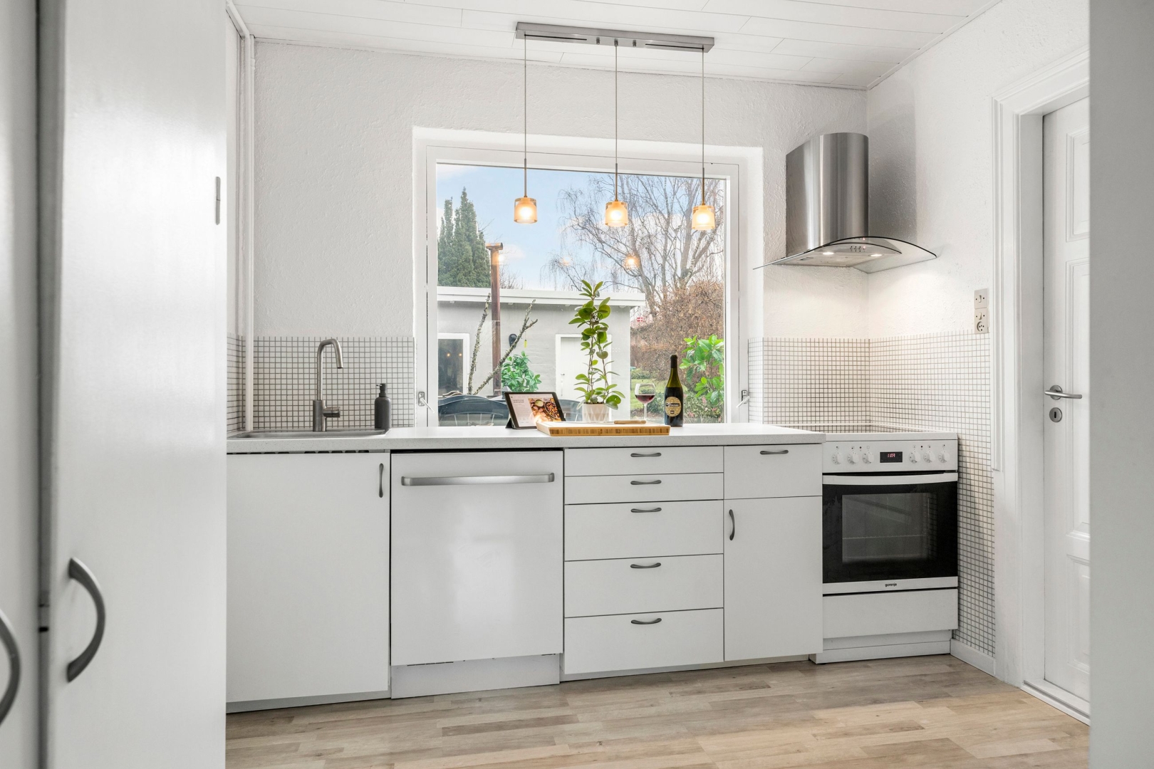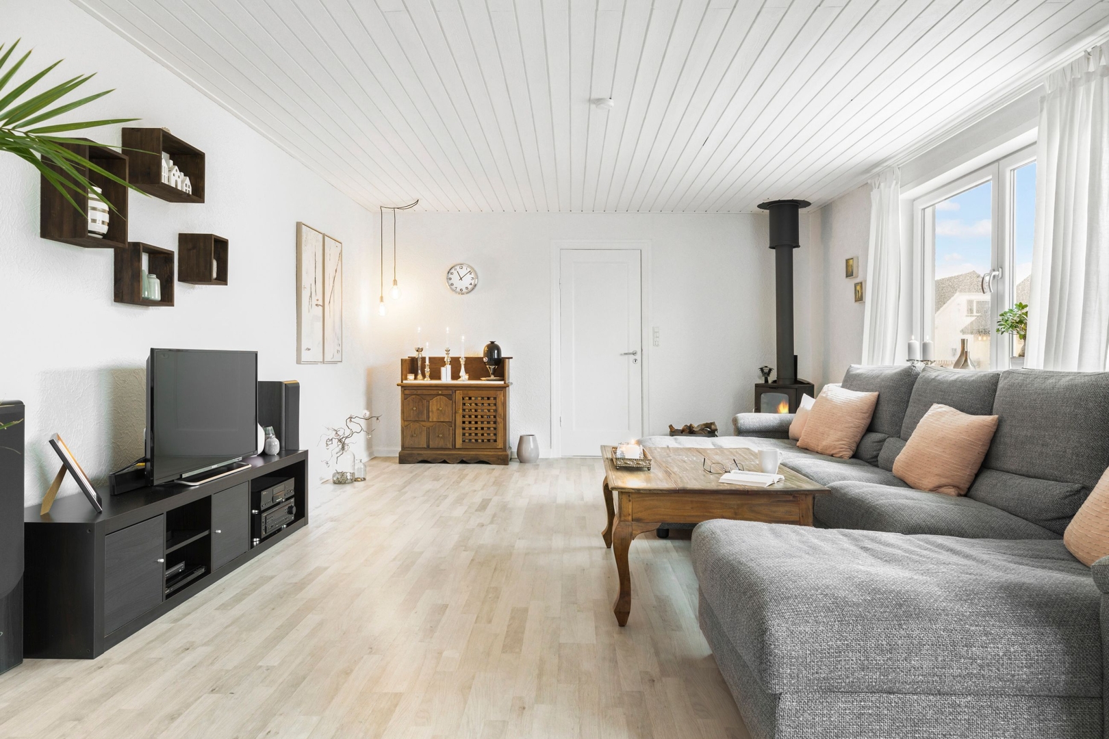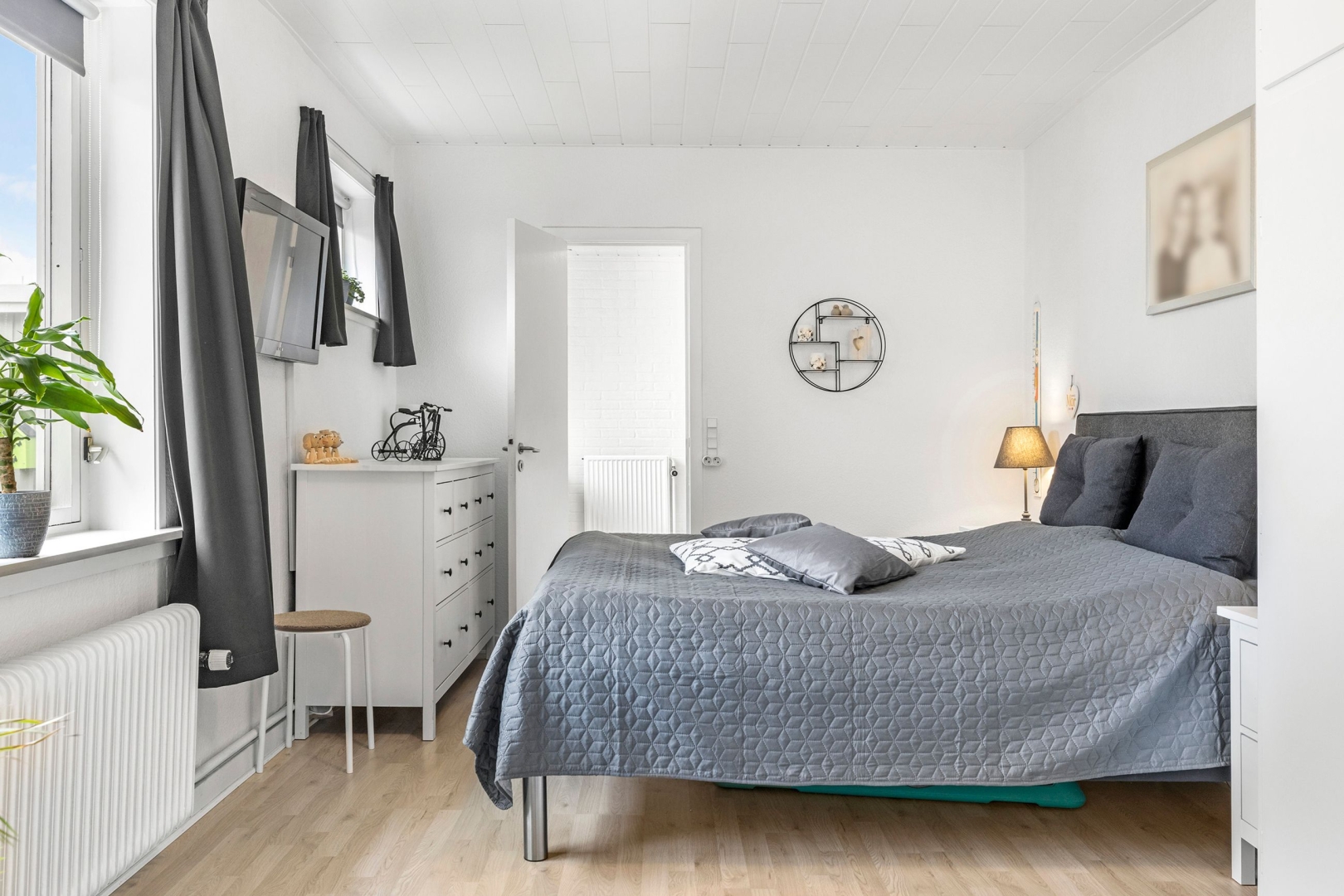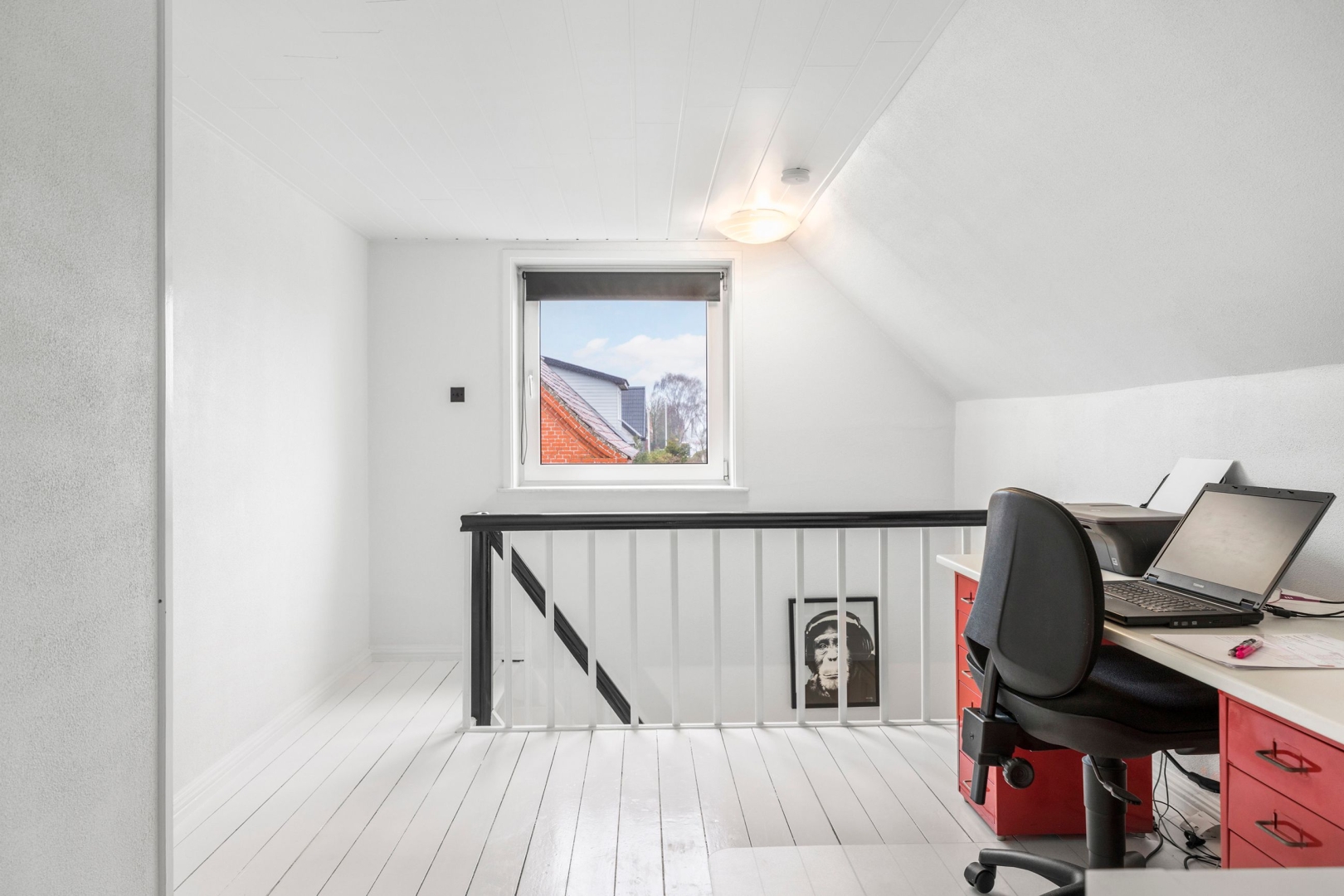 Beboelsen indeholder entre, godt indrettet badeværelse med badekar, bruseniche, skabsarrangement og direkte adgang til stort lyst soveværelse. Køkken med direkte adgang til kombineret opholds- og spisestue med brændeovn. Fra køkkenet kan endvidere fortsættes ud i baggang med lille toilet samt udgang til terrasse og have. Fra entreen går en trappe op til første-salen med et repos indrettet som kontor, værelse og gavlværelse med fint kig mod øst. Her kan boligen med få midler udvides med ca 20 m2 ud på loftet.