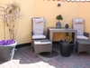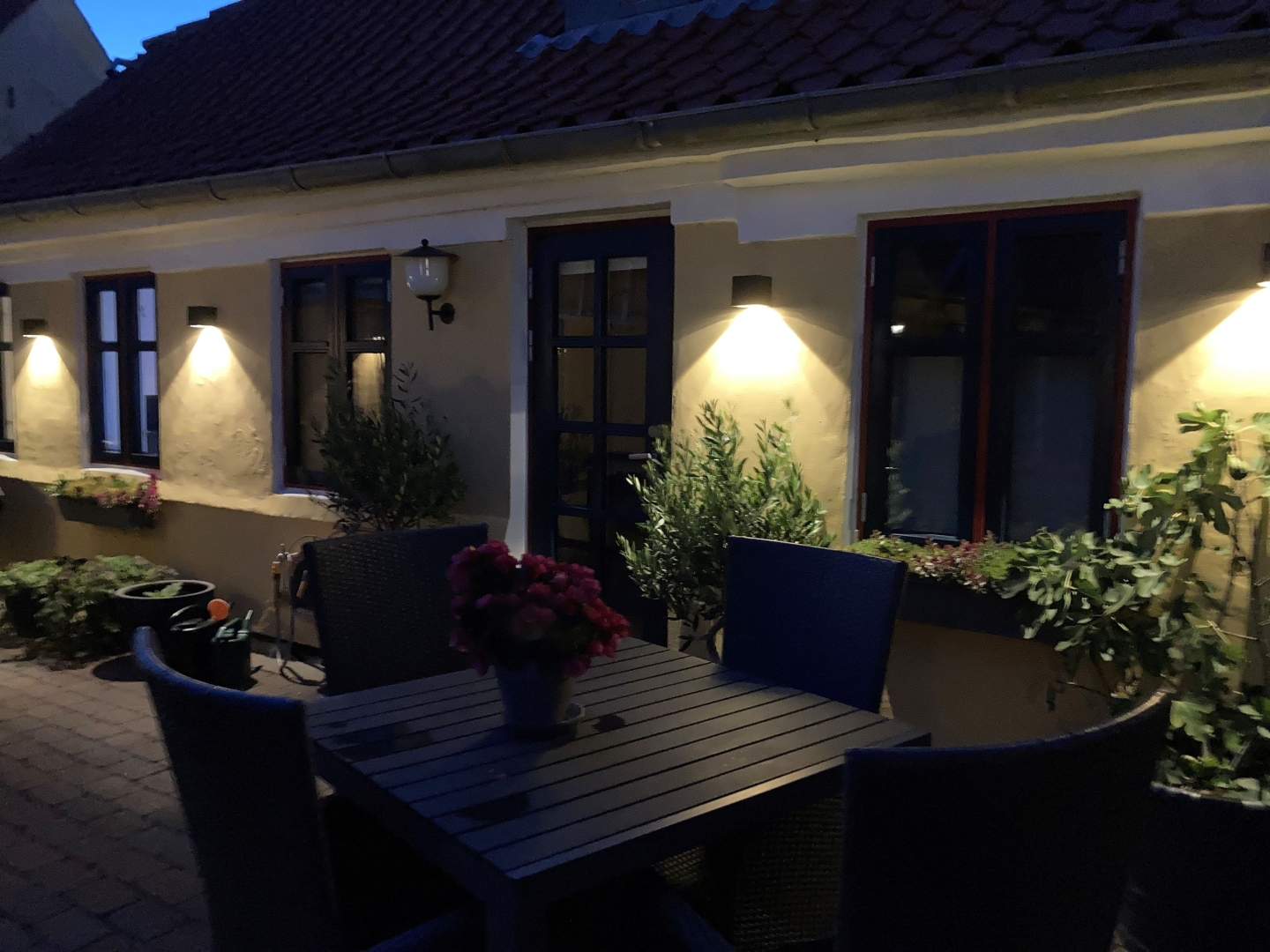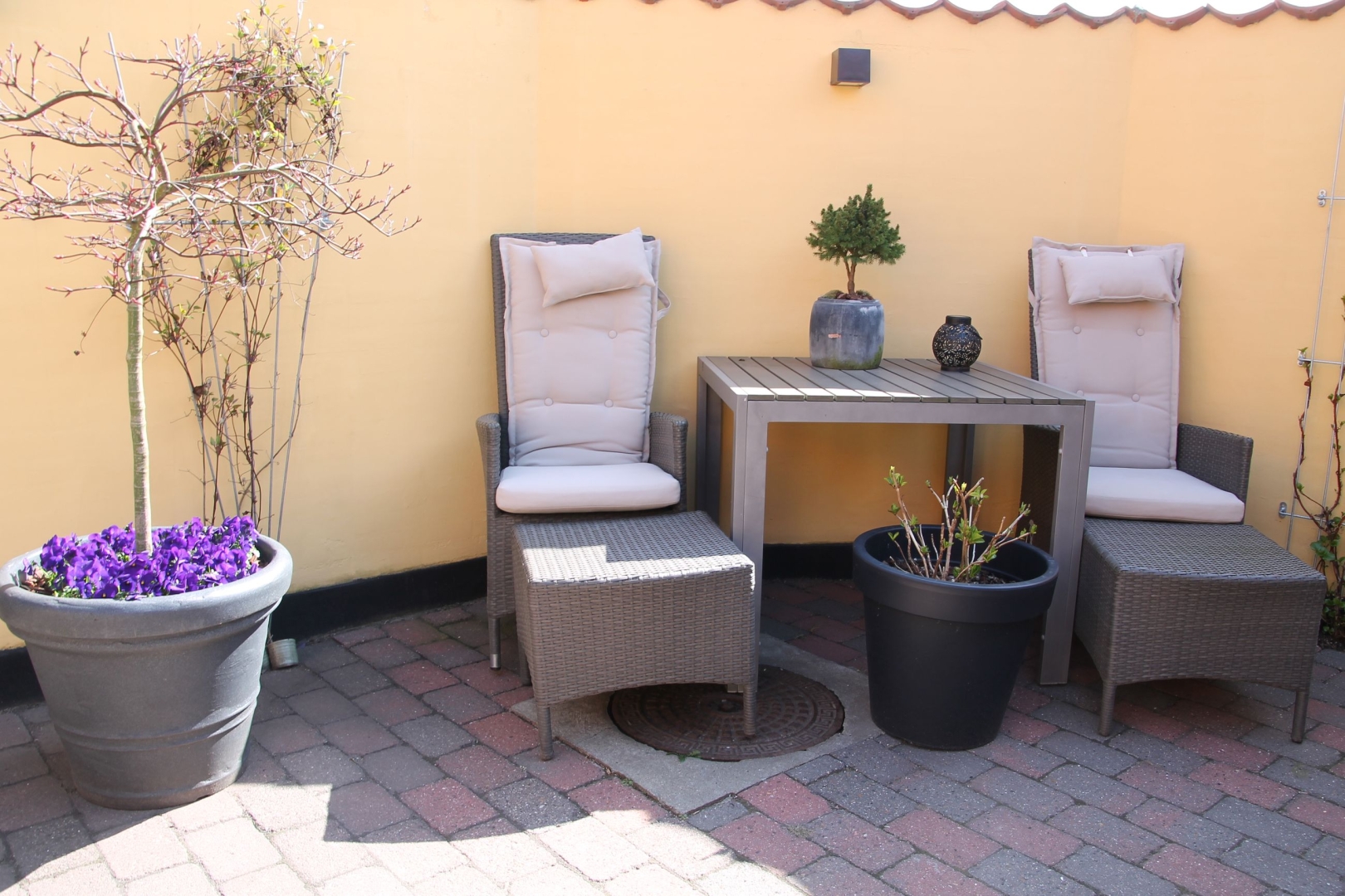 Den afskærmede solterrasse på cirka 50 m² tilbyder en privat og ugeneret oase, hvor I kan nyde solen fra tidlig morgen til sen aften. Terrasseområdet er omsluttet af en høj havemur, der skaber en intim og rolig stemning.