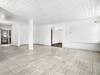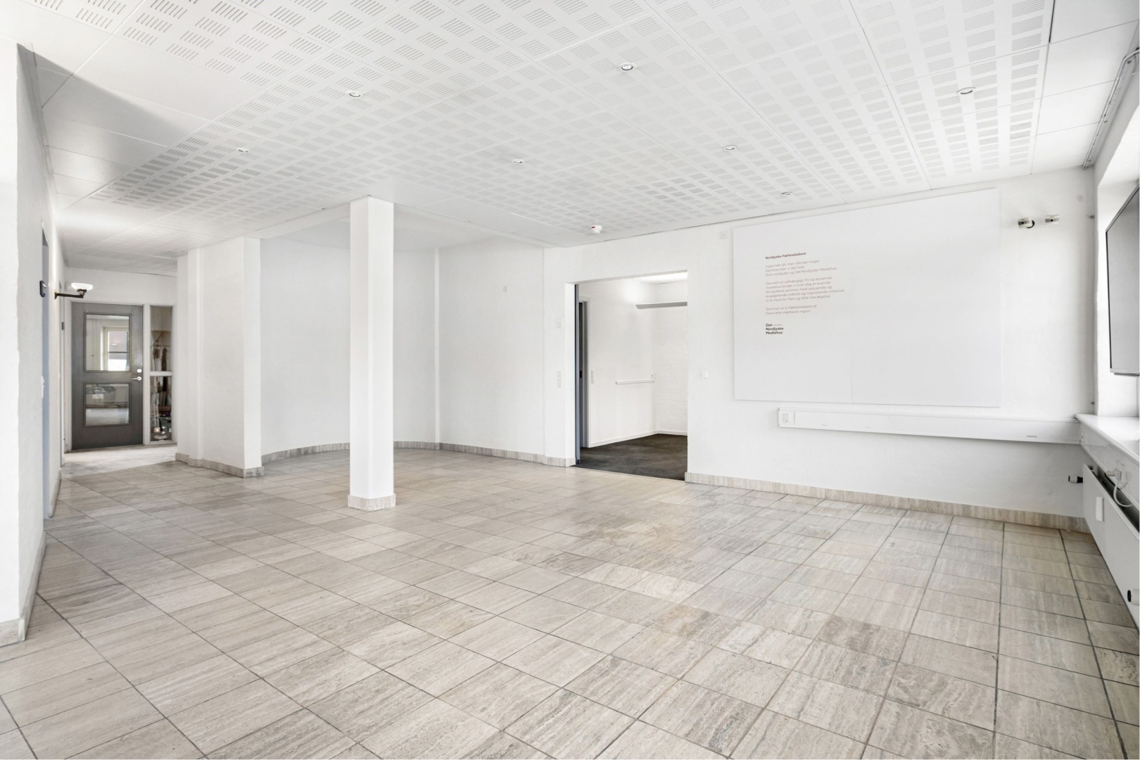 Der er støbt gulv, dels belagt med klinker og tæppefliser, hvidmalede vægge, akustiklofter med