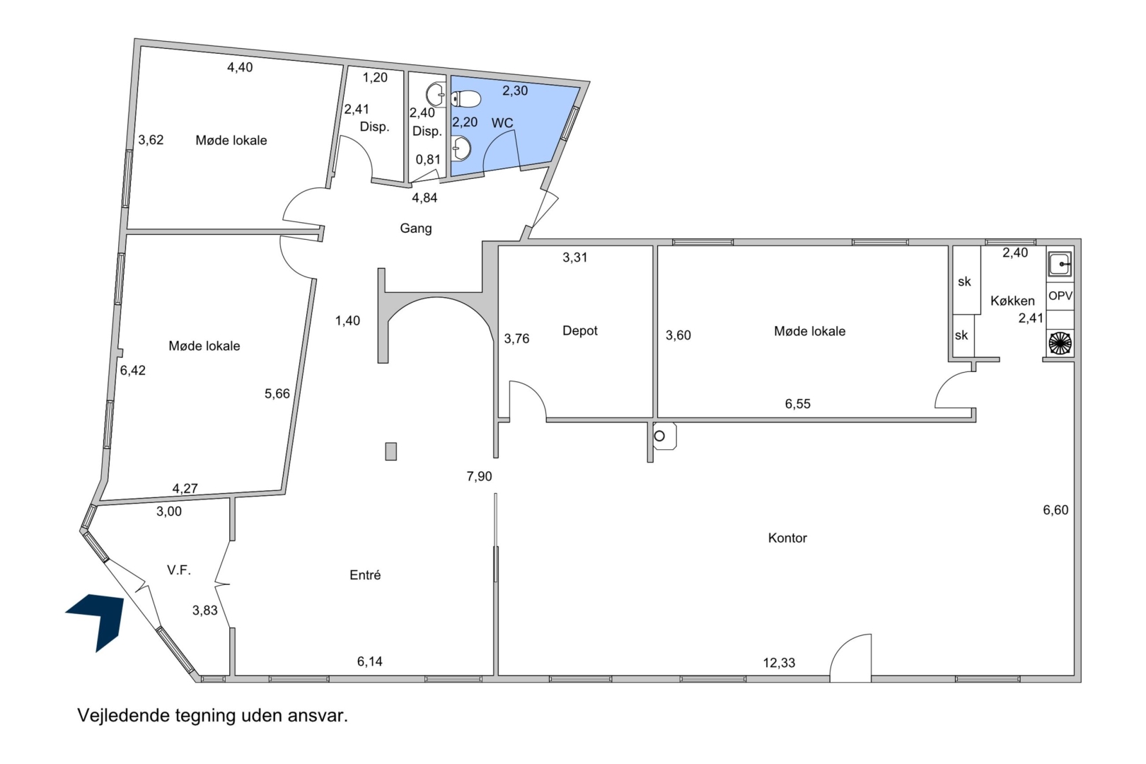 plads til skrivebord og mødebord - handicaptoilet/personaletoilet - baggang direkte ud til P pladser - stort