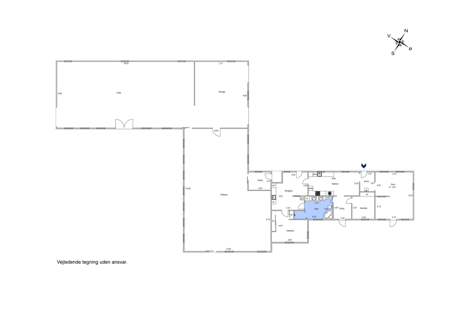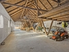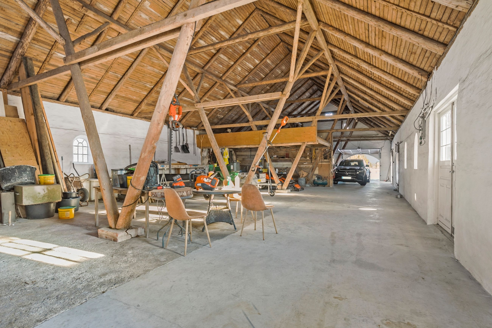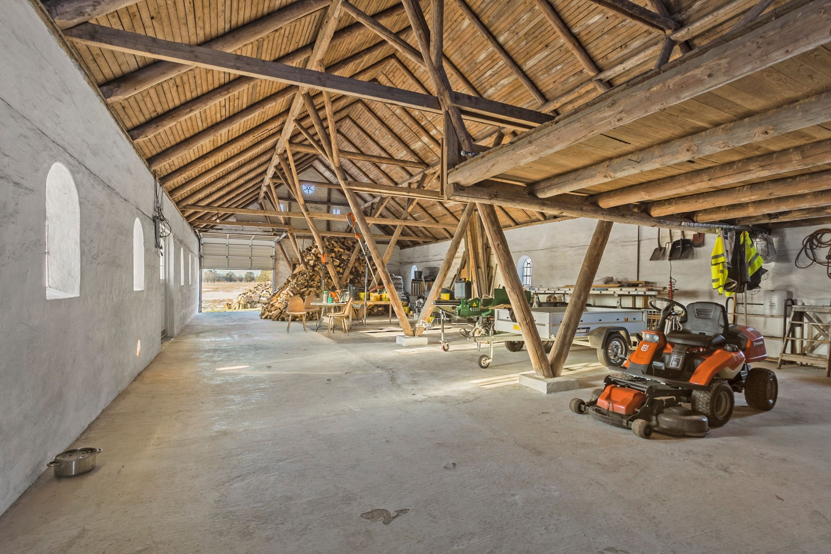 Bygningens indre imponerer med sin kraftige tømmerkonstruktion, der tilfører rummet en helt særlig karakter. Her er der rig mulighed for at indrette hestebokse, værksted, garage eller opbevaring af maskiner, biler, både eller campingvogne.