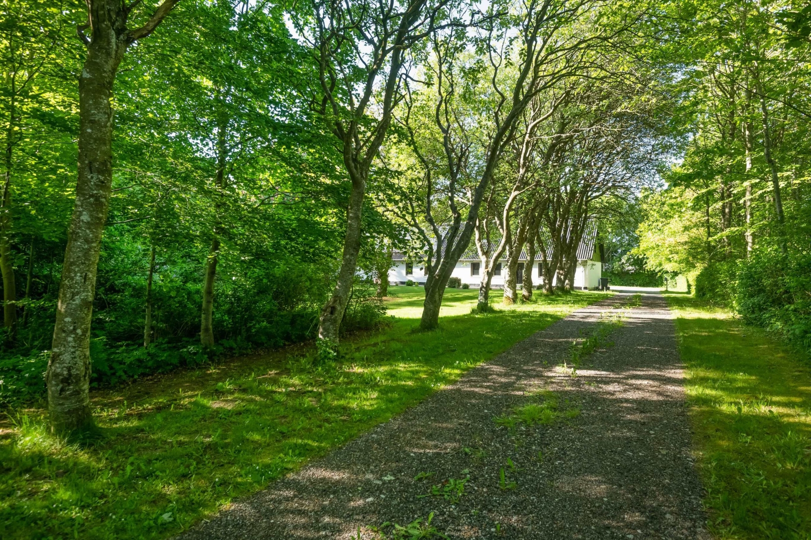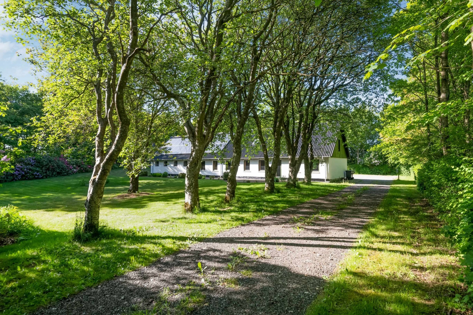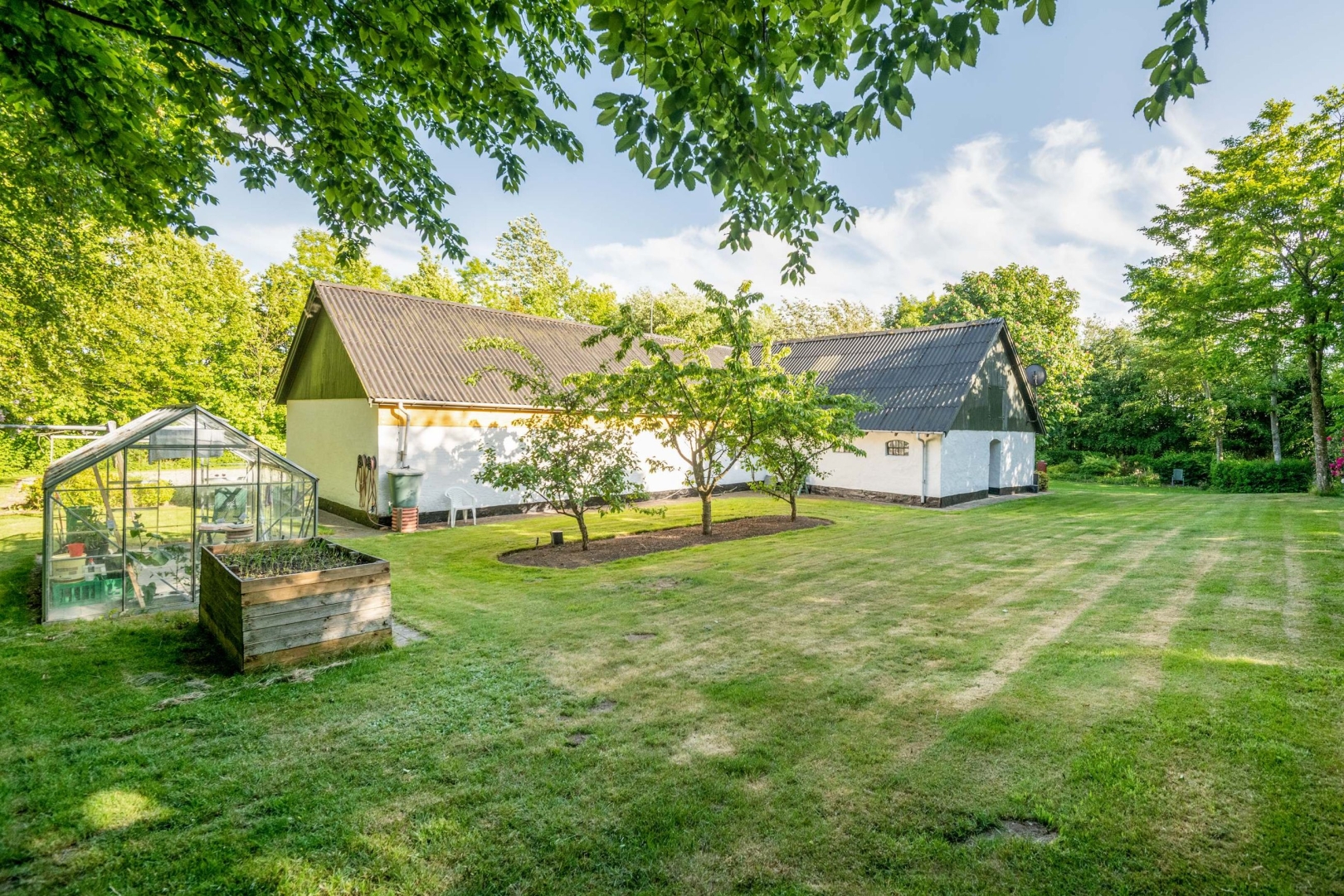 Fra offentlig vej fører der en hyggelig alle ind til ejendommen med dejlig gårdsplads. Stor velanlagt ugeneret have med drivhus, græsplæne, mange forskelligartede buske og træer.