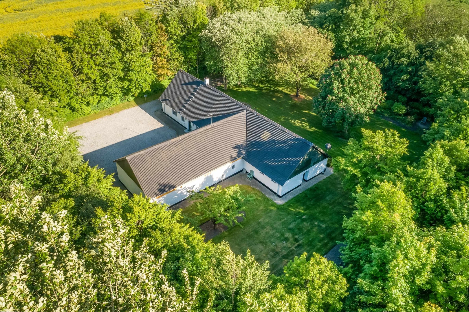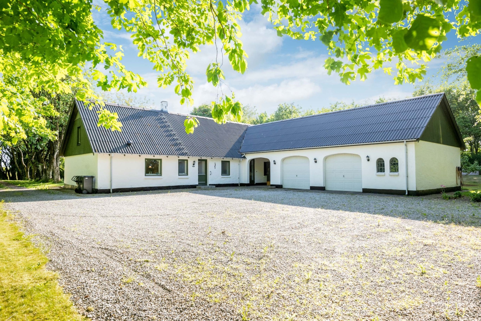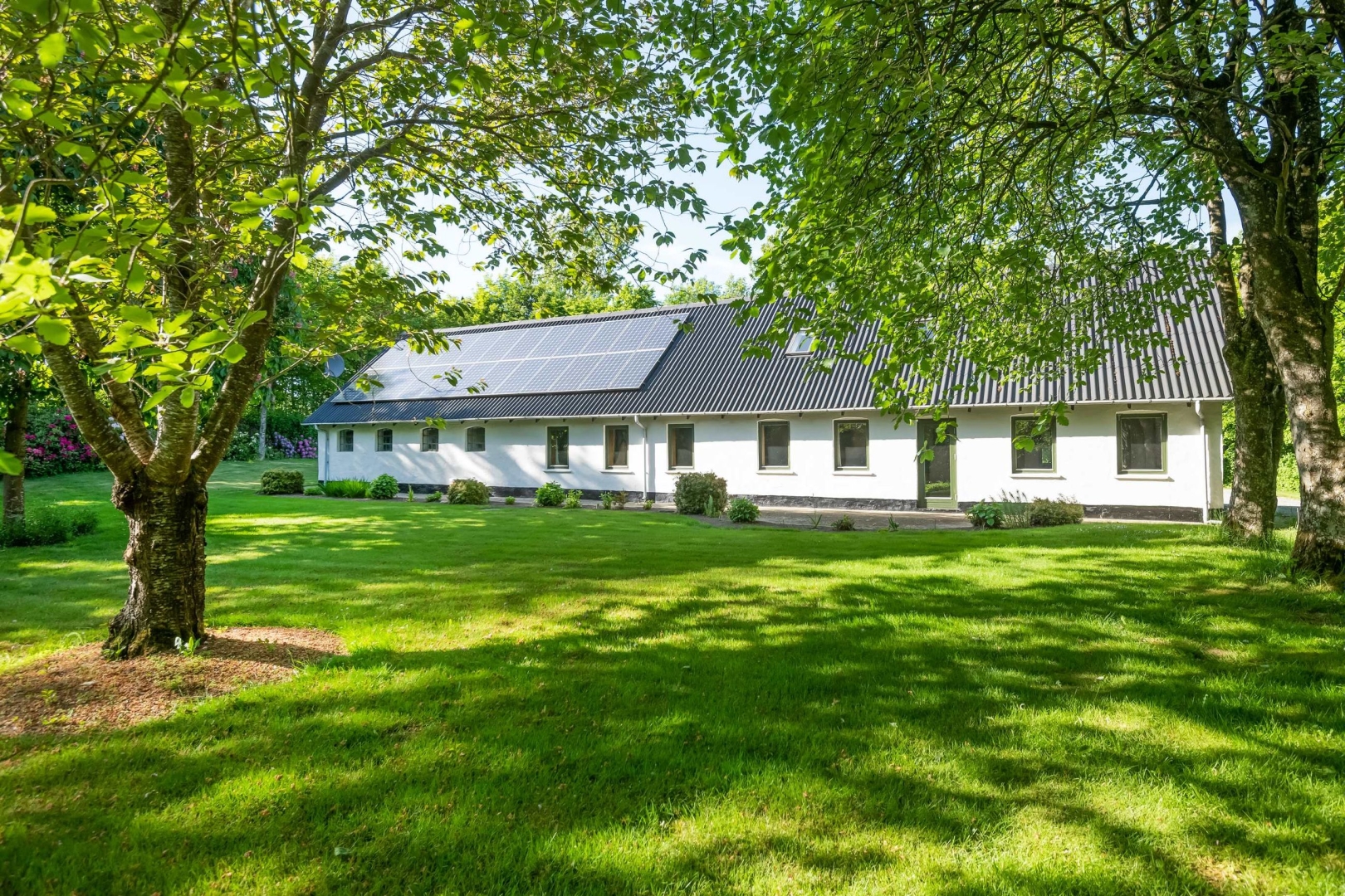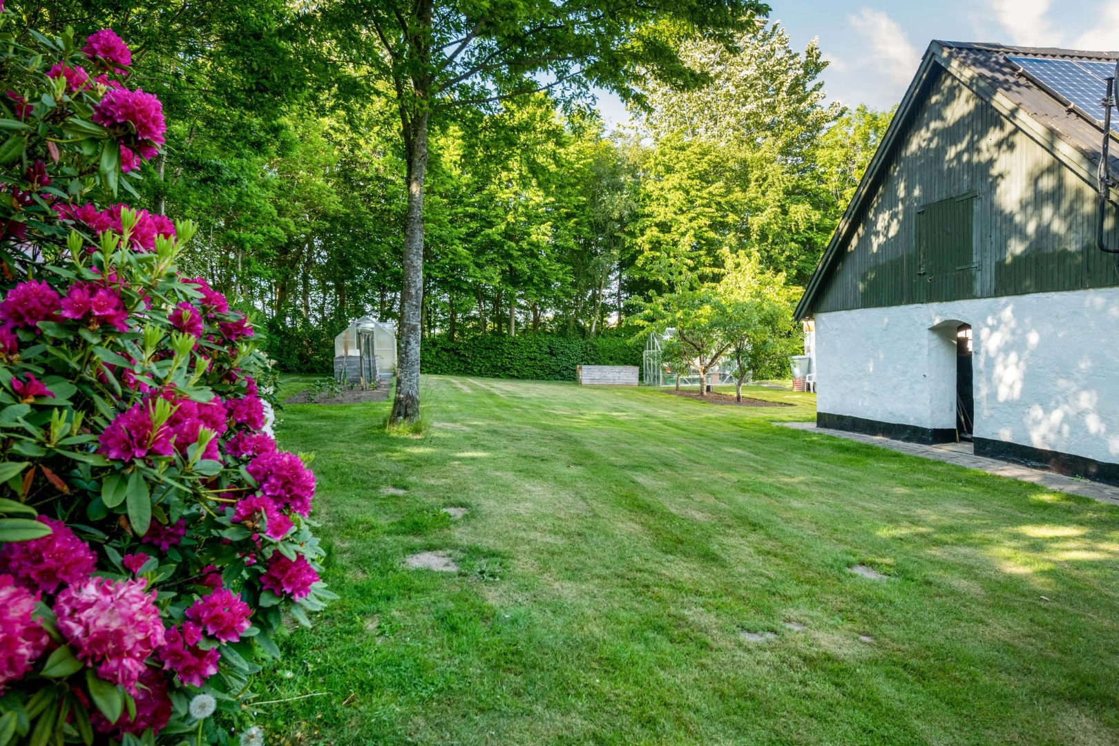 Fra offentlig vej fører der en hyggelig alle ind til ejendommen med dejlig gårdsplads. Stor velanlagt ugeneret have med drivhus, græsplæne, mange forskelligartede buske og træer.