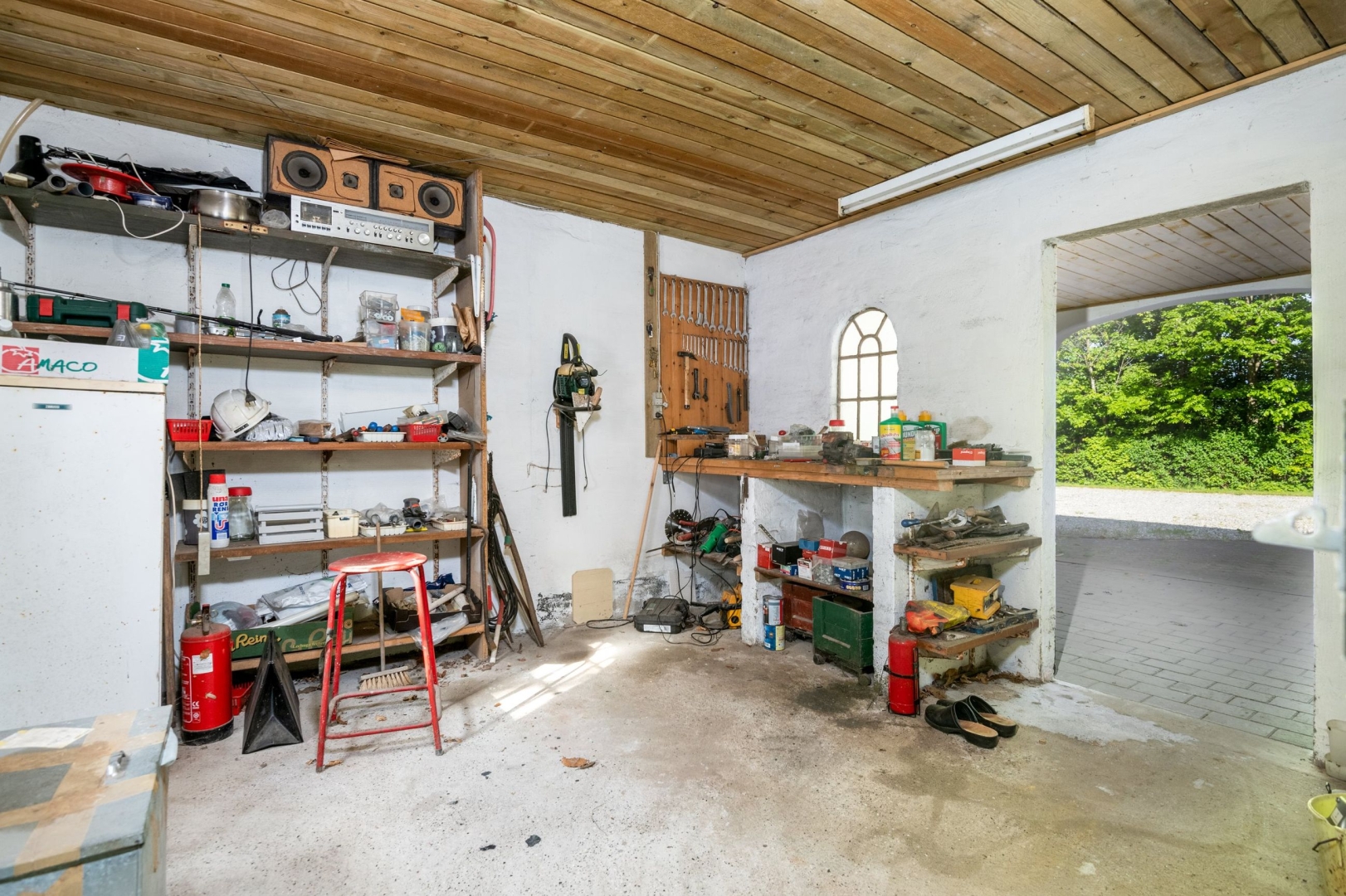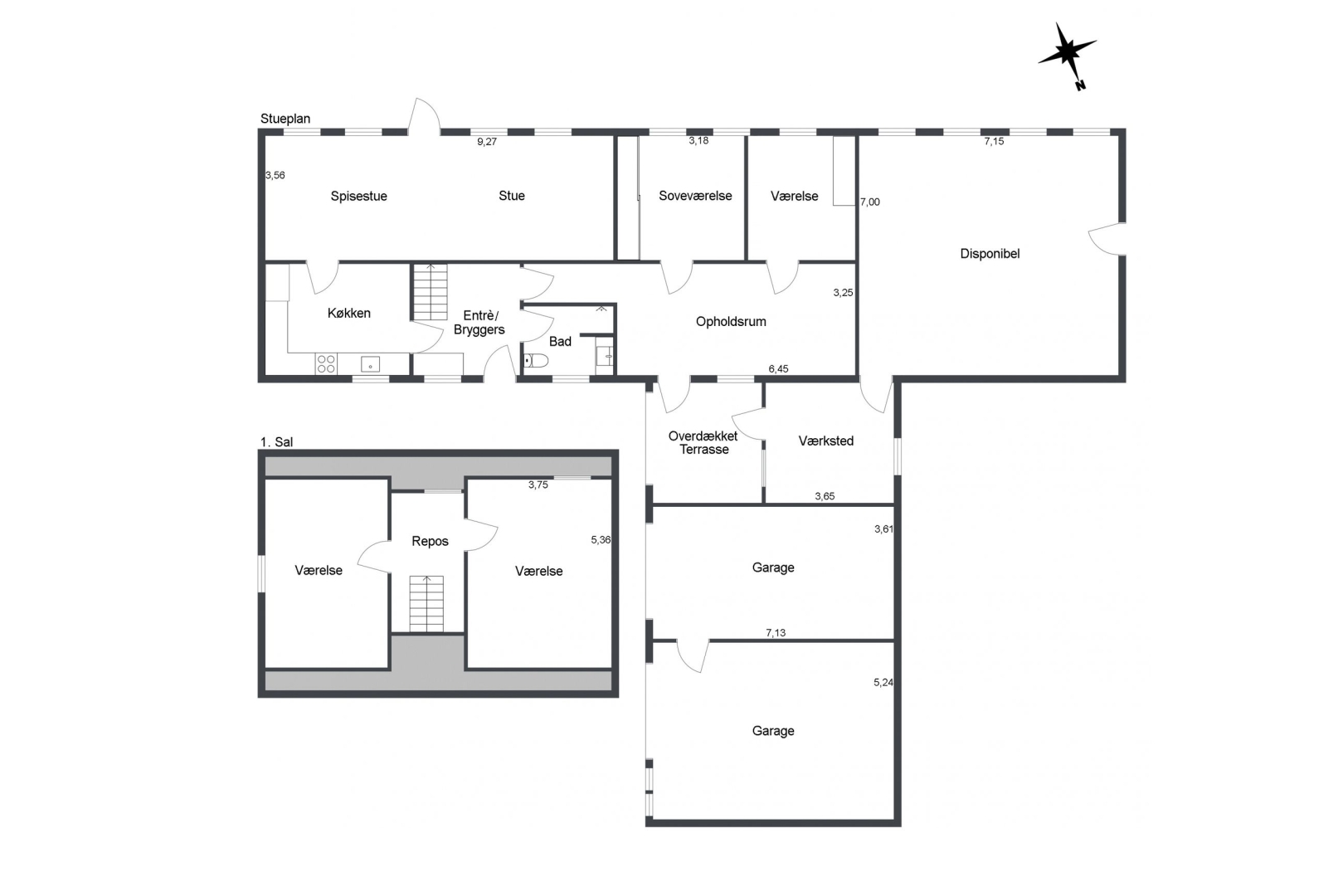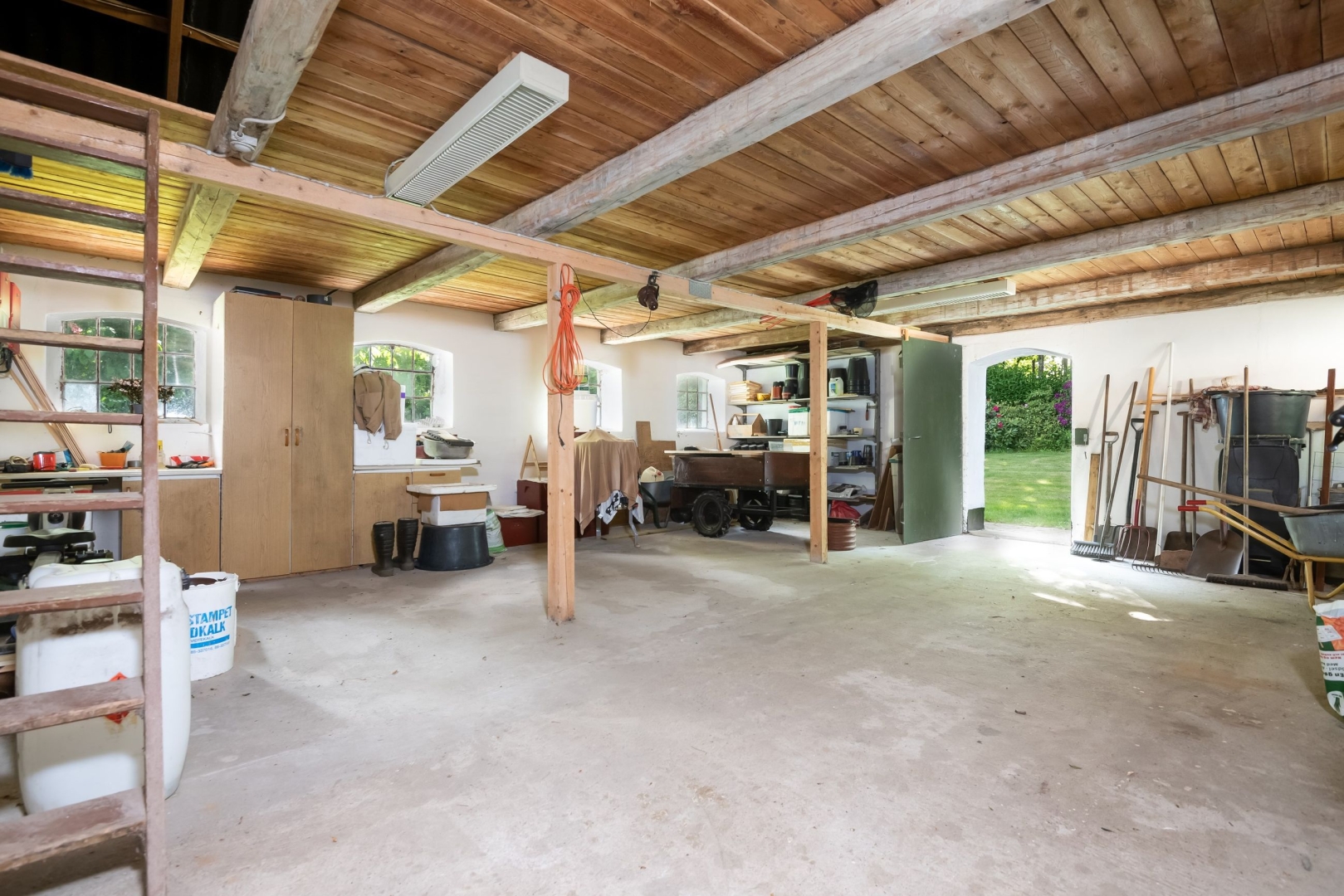 66 m² medbygget bygning der vil være anvendelig til flere formål. 96 m² medbygget bygning med værksted og 2 garager med hejseporte.