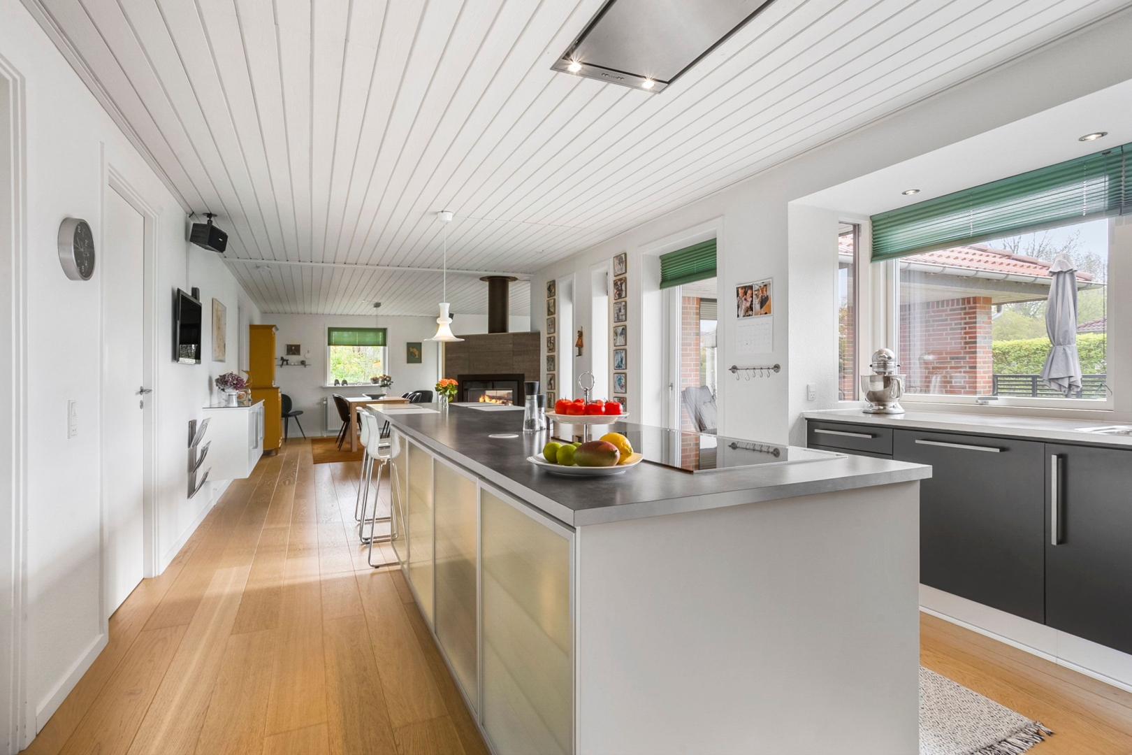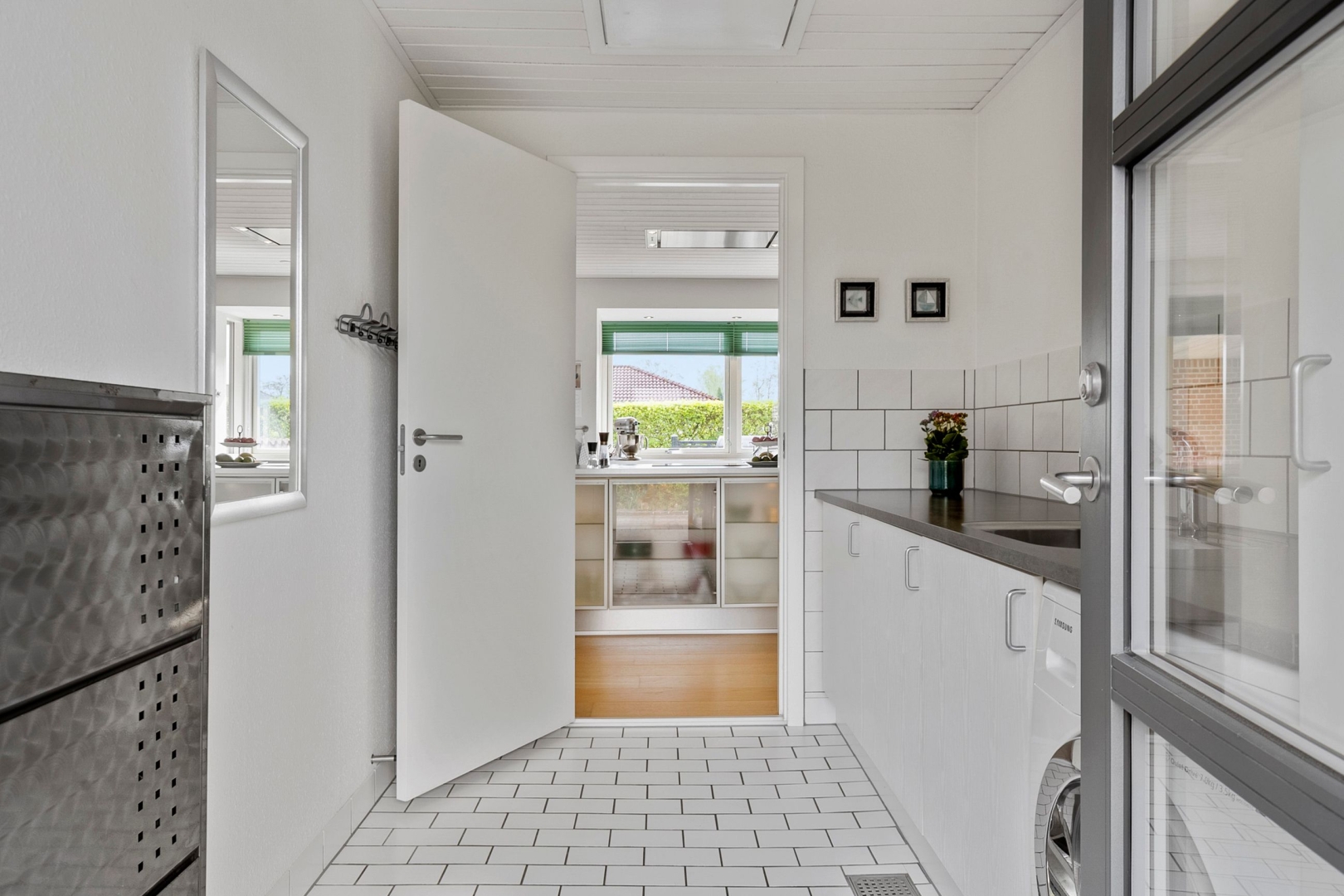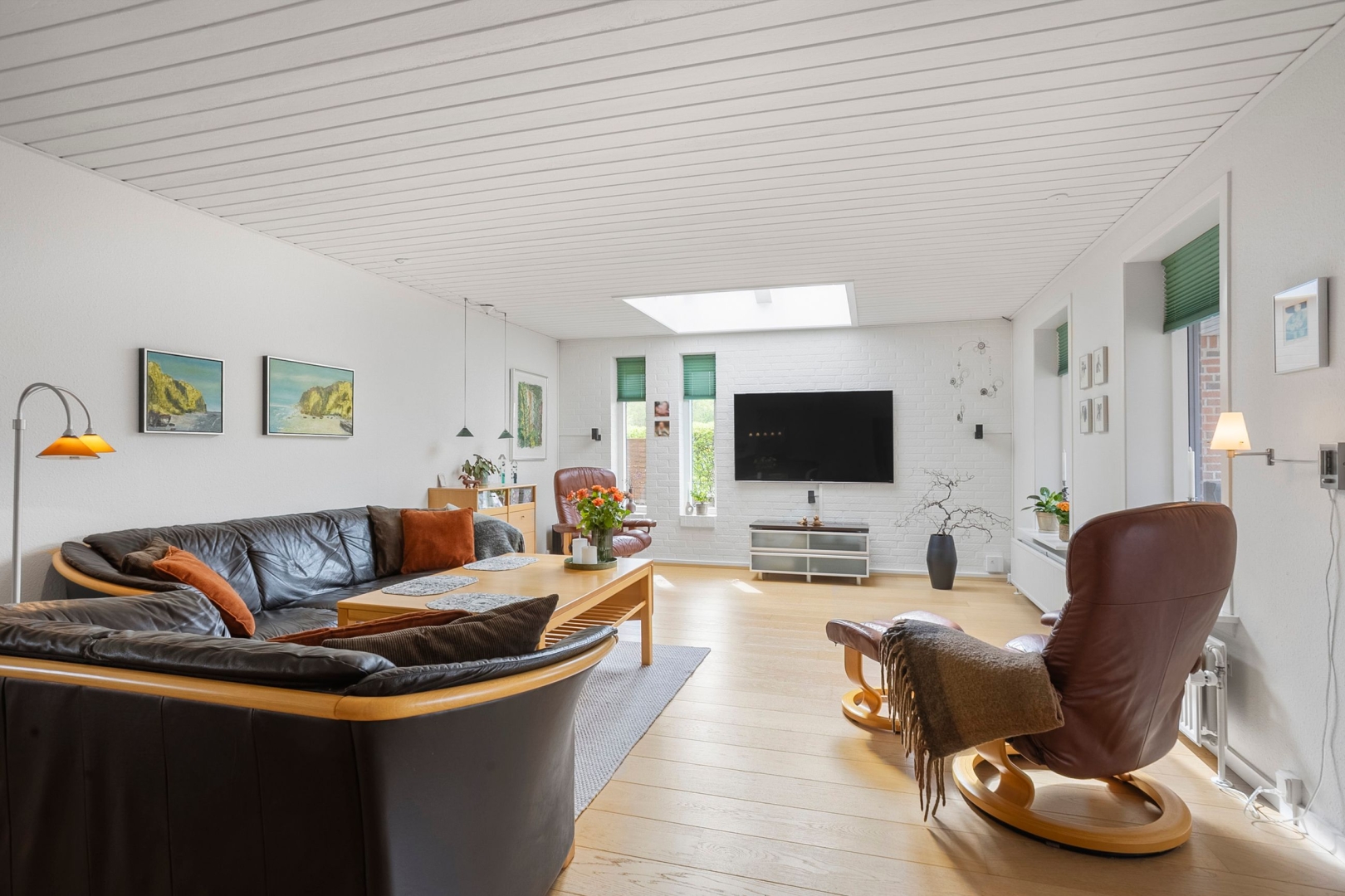 Boligarealet på 146 m² byder på et lyst og lækkert køkkenalrum med udgang til en privat og delvist overdækket terrasse som delvis er afskærmet af en halvmur, en rummelig opholdsstue med stort ovenlys, der lader lyset strømme ind, og et soveværelse med faste skabe, trægulv og direkte adgang til eget badeværelse med klinkegulv, gulvvarme og bruseniche. I forlængelse heraf ligger et børneværelse med trægulv og skabe. Derudover findes to yderligere børneværelser, hvoraf det ene er over 12 m² og har direkte adgang til boligens andet badeværelse, ligeledes med klinkegulv, gulvvarme og bruseniche. Boligen rummer desuden et praktisk bryggers med klinkegulv, bord med vask og plads til vaskemaskine.