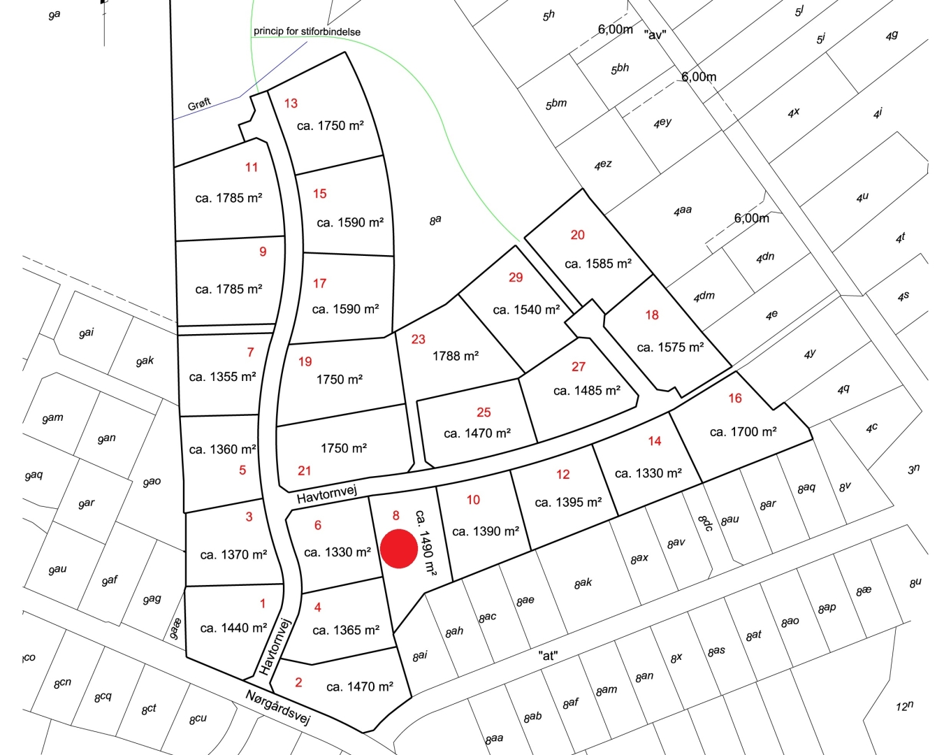 Grundene varierer i størrelse fra ca. 1.330 m² til ca. 1.785 m² og priserne starter ved kr. 395.000,00 inkl. tilslutningsbidrag til kloak, el og vand men eksl. tilslutningsbidrag til fx kabel-tv og fjernvarme.