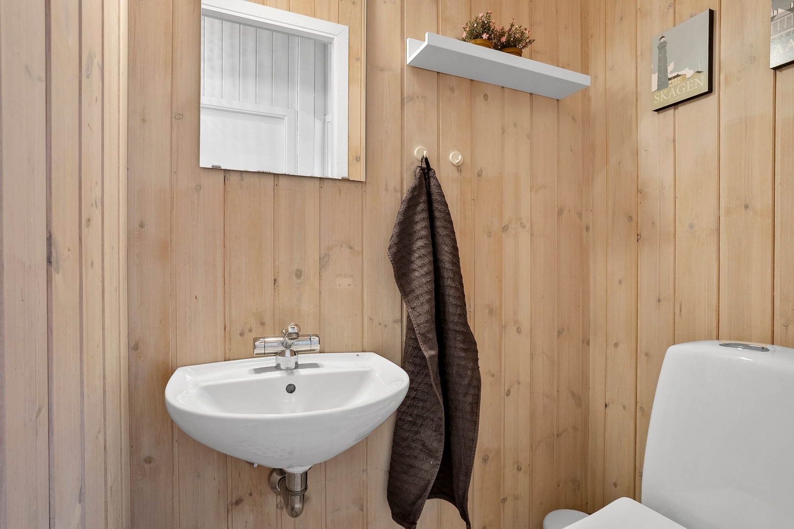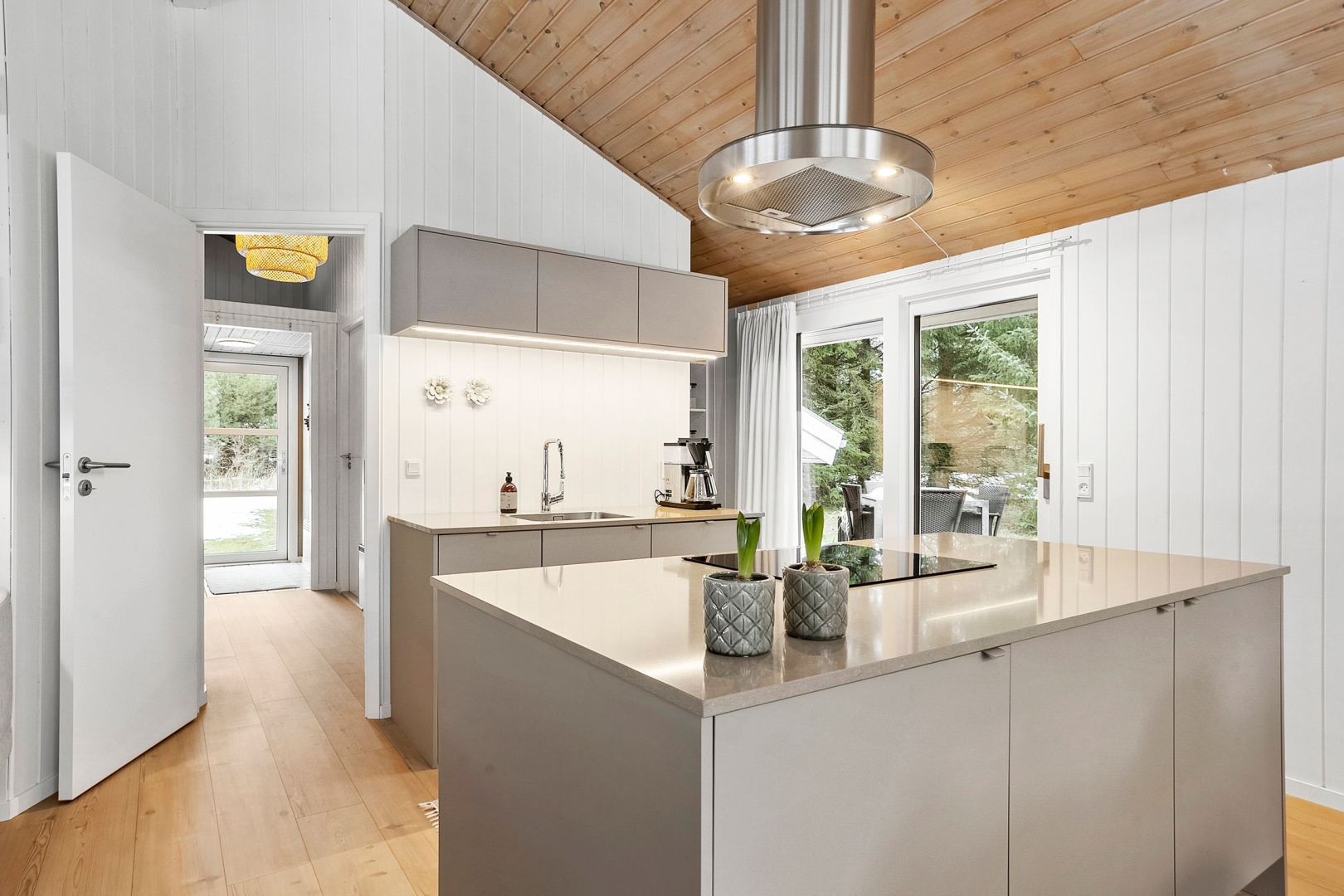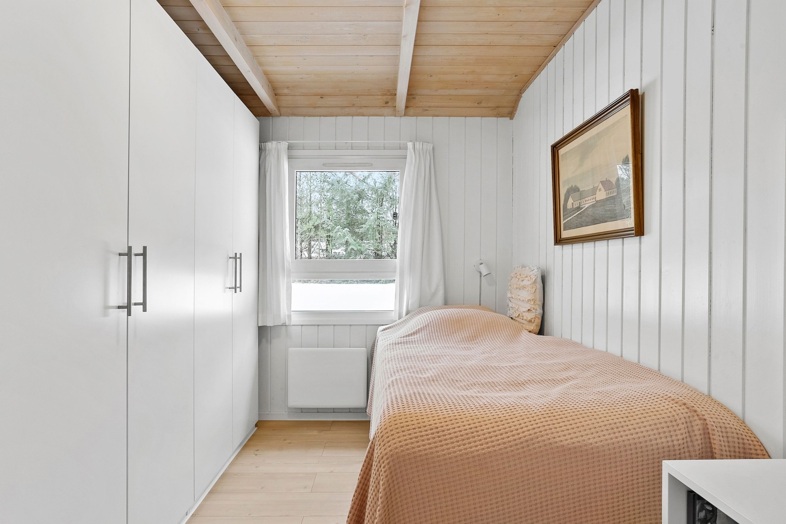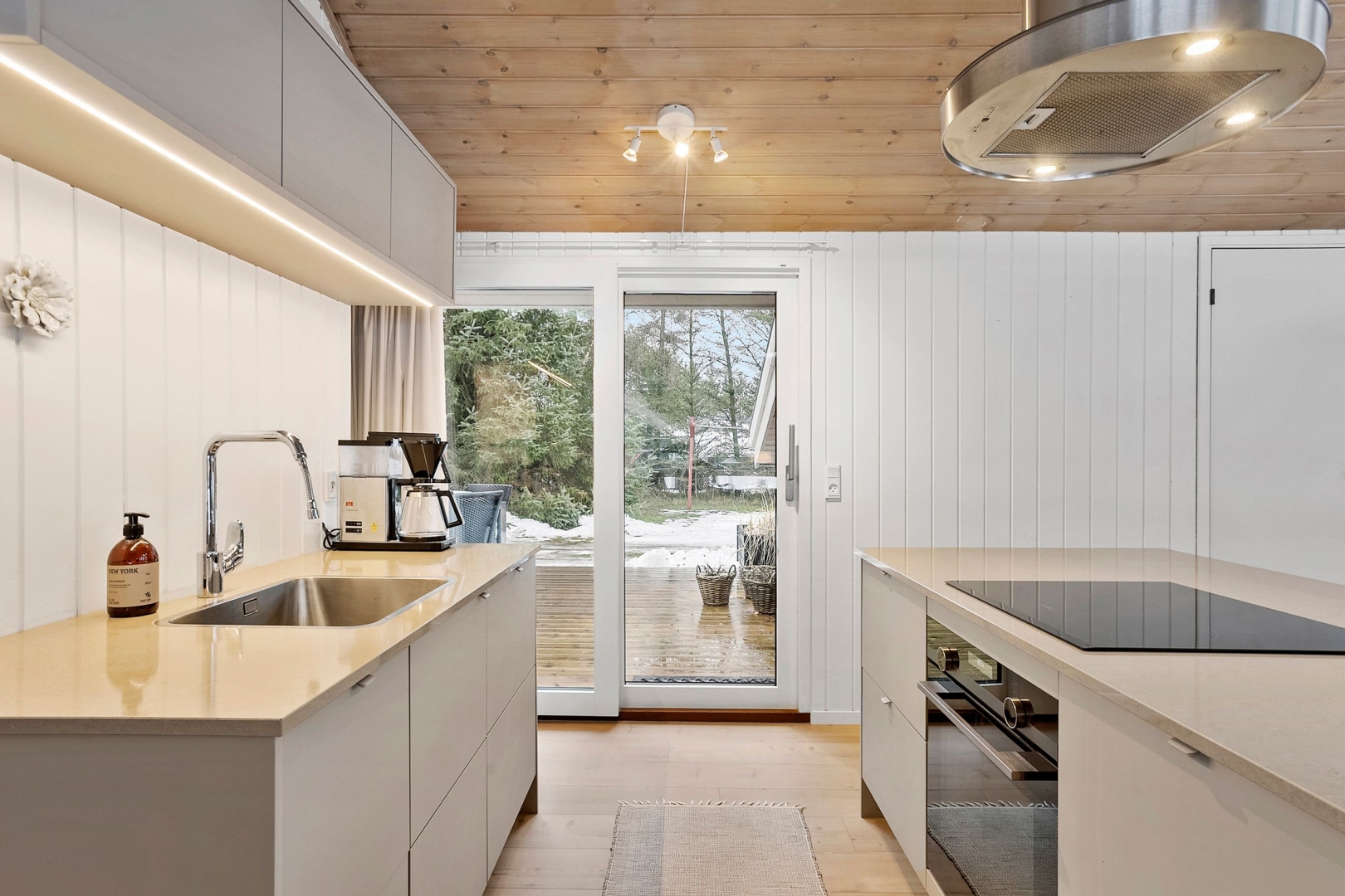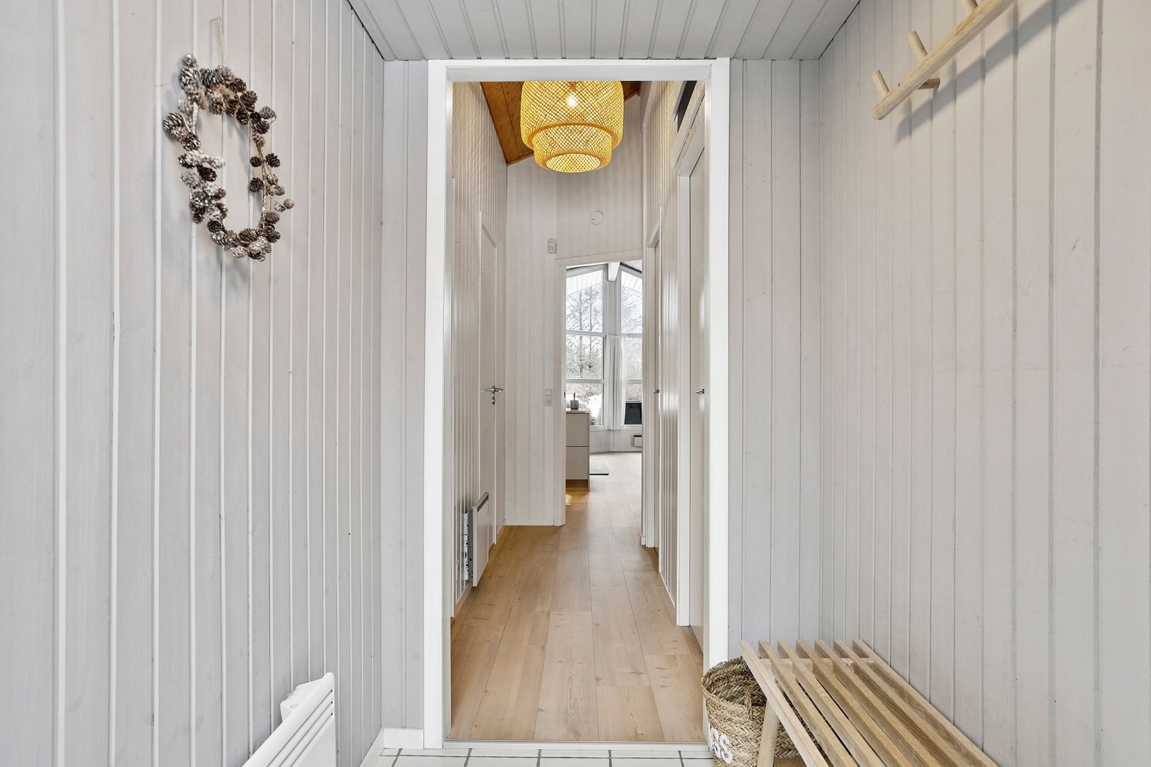 Fritidshuset byder på et skønt opholdsrum med loft til kip, hvor køkken, opholdsstue og spiseplads smelter naturligt sammen. Fra køkkenafdelingen er der via et skydedørsparti udgang til en dejlig morgenterrasse, og ved spisepladsen er den wi-fi-styrede luft-til-luft varmepumpe fint placeret. Herfra er der udgang til en delvist overdækket og sydvendt træterrasse, så udelivet kan nydes, selv når vejret ikke er helt med. Opholdsstuen er udstyret med brændeovn, som skaber varme og hygge på de kølige aftener, og den vestvendte karnap med glasfacade giver et fantastisk lysindfald og et smukt kig ud i omgivelserne. Derudover rummer huset soveværelse, værelse med skabe, et nedsænket værelse, gæstetoilet med klinkegulv og gulvvarme, stort badeværelse med bruseniche, klinkegulv med el-gulvvarme, loft til kip samt plads til både vaskemaskine og tørretumbler, entre med klinkegulv samt fordelingsgang med opgang til hems.