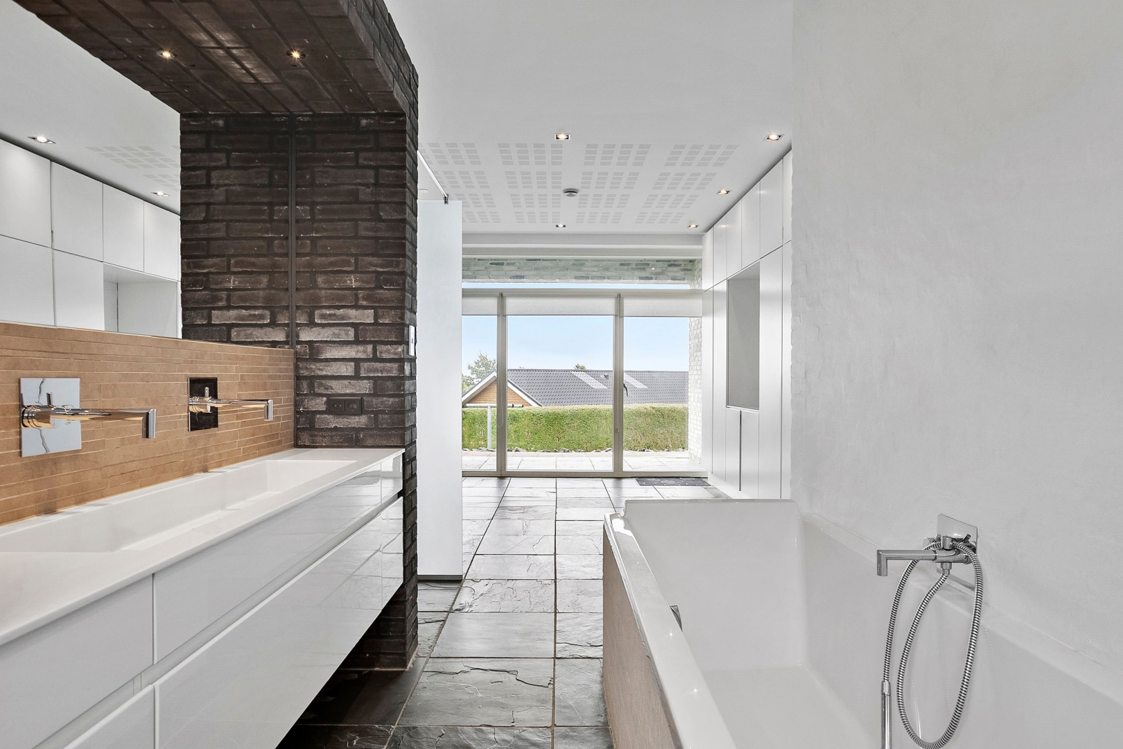 * Forældreafdeling med soveværelse, skabsplads, udgang til overdækket morgenterrasse samt direkte adgang til badeværelse med badekar, separat bruseniche og væghængt toilet.
