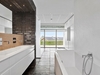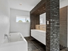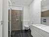 * Badeværelse med bruseniche (glasvæg), væghængt toilet og ovenlysvindue.