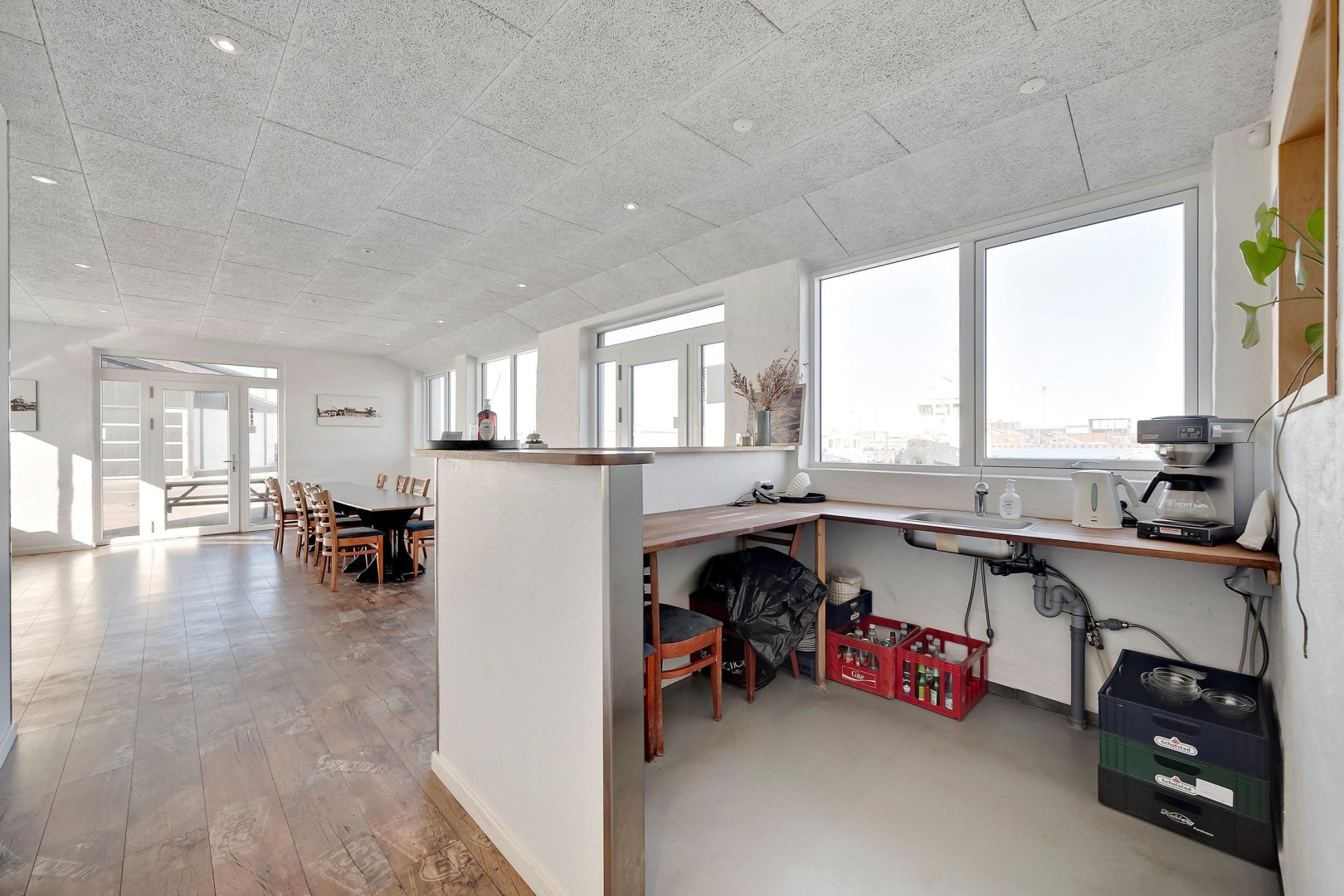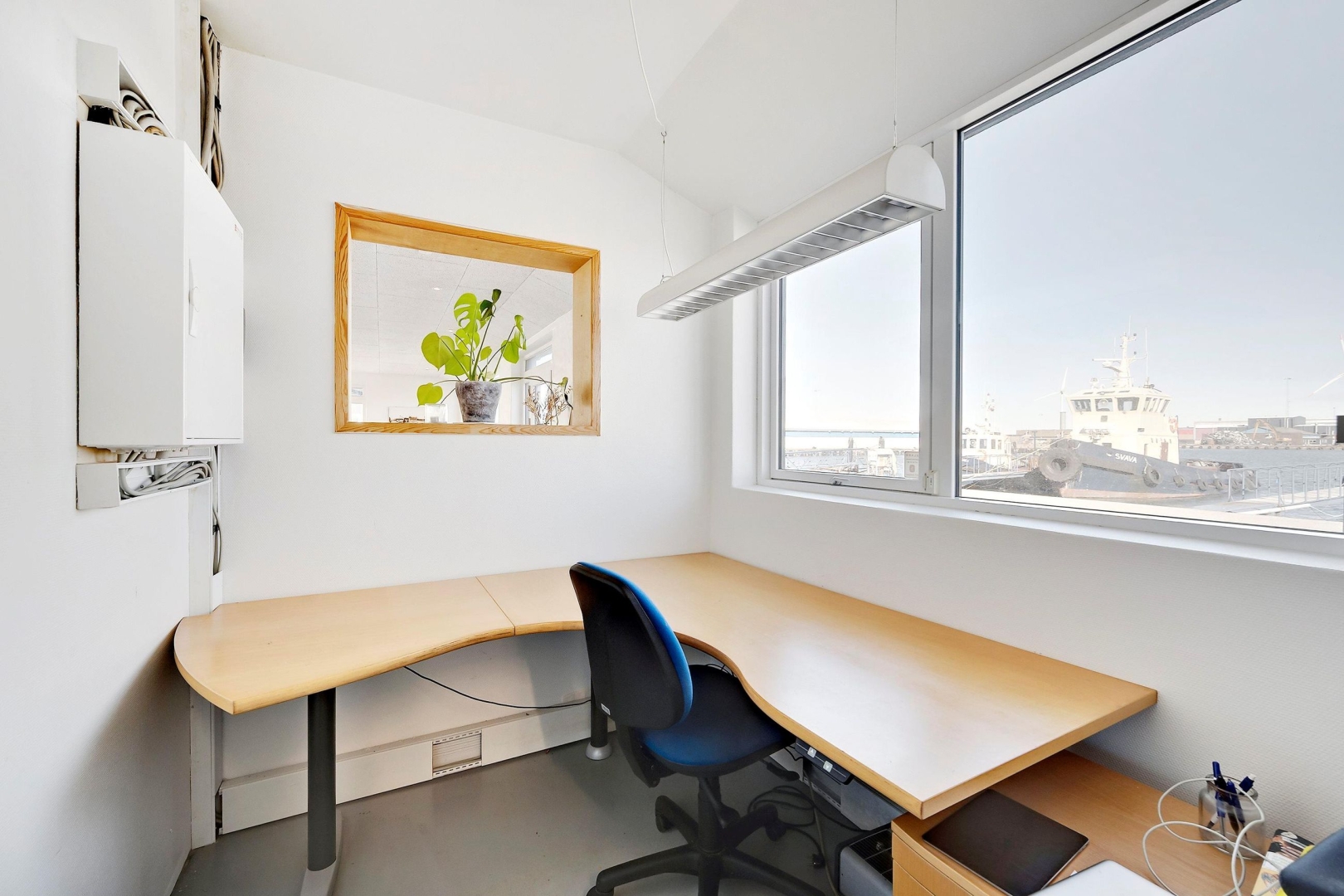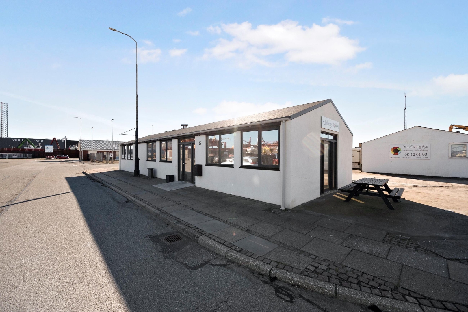 Erhvervsbygning i et plan beliggende kajnært ud for de gamle hyttefade på Frederikshavn Havn.