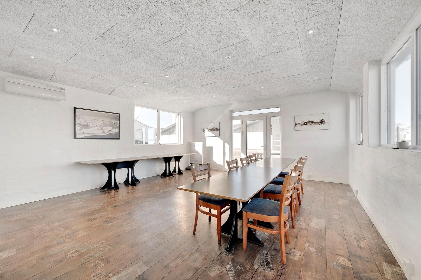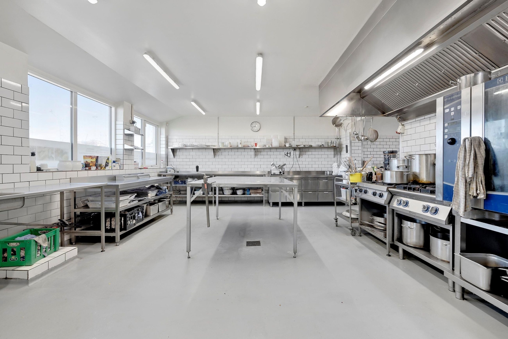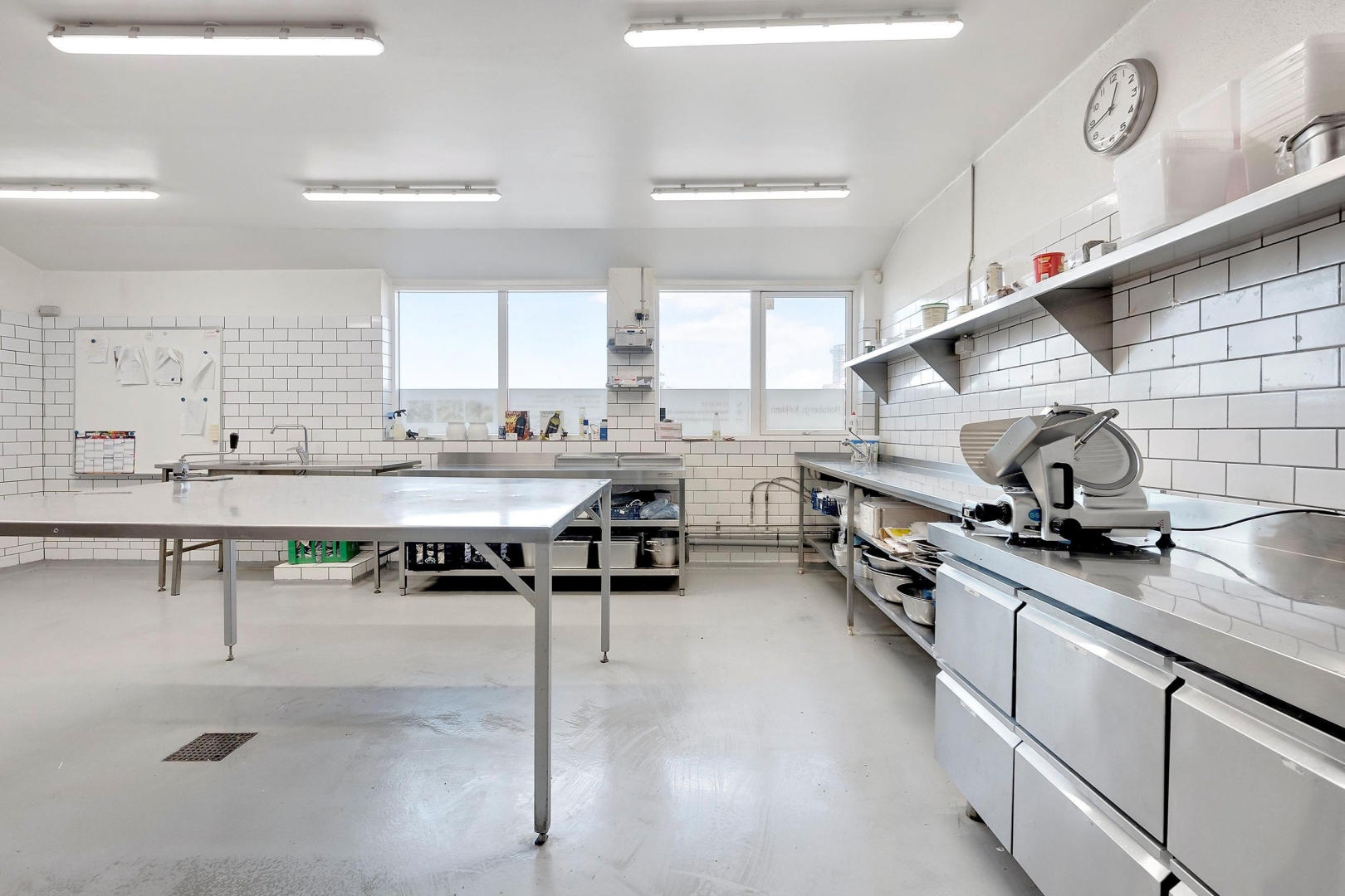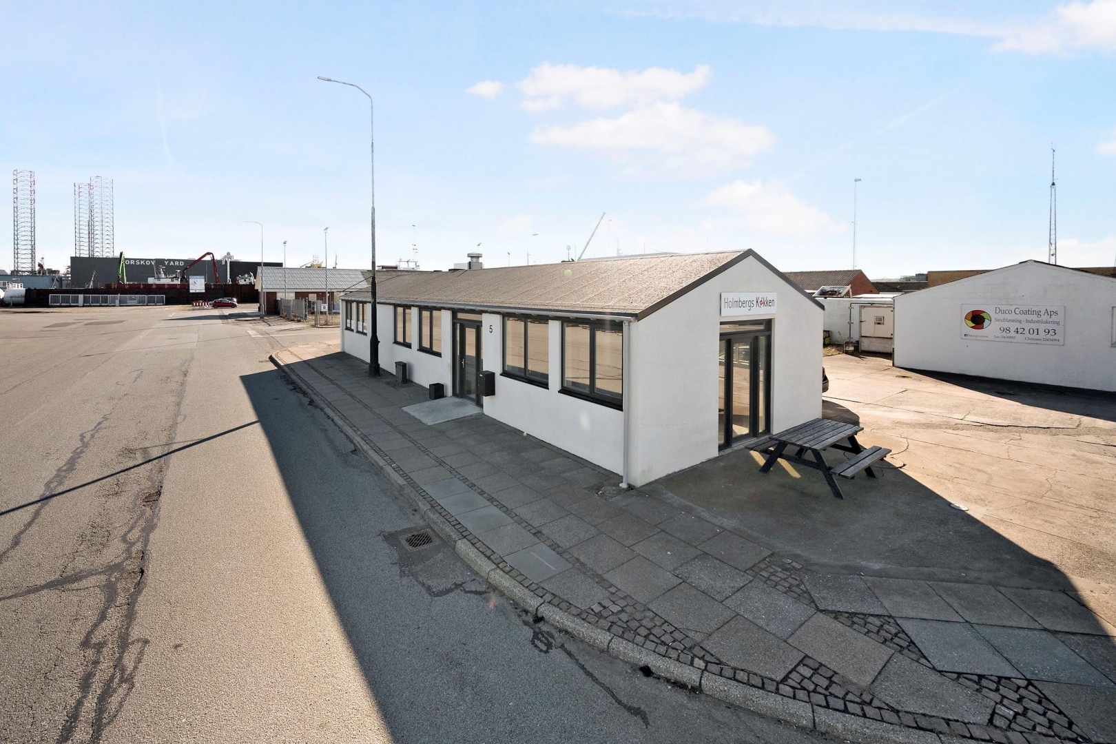 Bygningen er ideel til en bred vifte af virksomheder, der ønsker en placering på havnen i Frederikshavn. Den egner sig både til lager, logistik, administration og mindre produktion eller værksted. Bygningen blev oprindeligt opført i 1968, men har gennemgået en grundig renovering i de seneste år. Der er blandt andet lagt klinkegulve med gulvafløb og fliser på de fleste vægge, hvilket giver bygningen et funktionelt og præsentabelt udtryk. Ejendommens samlede areal er 213 kvadratmeter og indeholder et stort åbent lokale med receptionsdisk, 2 toiletter med forrum, et stort produktionslokale, kontor samt et kølerum. Ejendommen bruges i øjeblikket til cateringvirksomhed, men den rummelige indretning giver mulighed for mange forskellige anvendelser. Der er fast grundbelysning i bygningen-