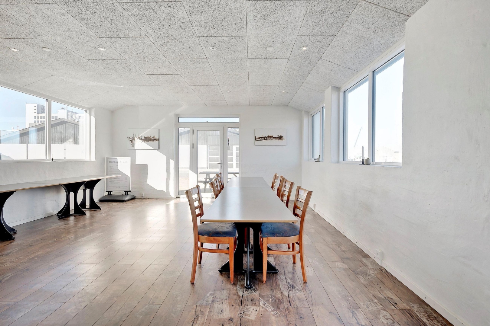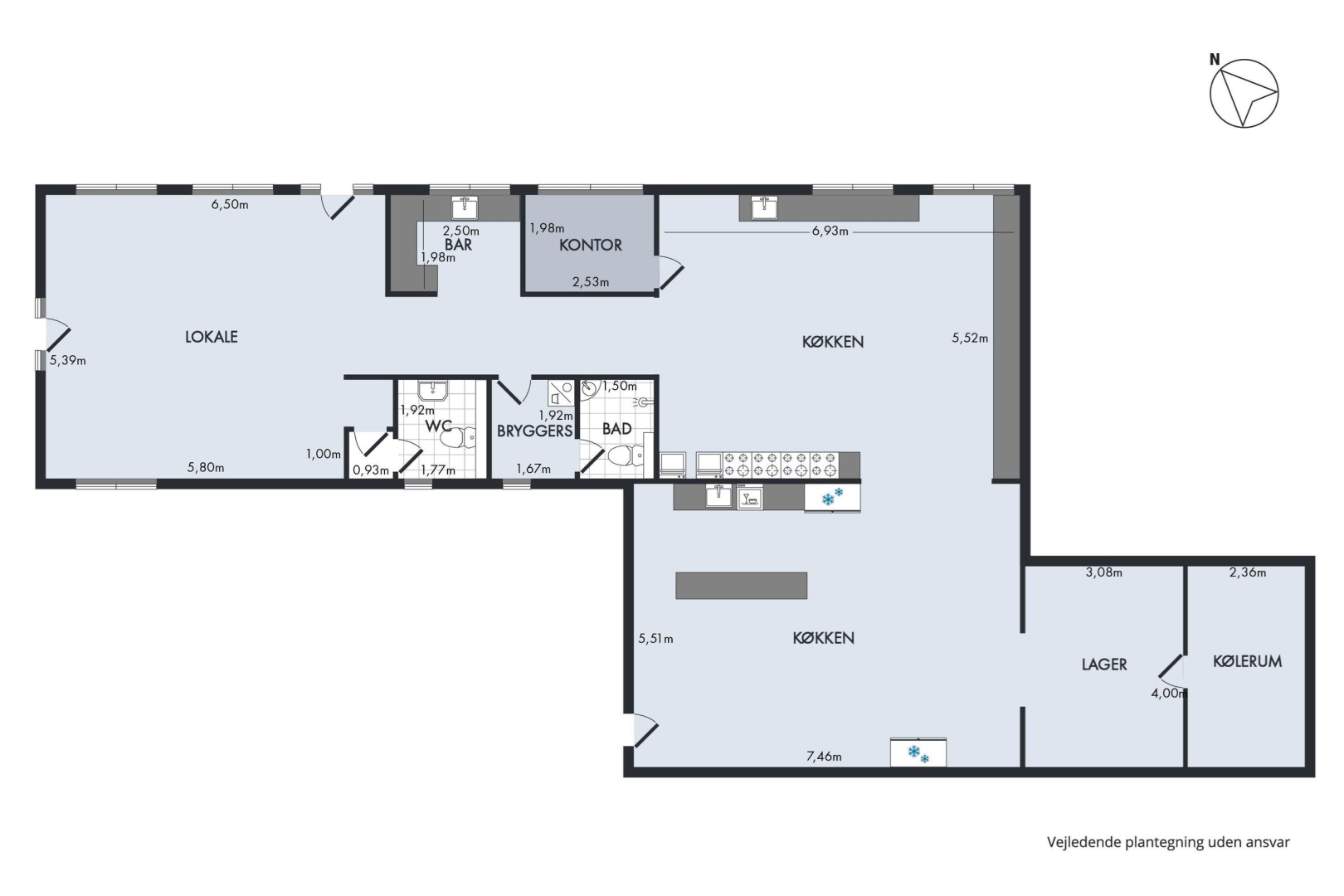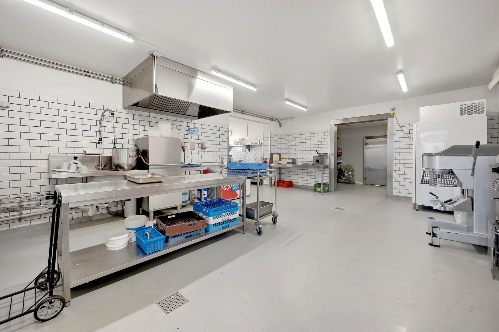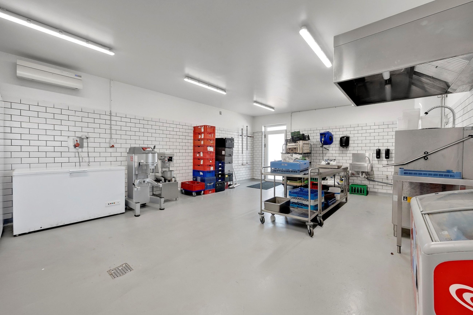 Bygningen er ideel til en bred vifte af virksomheder, der ønsker en placering på havnen i Frederikshavn. Den egner sig både til lager, logistik, administration og mindre produktion eller værksted. Bygningen blev oprindeligt opført i 1968, men har gennemgået en grundig renovering i de seneste år. Der er blandt andet lagt klinkegulve med gulvafløb og fliser på de fleste vægge, hvilket giver bygningen et funktionelt og præsentabelt udtryk. Ejendommens samlede areal er 213 kvadratmeter og indeholder et stort åbent lokale med receptionsdisk, 2 toiletter med forrum, et stort produktionslokale, kontor samt et kølerum. Ejendommen bruges i øjeblikket til cateringvirksomhed, men den rummelige indretning giver mulighed for mange forskellige anvendelser. Der er fast grundbelysning i bygningen-