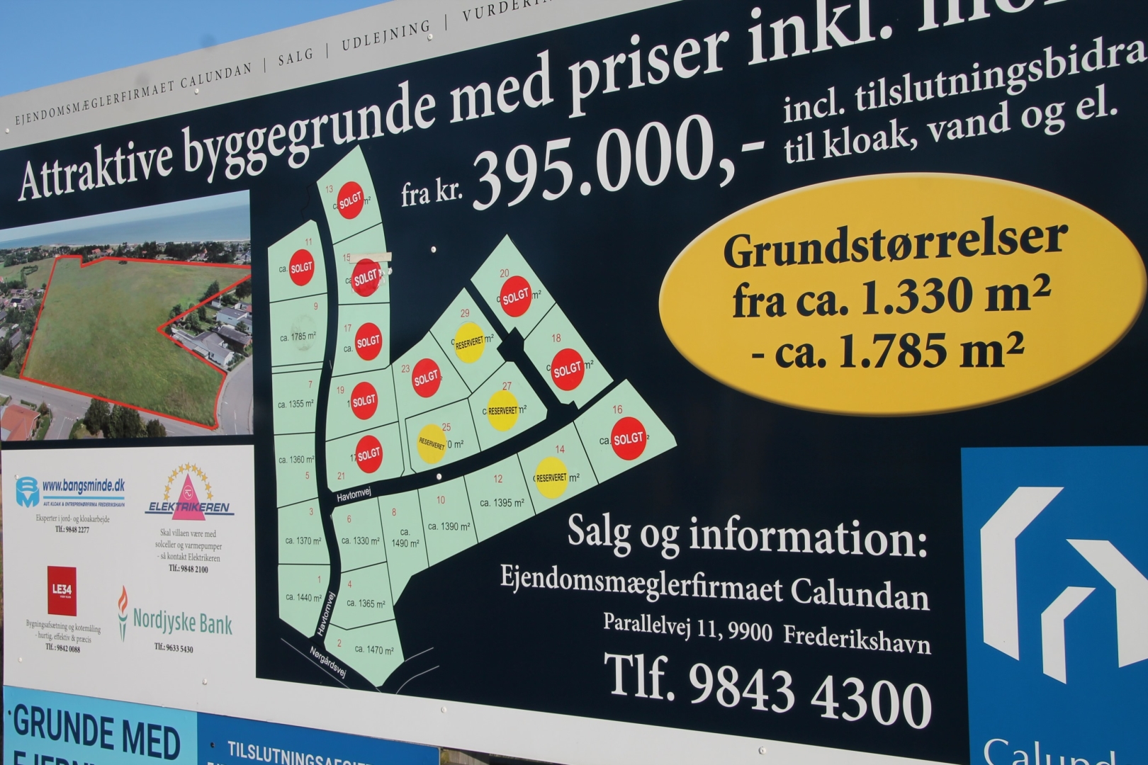 Grundene varierer i størrelse fra ca. 1.330 m² til ca. 1.785 m² og priserne starter ved kr. 395.000,00 inkl. tilslutningsbidrag til kloak, el og vand men eksl. tilslutningsbidrag til fx kabel-tv og fjernvarme.
