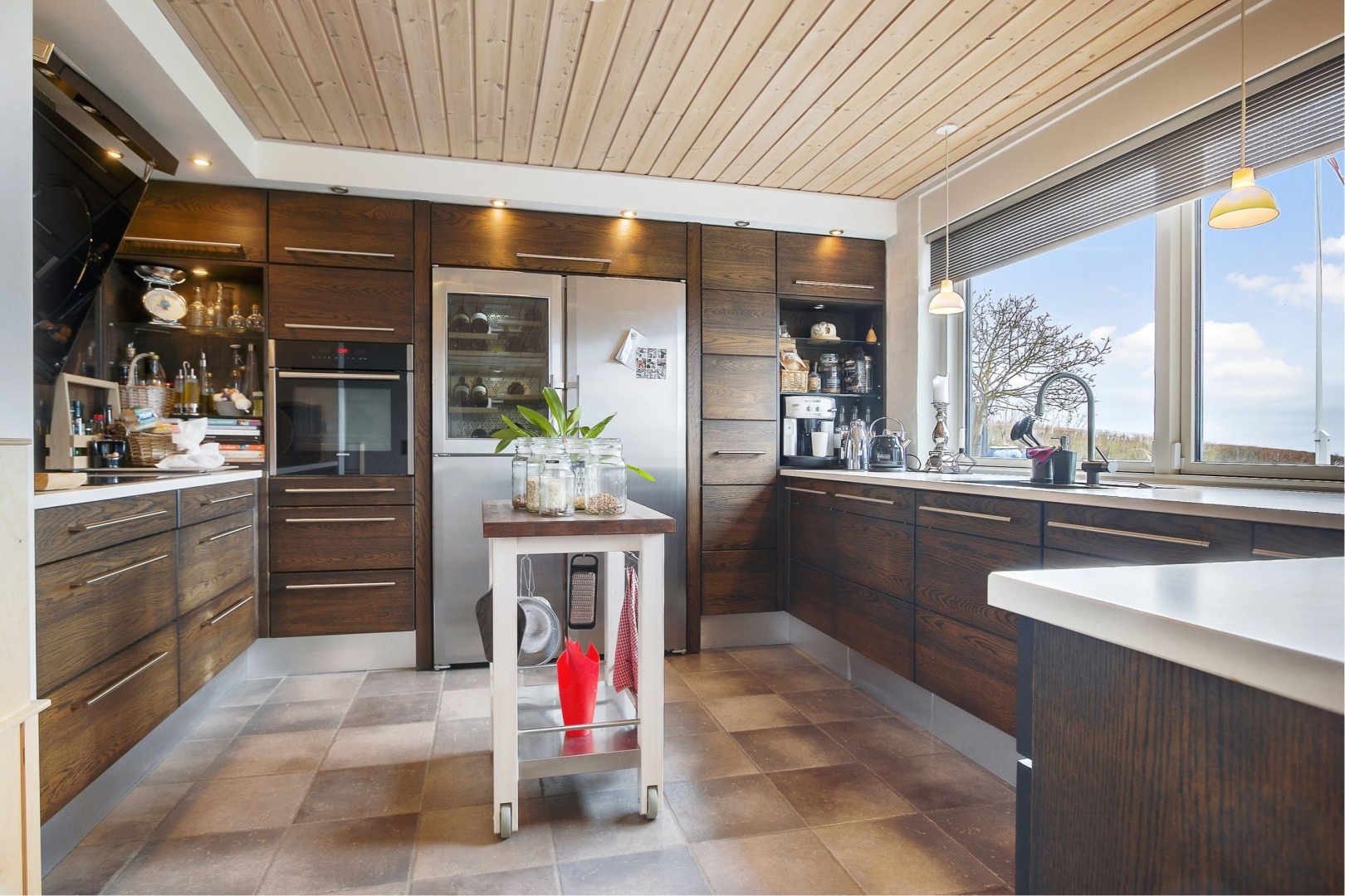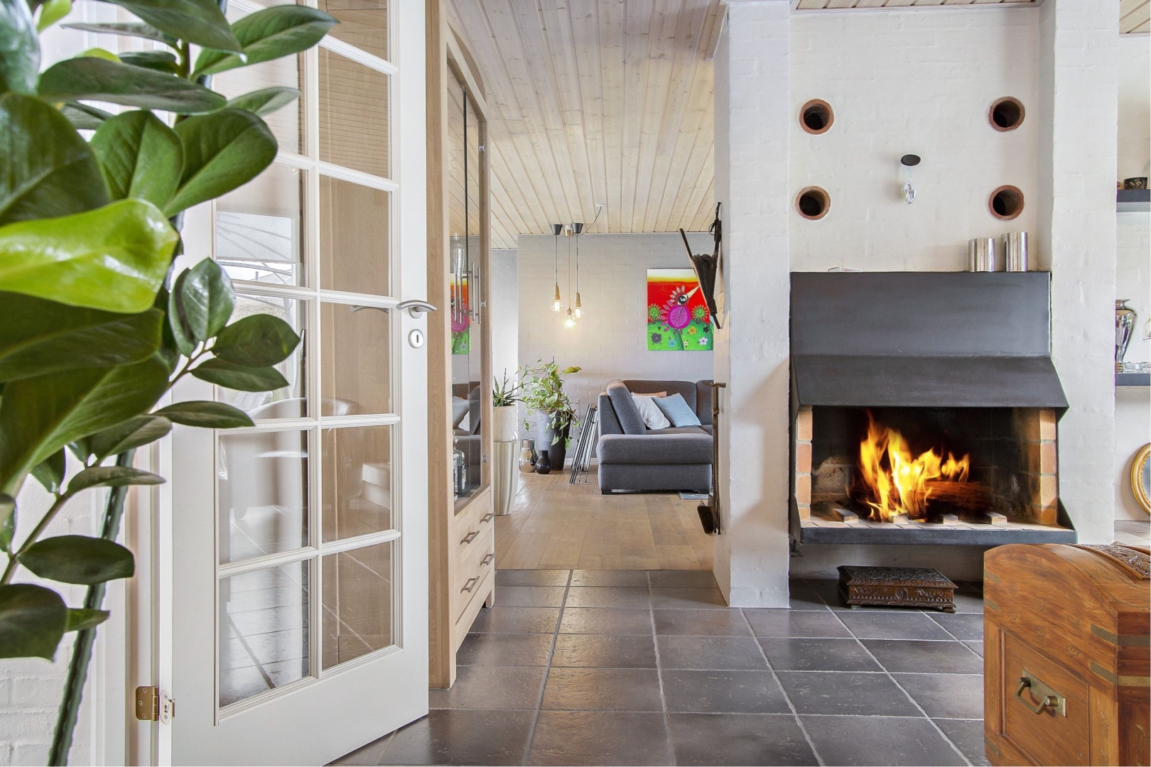Indvendigt præsenterer villaen sig med vandskurede vægge overalt og indeholder en rummelig hall med åben pejs, klinkegulv og dobbelt franske døre til køkkenet. Det smukke snedkerkøkken i massiv sortbejdset eg er udstyret med moderne hårde hvidevarer bl.a et lækkert Liebherr SBS, køle-, frys og vinkølerskab med 2 zoner (indvendig automatisk ismaskine). Vasken er i Silgranit fra Blanco og armatur med udtræk er fra Blanco. Bordpladen er 30 mm kompositsten Blanco Zeus Leather Touch mat hvid. Spise- og opholdsstuen kombineres og byder på en uforglemmelig udsigt over byen og havet, med adgang til den flisebelagte udsigtsterrasse. Der er yderligere en opholdsstue med brændeovn (skal skiftes) og et gæstetoilet med klinkegulv.
