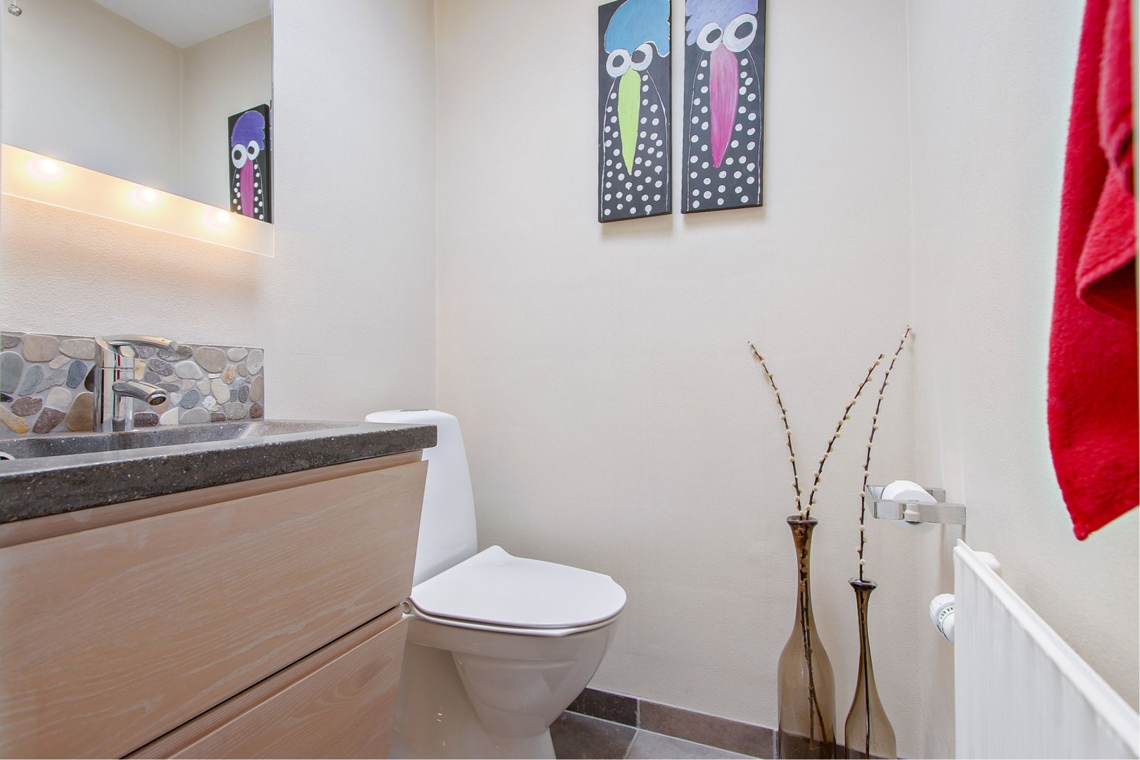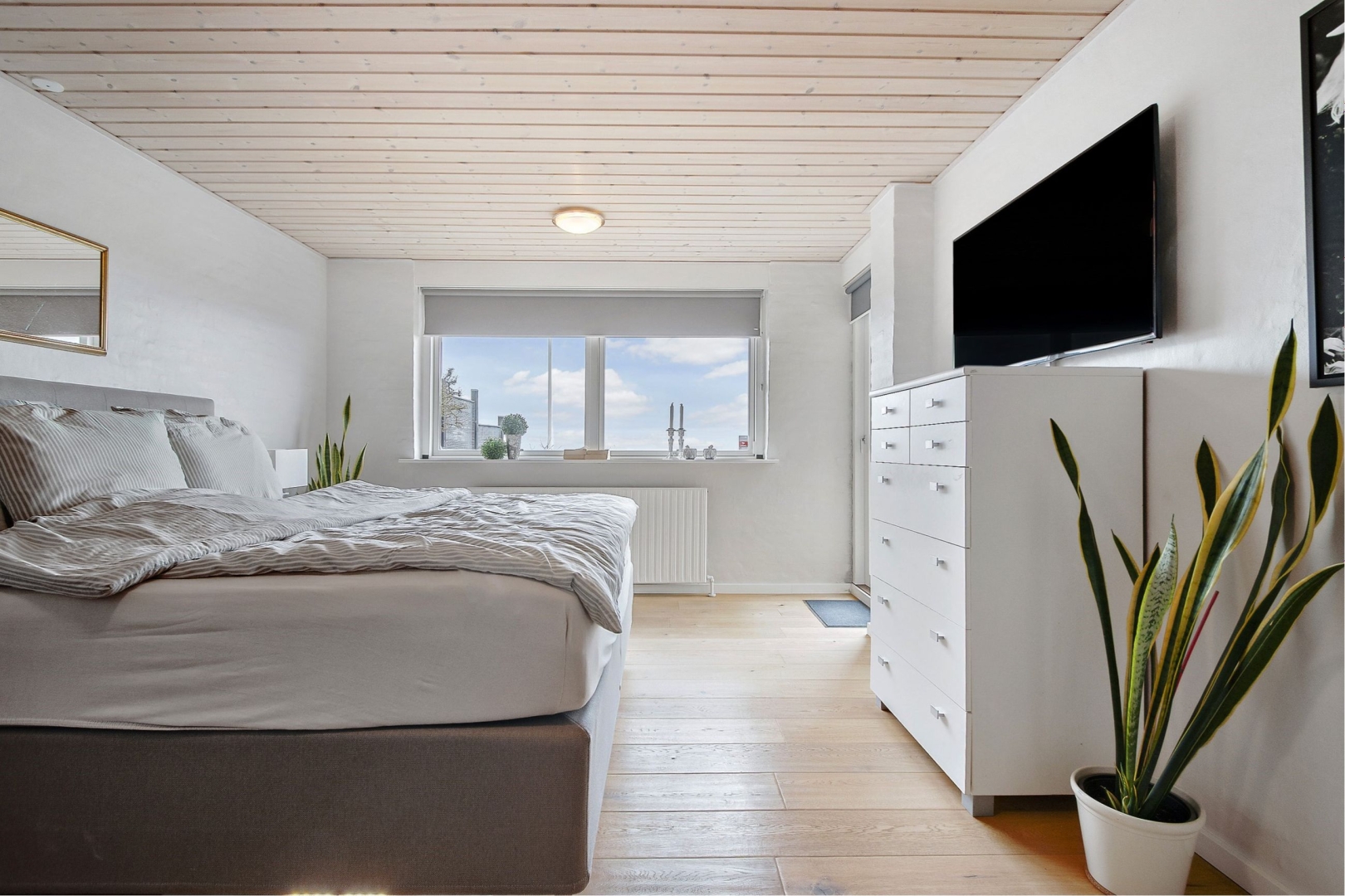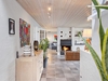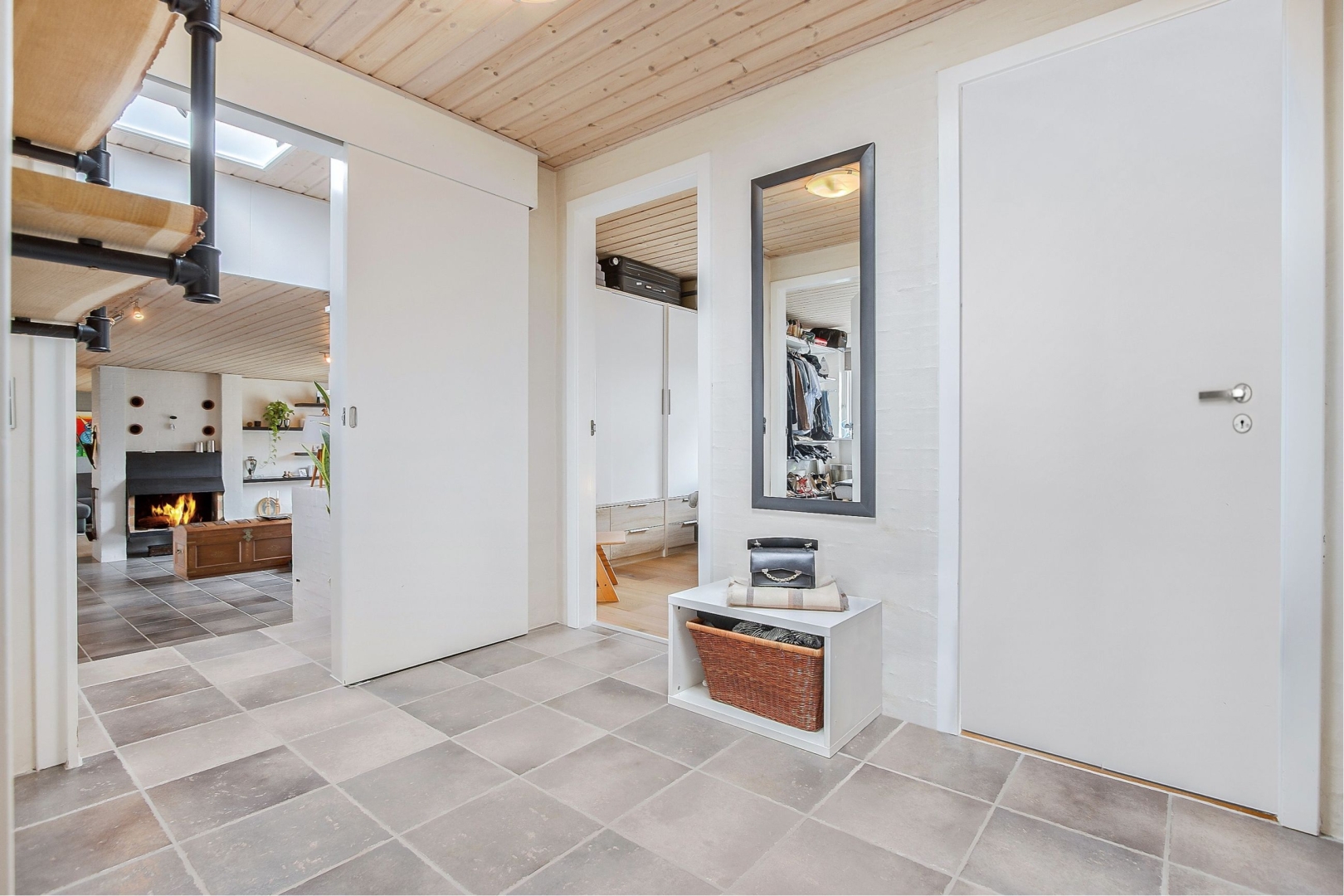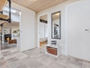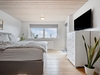 En lille trappe fører op til en fordelingsgang som giver adgang til soveværelset med fantastisk udsigt og hvorfra der er adgang til terrassen, to ekstra værelser, et lækkert badeværelse med inventar i massiv hvid ask og VOLA-armaturer, samt et praktisk bryggers med vask og plads til vaskefaciliteter og køle-/fryseskab.