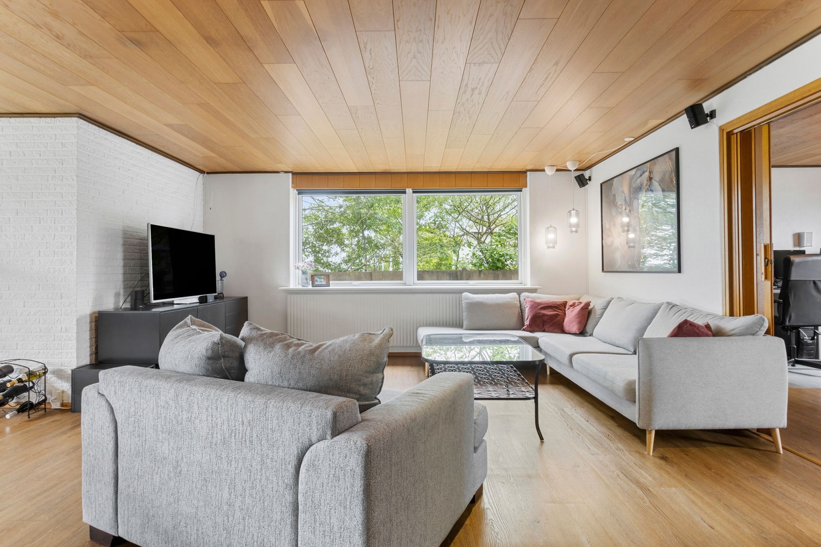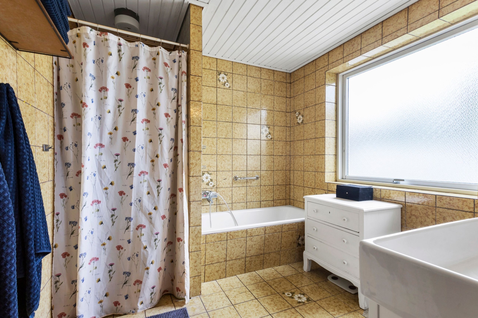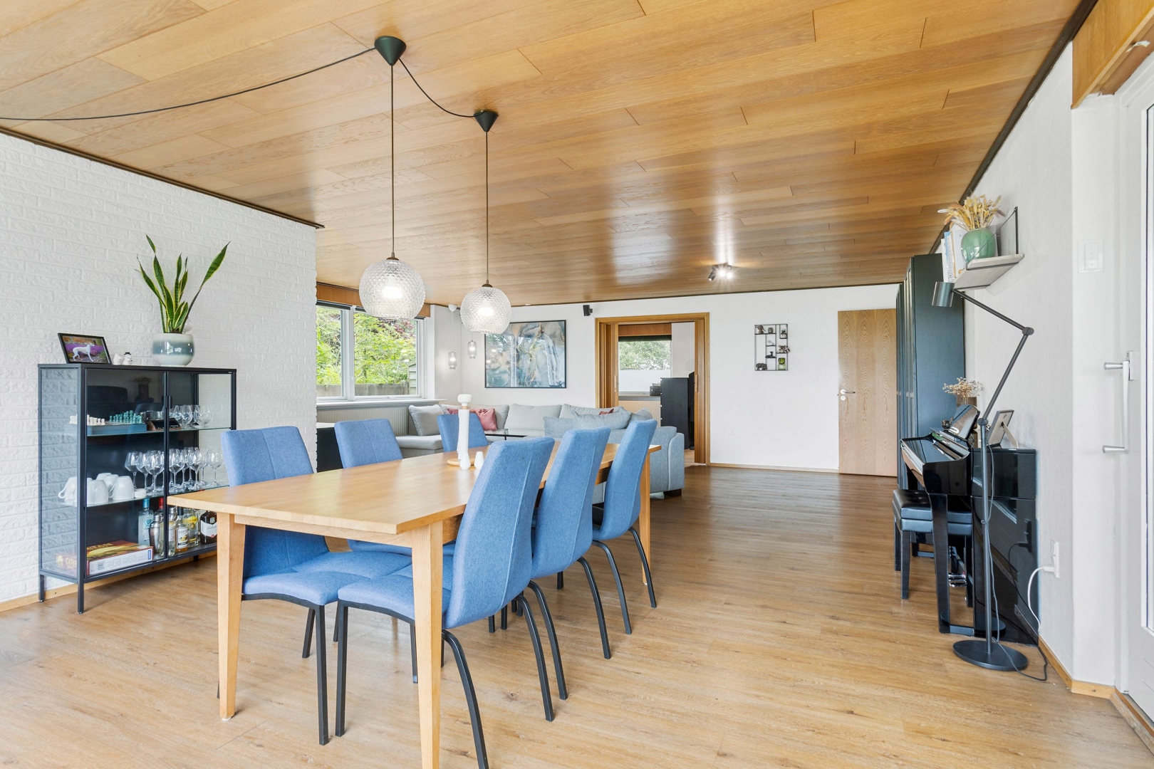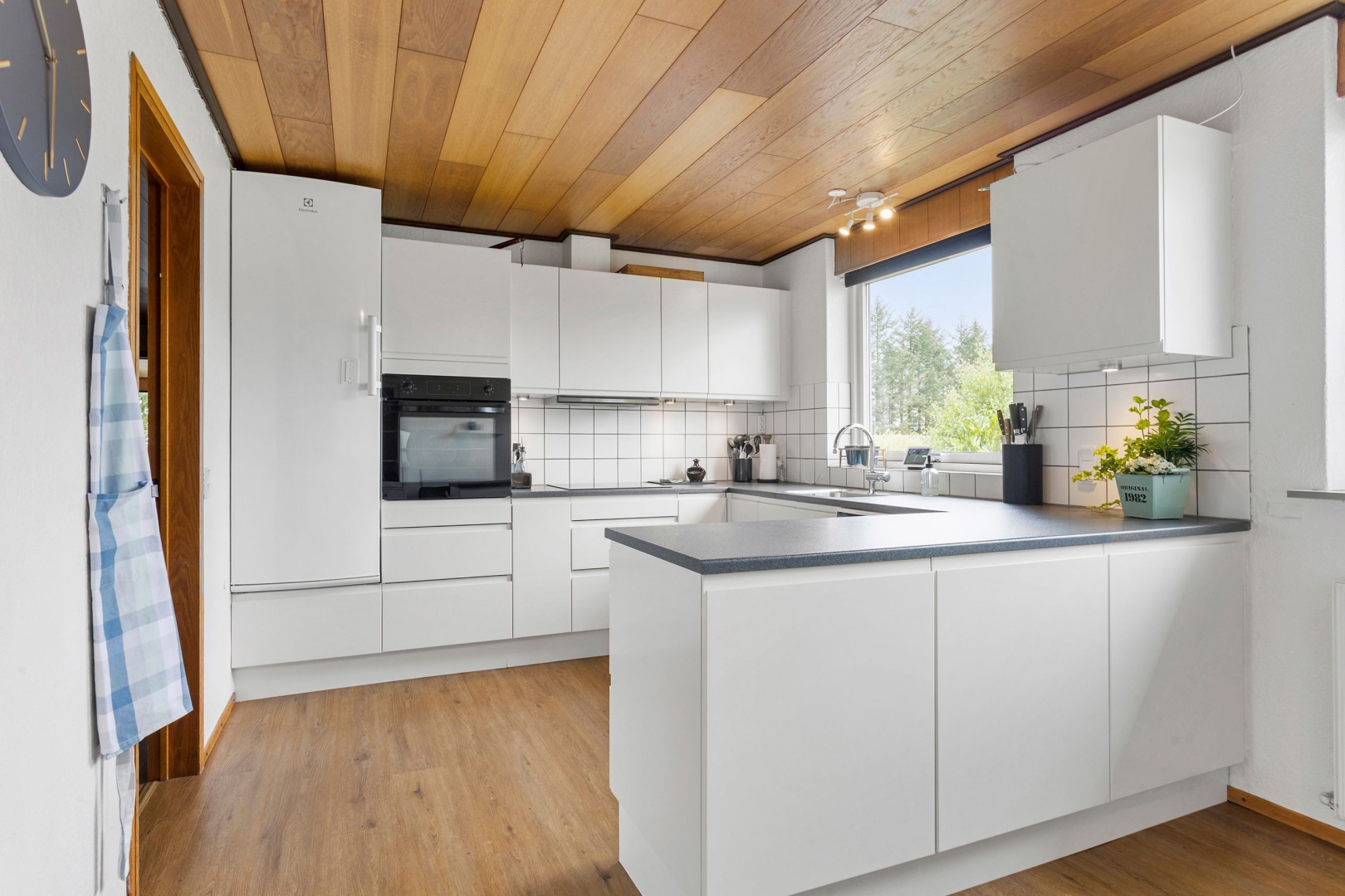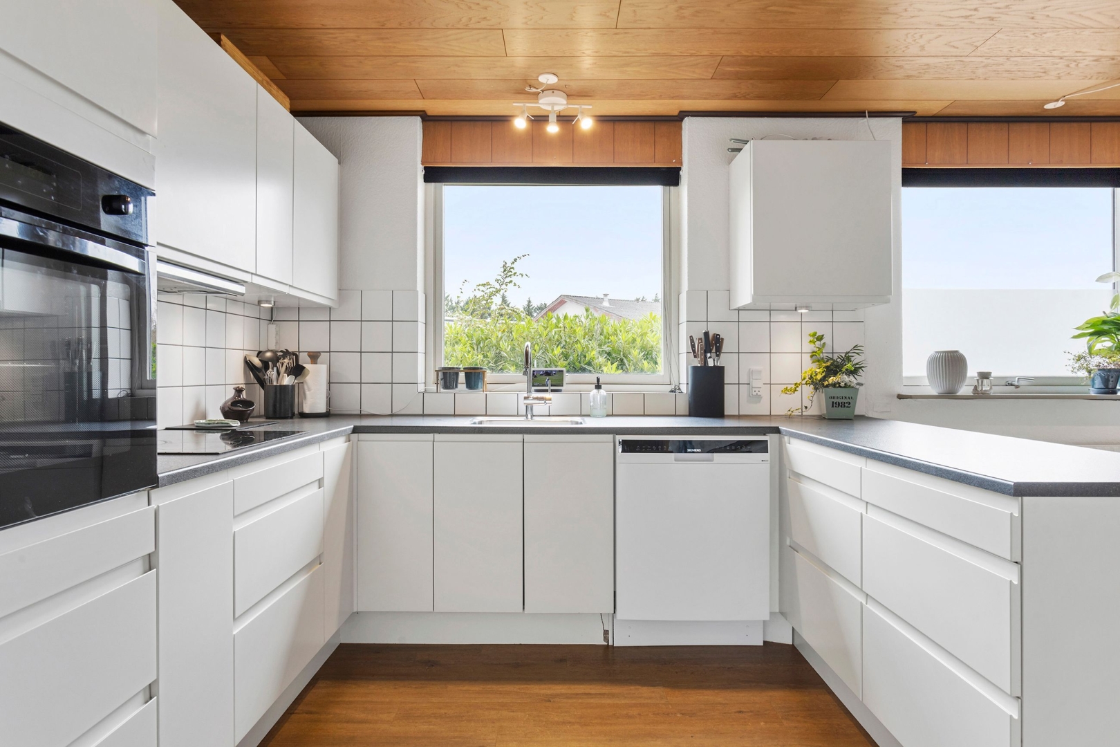 Boligen er et fritliggende parcelhus på 170 m² i hvide kalksandsten med eternittag og termovinduer i trærammer. Planløsningen rummer: