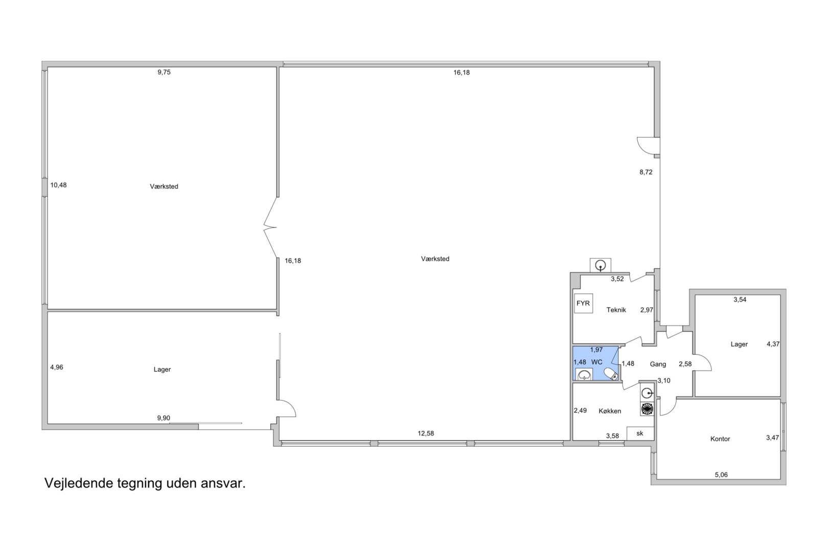Stueplan med regulært værksted, rørlager og administrationsafsnit