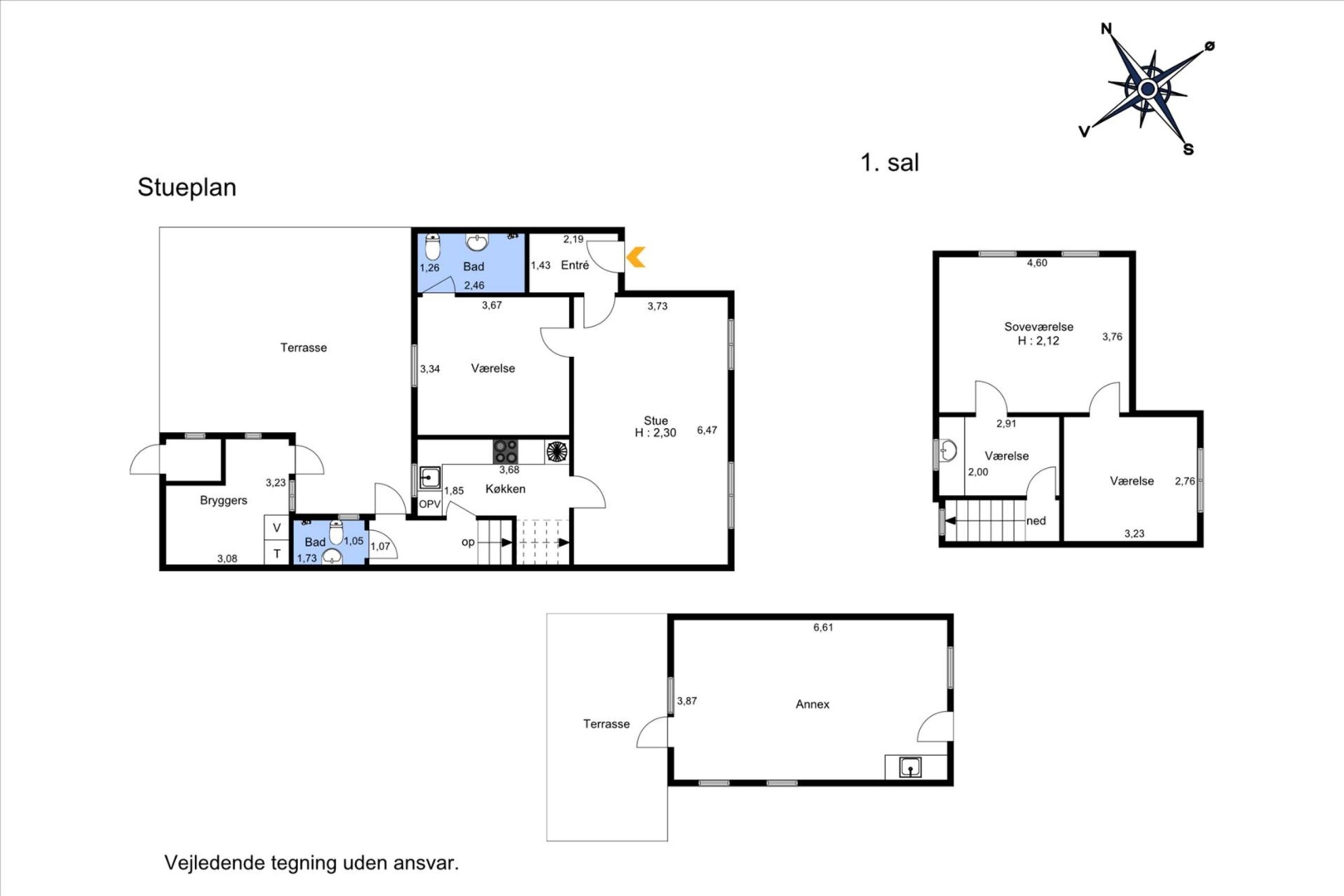 Boligarealet er på cirka 105 kvadratmeter, fordelt med 70 kvadratmeter i stueplan og 35 kvadratmeter på første sal. I stueplan findes entré, køkken, en lys opholdsstue, et værelse med direkte adgang til badeværelse, badeværelse med bruseniche samt fliser på gulv og vægge, baggang med udgang til gårdhaven samt endnu et badeværelse med brus og hvide fliser. På første sal ligger soveværelse, værelse samt repos med et lille køkken.