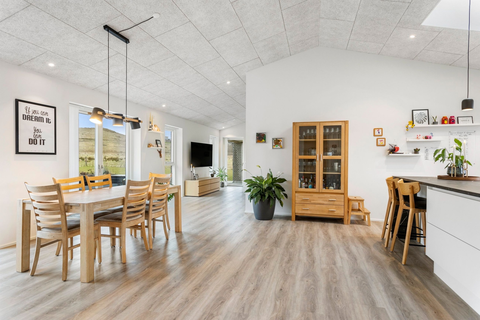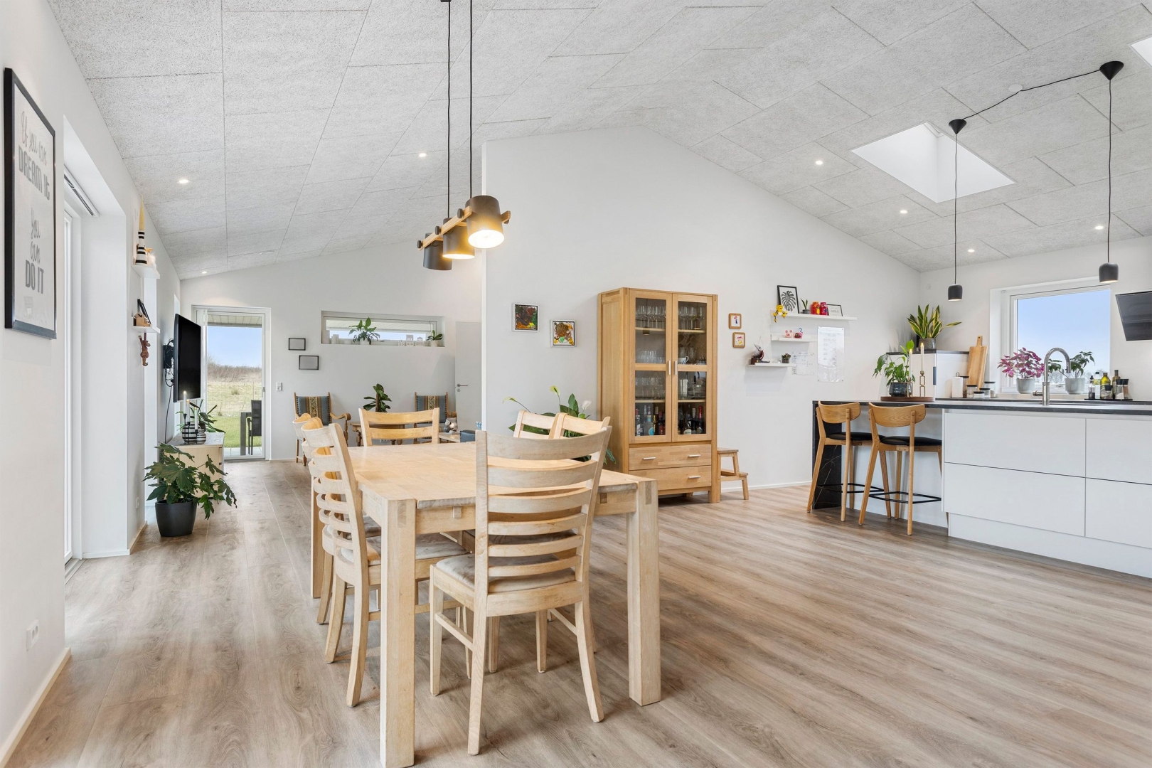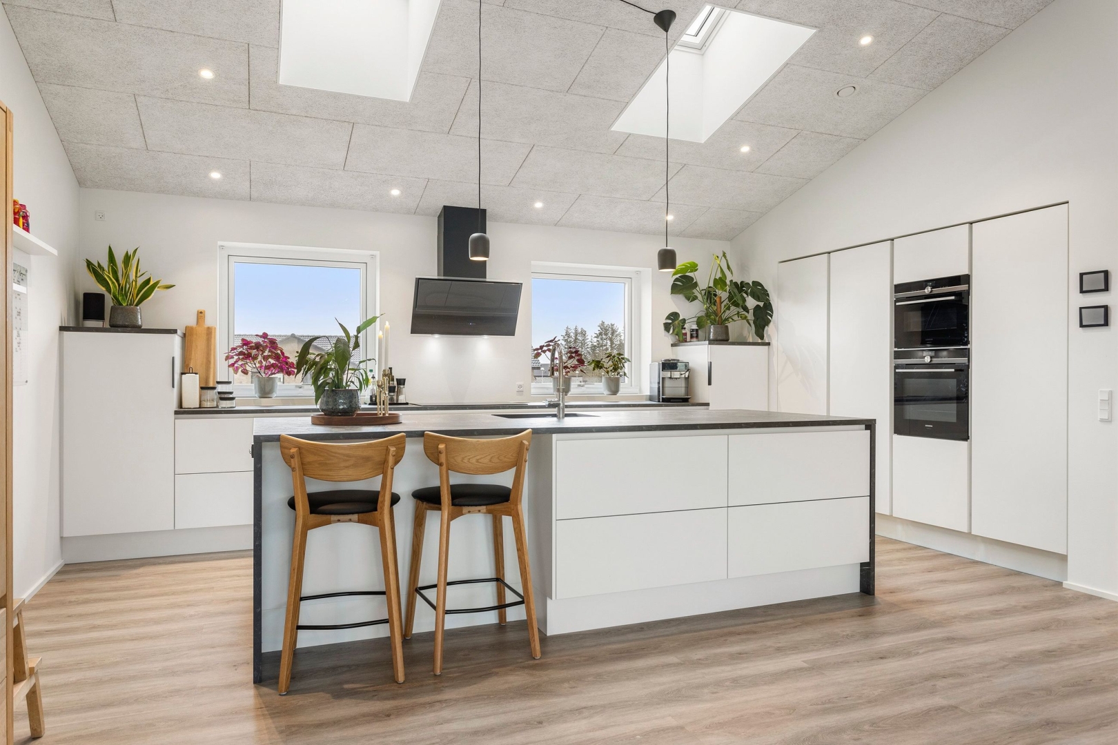 Materialevalget er gennemført - med troldtektlofter overalt og samme flotte vinylgulv med korkunderlag går igen i alle opholdsrum, mens bryggers og begge badeværelser er udført med ens klinkegulve.
