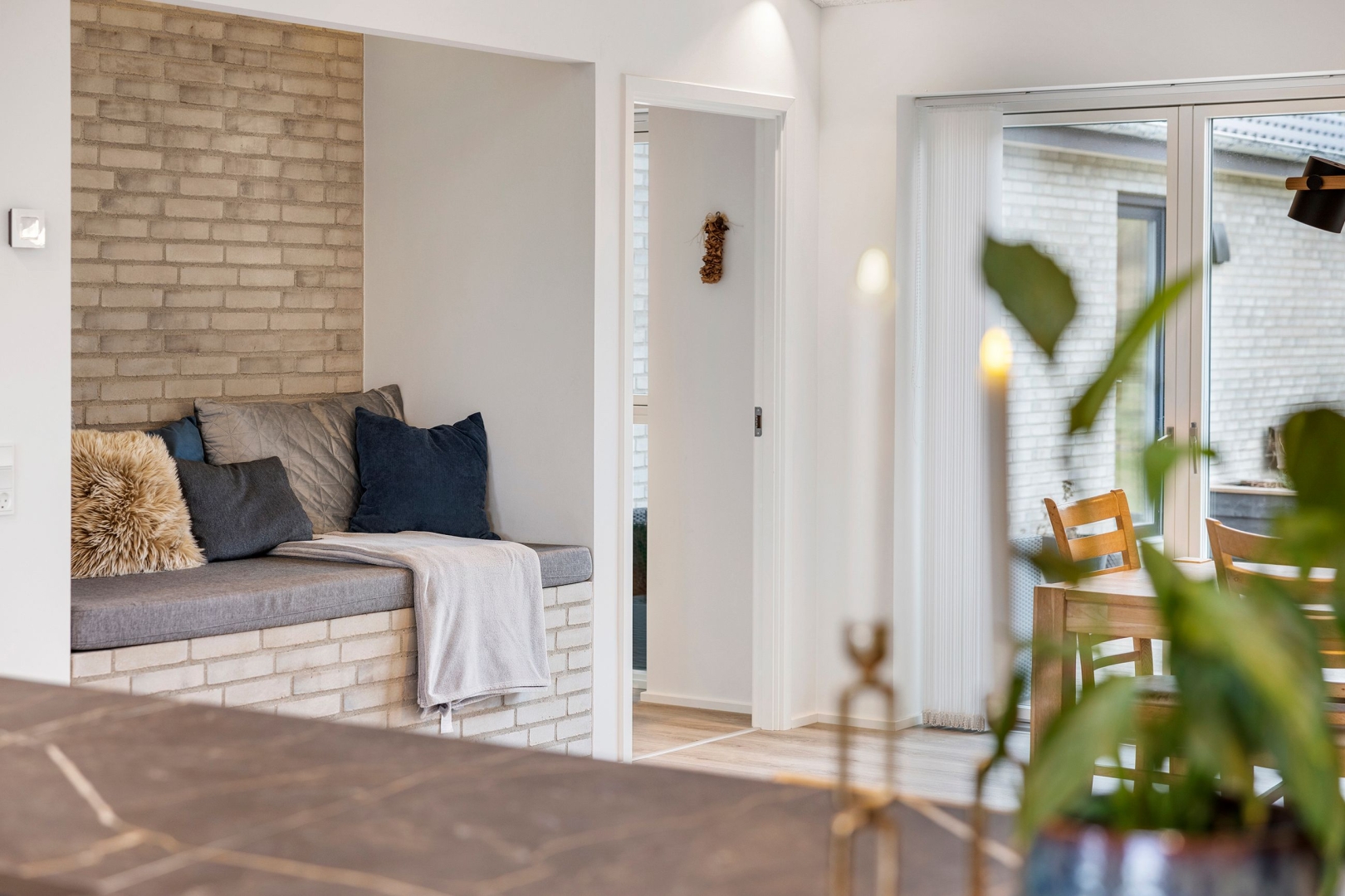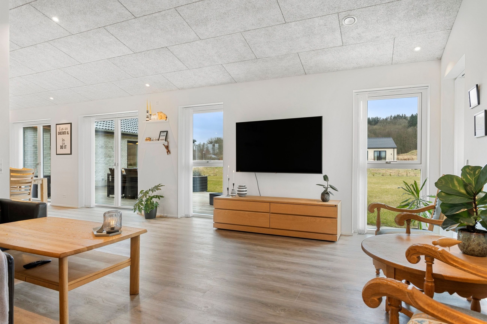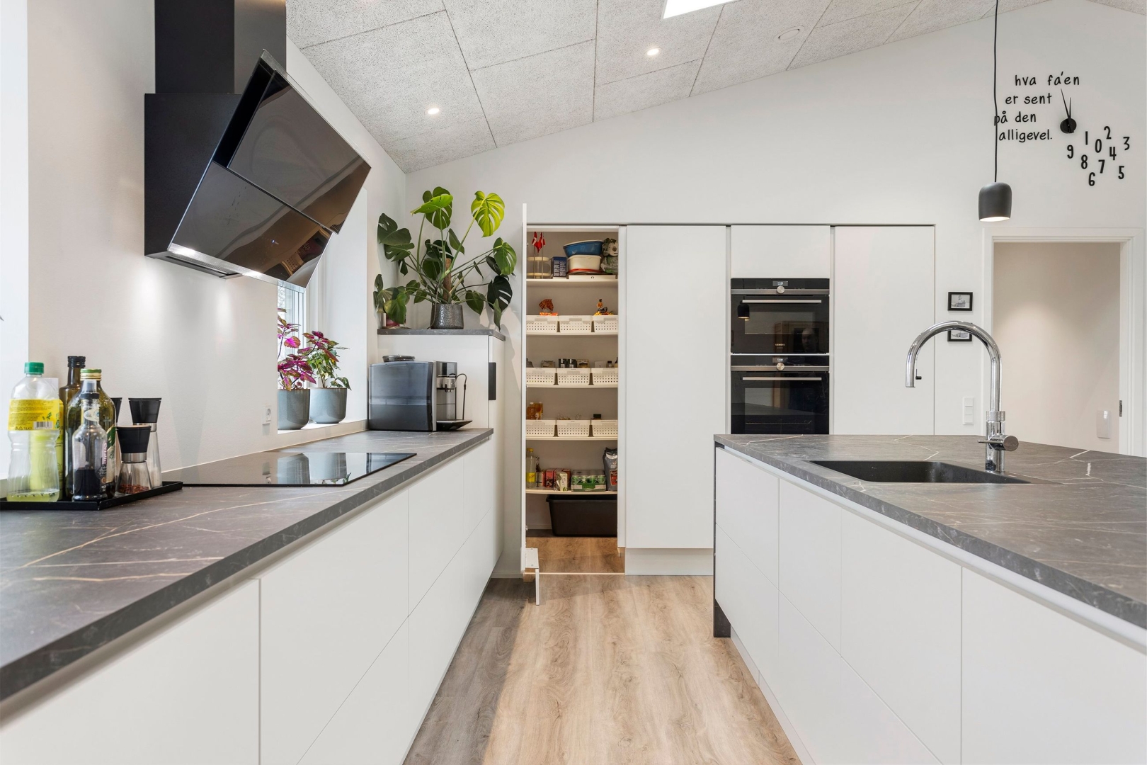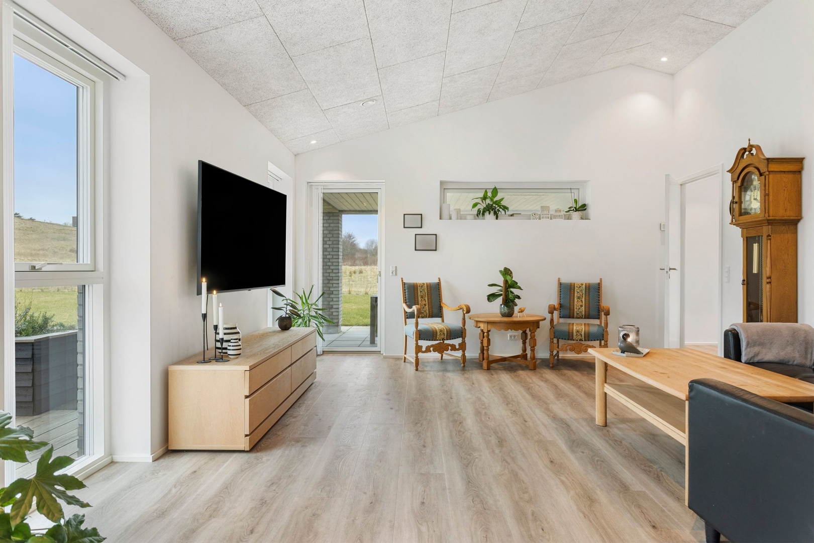 Materialevalget er gennemført - med troldtektlofter overalt og samme flotte vinylgulv med korkunderlag går igen i alle opholdsrum, mens bryggers og begge badeværelser er udført med ens klinkegulve.