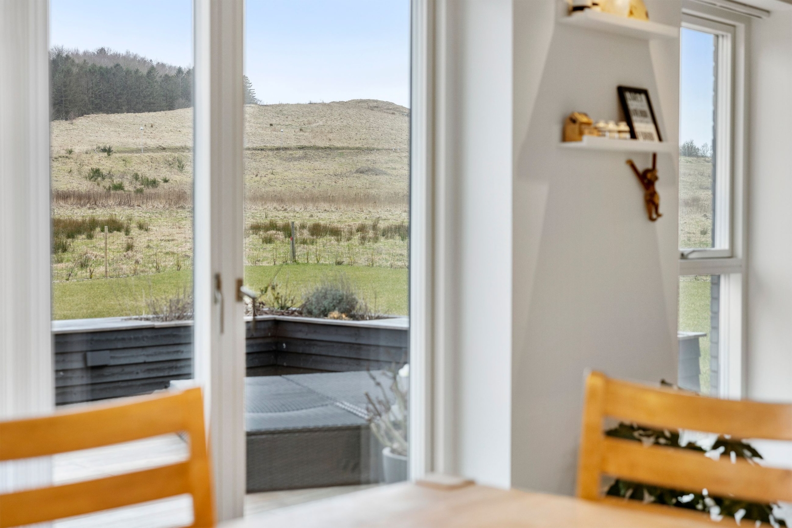 Køkken-alrummet er indrettet med et stilrent og tidløst Svanekøkken med hvide, grebsfrie låger. Bag en højskabslåge gemmer sig et praktisk viktualierum med god opbevaringsplads. En charmerende, muret alkove skaber et hyggeligt element i rummet til glæde for både børn og voksne. To dobbelte terrassedøre åbner ud til den sydvestvendte hårdttræsterrasse, hvor udsigten til naturens kuperede terræn kan nydes i fulde drag. Loftet er ført til kip, og to elektriske, appstyrede ovenlysvinduer giver et fantastisk lysindfald, særligt over køkkenøen.