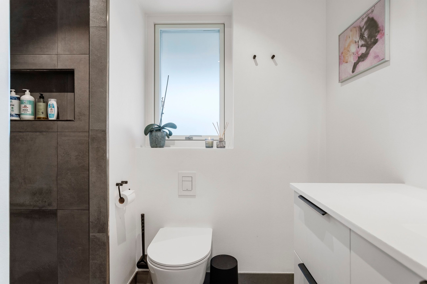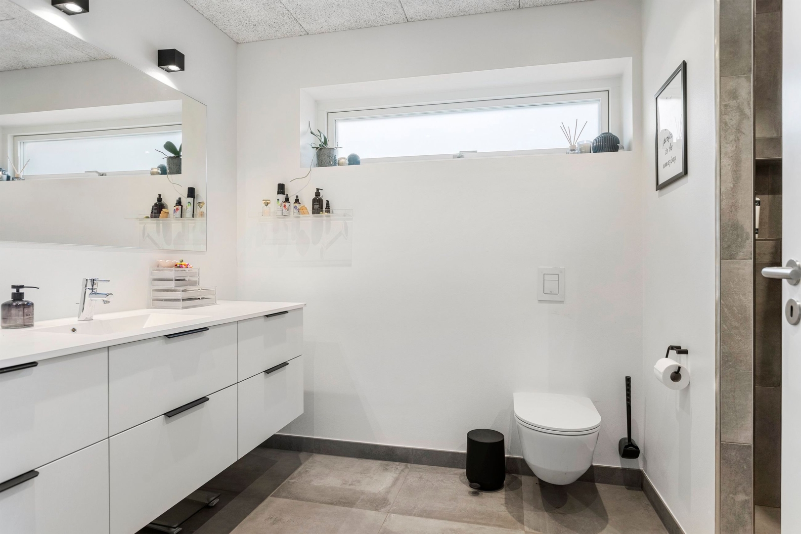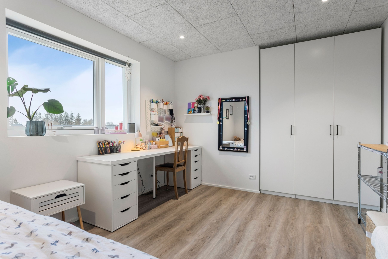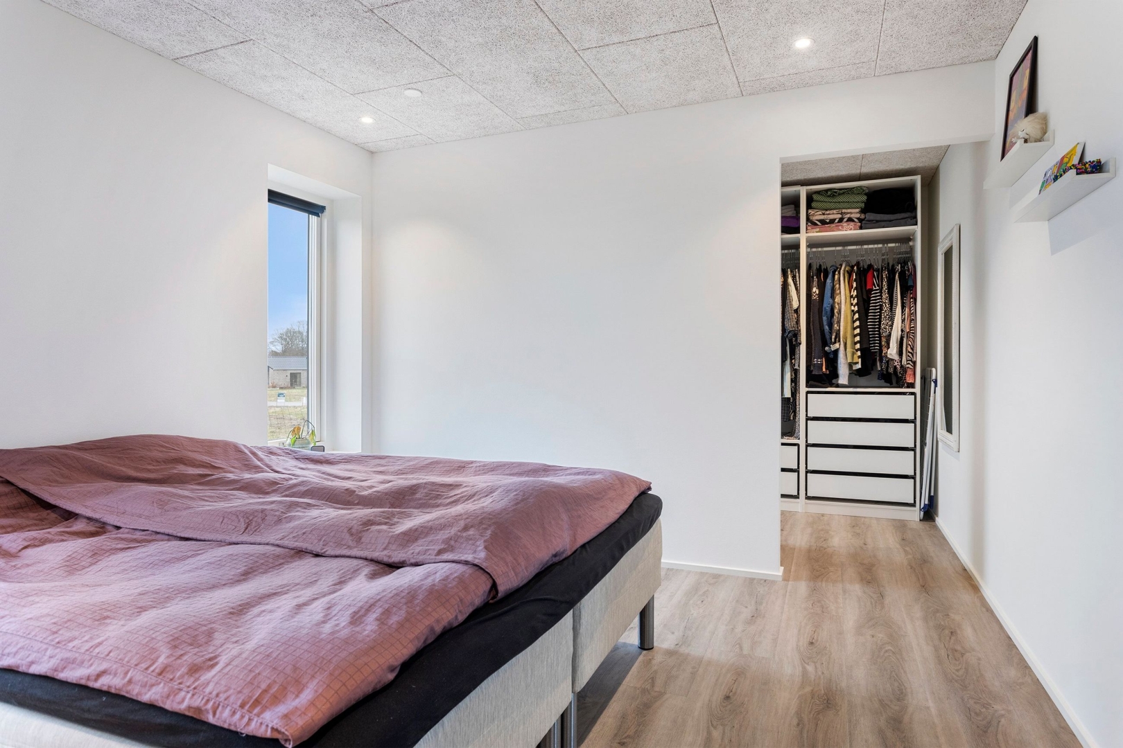 Opholdsstuen har også loft til kip og direkte adgang til den overdækkede terrasse, hvor naturoplevelsen fortsætter. Forældresoveværelset rummer både walk-in-closet og eget badeværelse med bruseniche med to brusere, indmuret sæbyhylde, væghængt toilet og Svane-inventar. Derudover findes et ekstra værelse, som kan anvendes som børneværelse, kontor eller gæsteværelse.