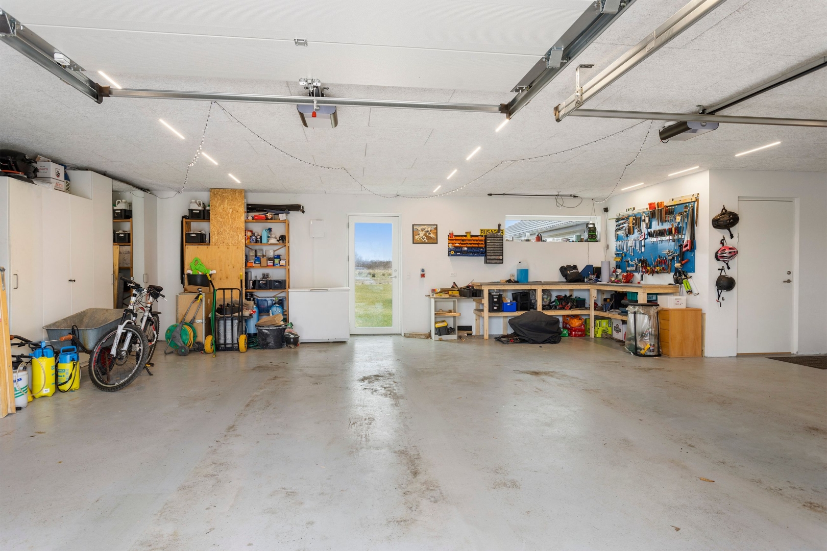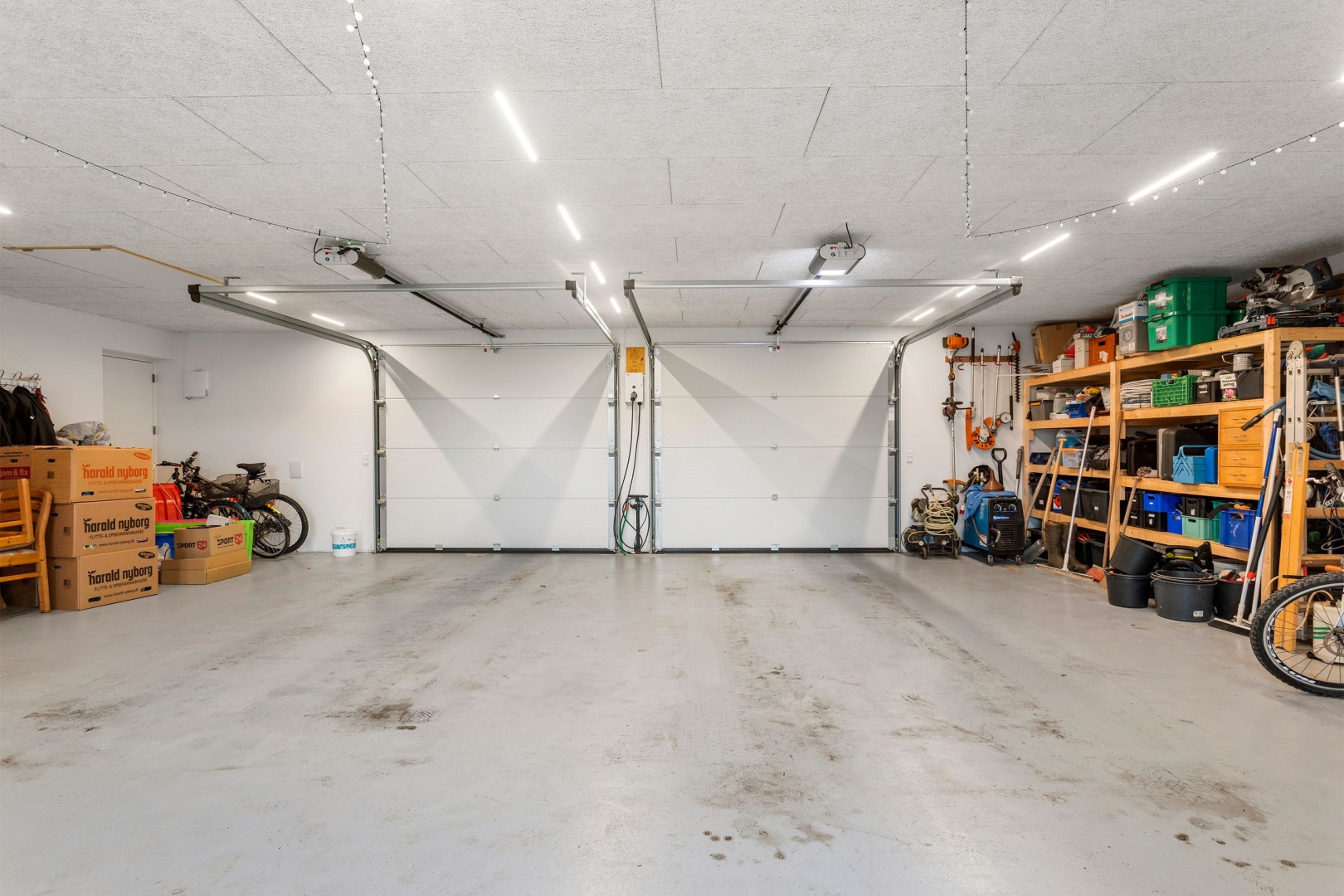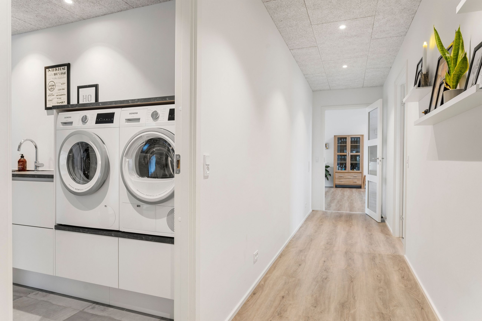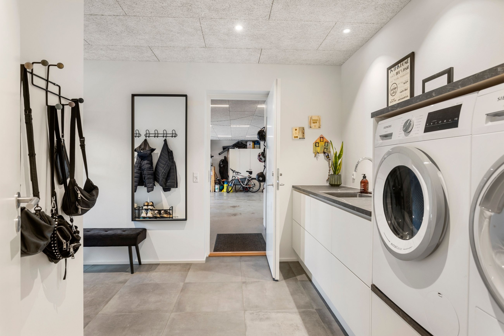 Indgangen foregår via et overdækket indgangsparti med adgang til både garage og det kombinerede entré- og bryggersrum. Her er der Svane-inventar, bord med vask, klinkegulv og ergonomisk placeret vaskemaskine og tørretumbler. Fra bryggerset er der direkte adgang til den rummelige garage##