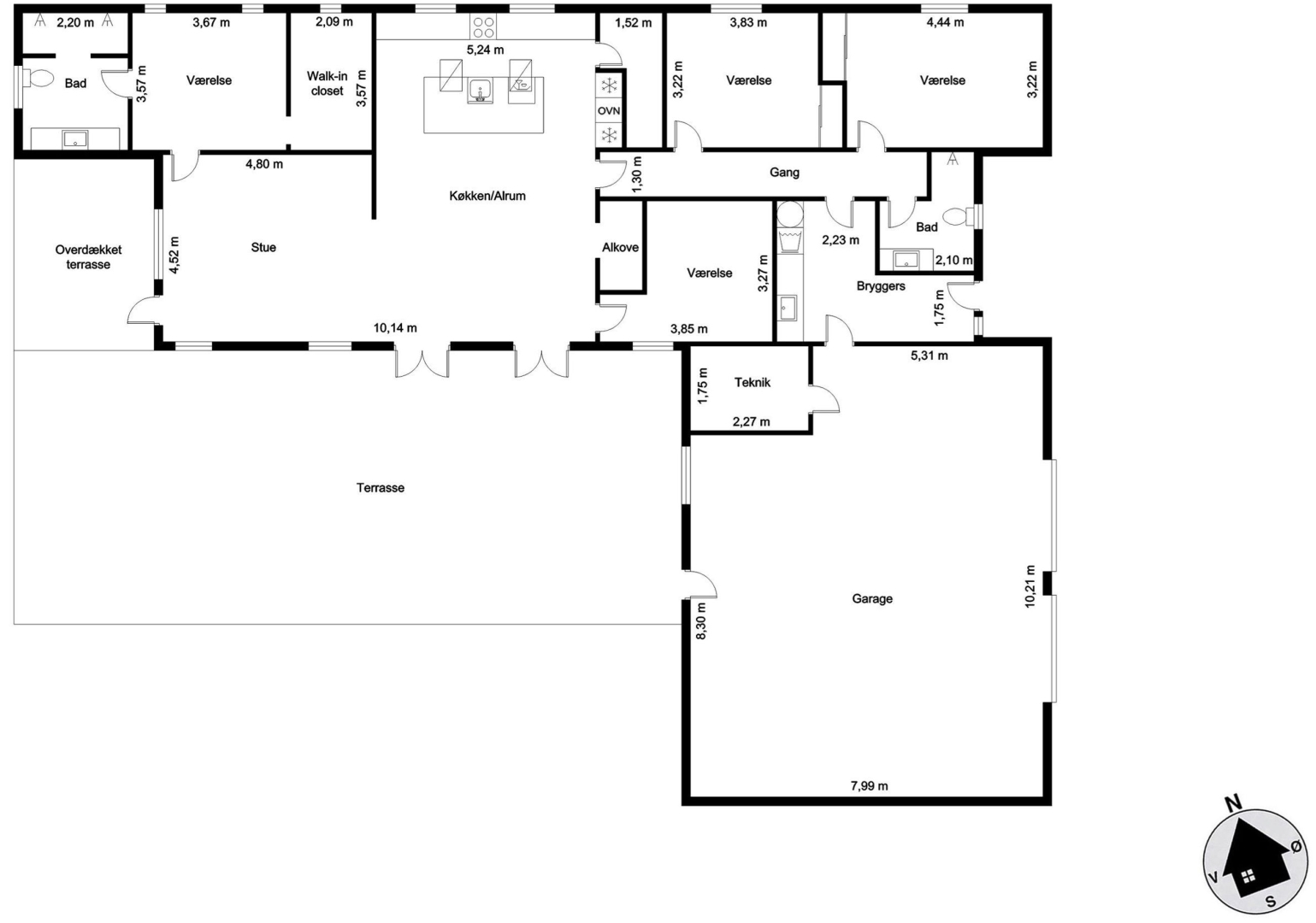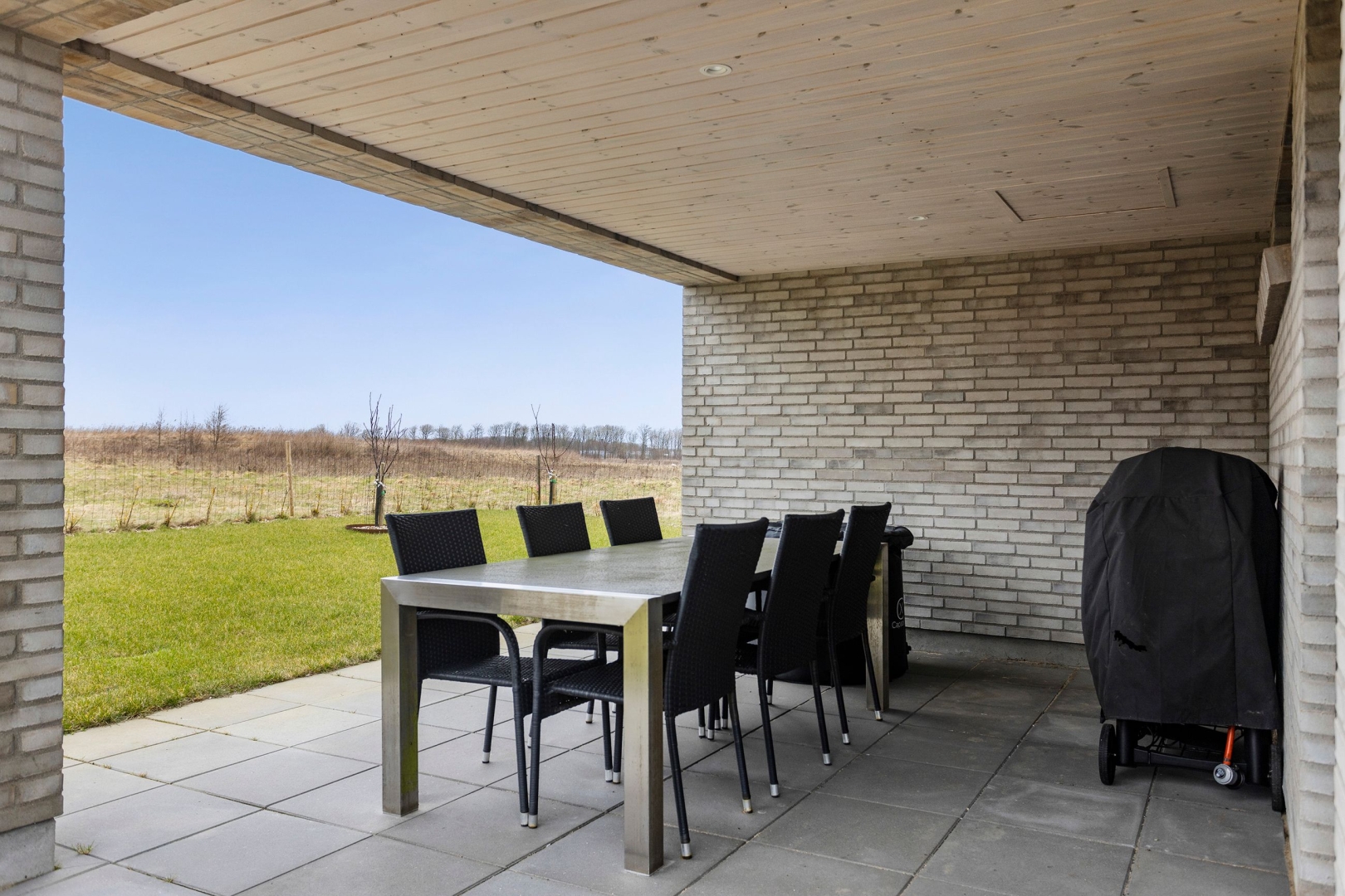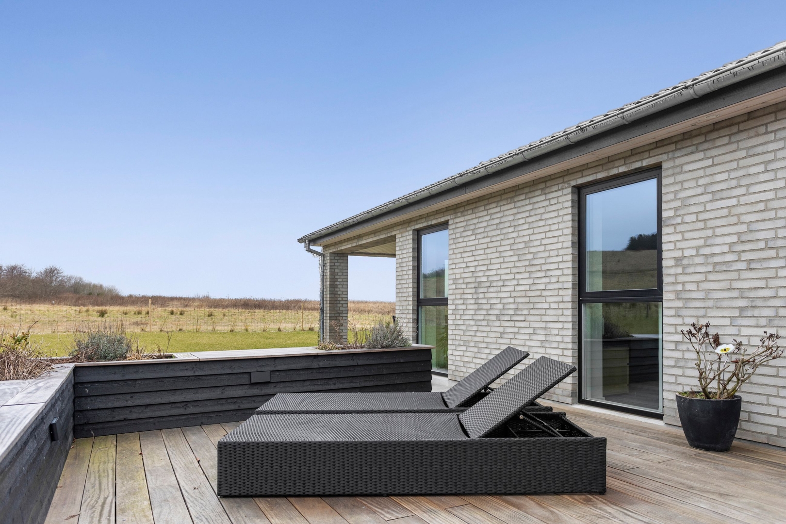 Med murede gavle og træ/alu-vinduer fra Rationel er der udvendigt lagt vægt på minimal bygnings vedligeholdelse. Og med den 977 m² store grund primært udlagt i græs og flisebelægning kræver den heller ikke den store opmærksomhed.