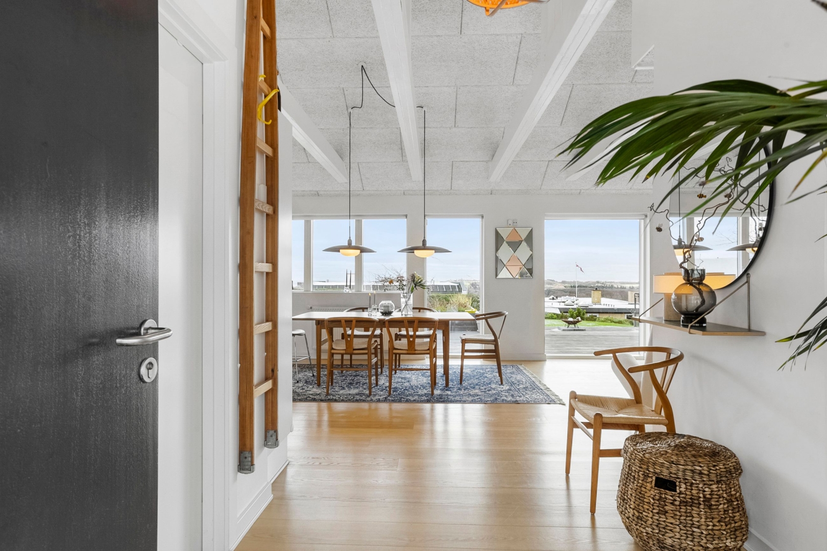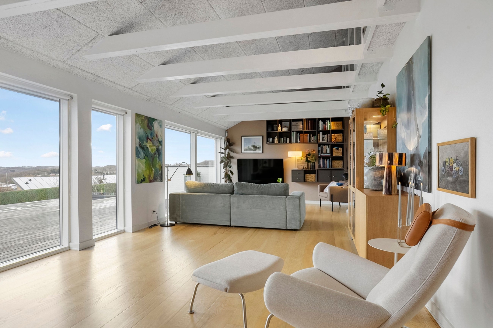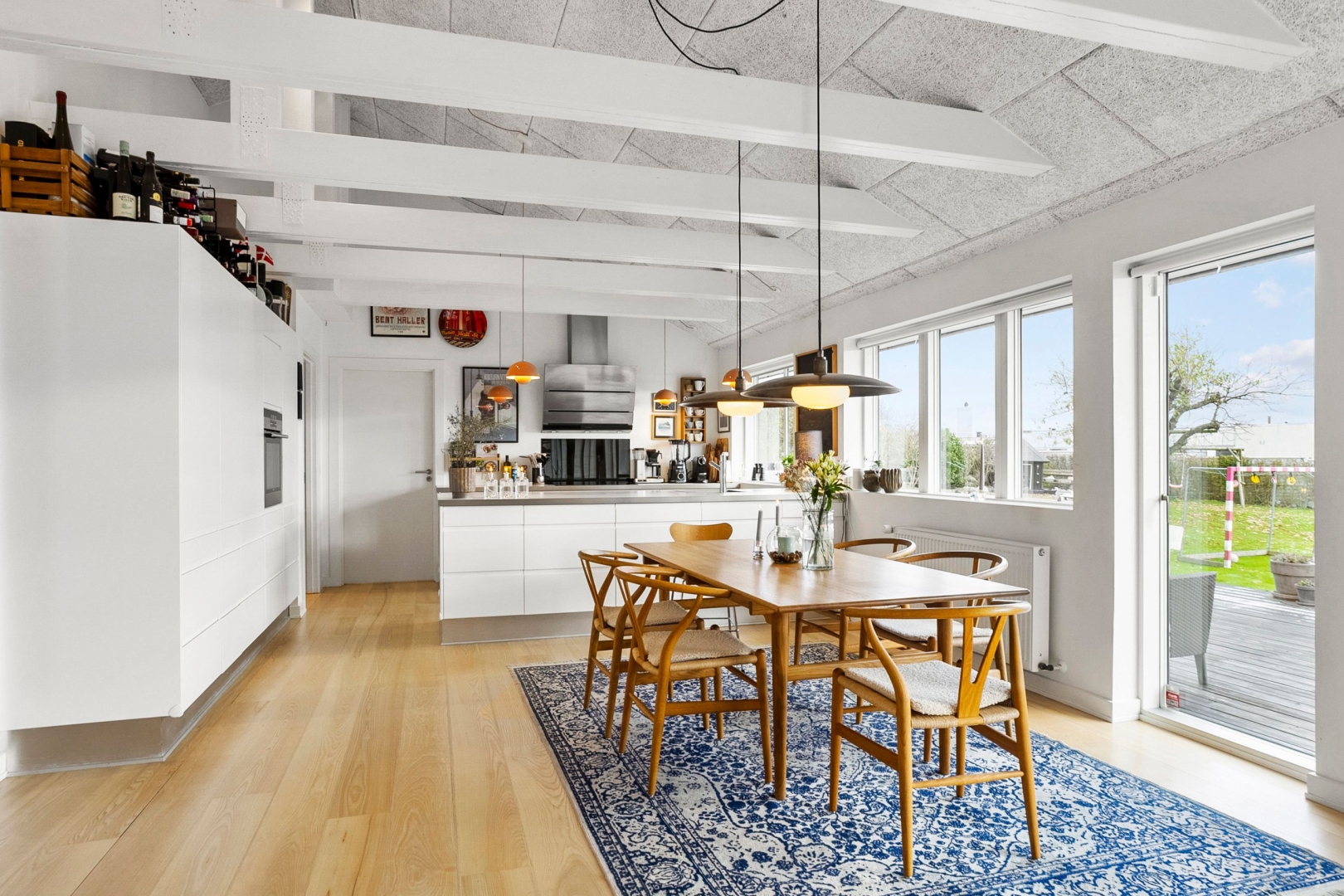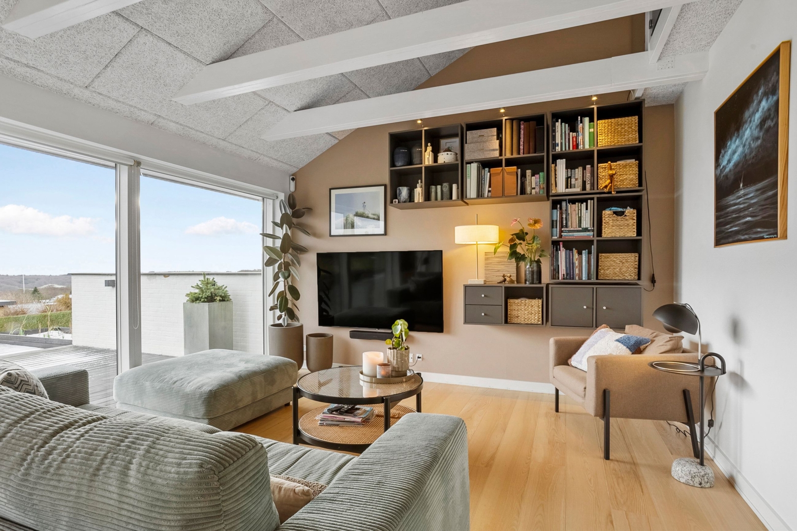 Indretningen byder på en præsentabel entré med skydedørsgarderobe og klinkegulv med gulvvarme. Herfra åbner boligen sig op i et fantastisk køkken/alrum/stue-miljø med synlige hanebånd, troldtektlofter, loftshældning, gulvvarme og store østvendte vinduespartier, der lader den smukke udsigt strømme ind. Køkkenet står som et klassisk, tidløst og grebsfrit design i hvide, glatte fronter. Hertil kommer et stort og lækkert badeværelse med rummelig bruseniche, gulvvarme, troldtektloft med spots, god skabsplads og væghængt toilet. Desuden findes et børneværelse med trægulv og skabsplads samt et soveværelse med skydedørsgarderobe.
