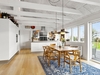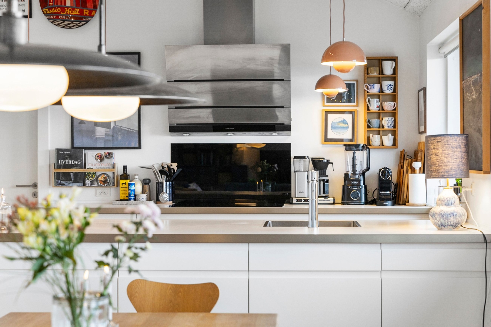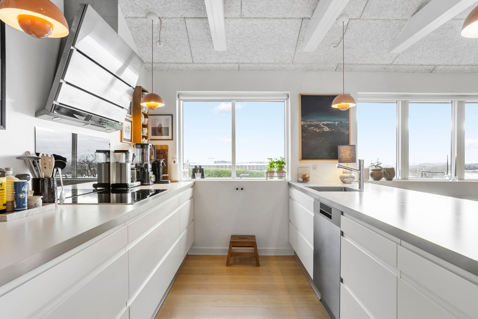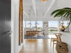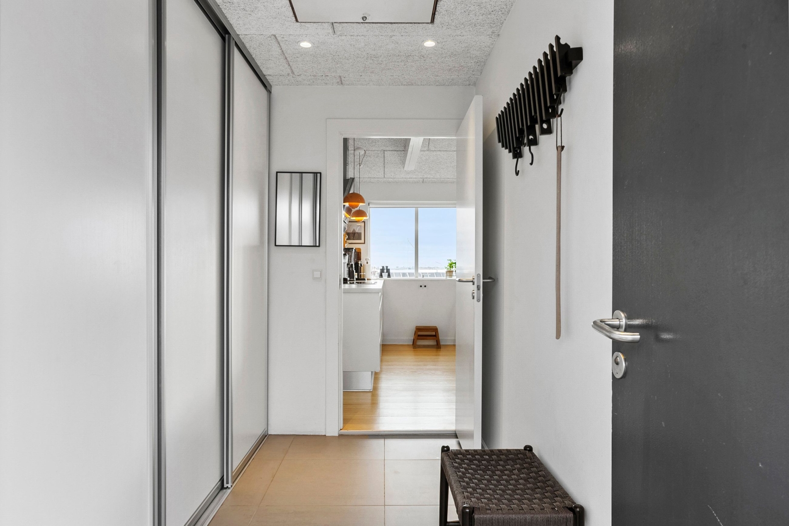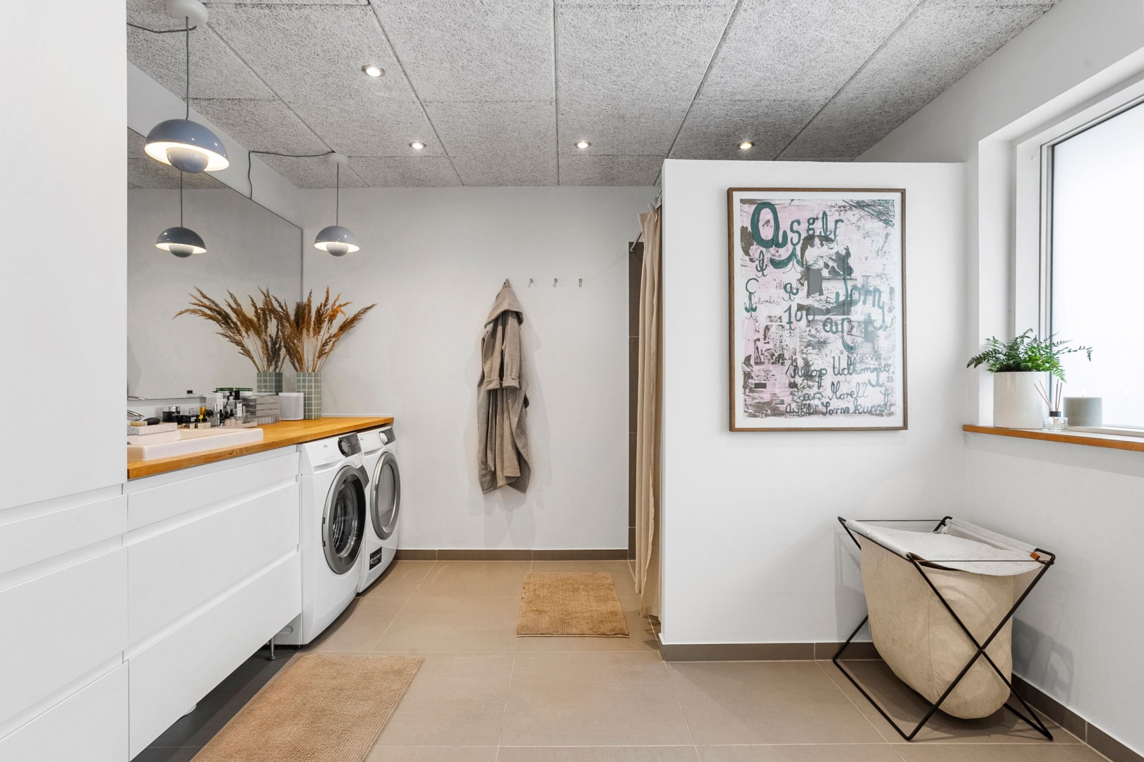 Indretningen byder på en præsentabel entré med skydedørsgarderobe og klinkegulv med gulvvarme. Herfra åbner boligen sig op i et fantastisk køkken/alrum/stue-miljø med synlige hanebånd, troldtektlofter, loftshældning, gulvvarme og store østvendte vinduespartier, der lader den smukke udsigt strømme ind. Køkkenet står som et klassisk, tidløst og grebsfrit design i hvide, glatte fronter. Hertil kommer et stort og lækkert badeværelse med rummelig bruseniche, gulvvarme, troldtektloft med spots, god skabsplads og væghængt toilet. Desuden findes et børneværelse med trægulv og skabsplads samt et soveværelse med skydedørsgarderobe.