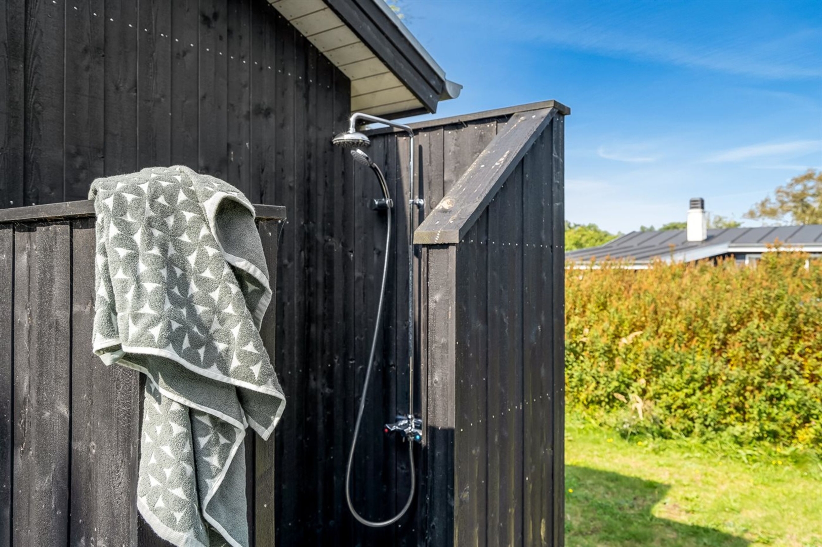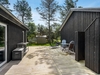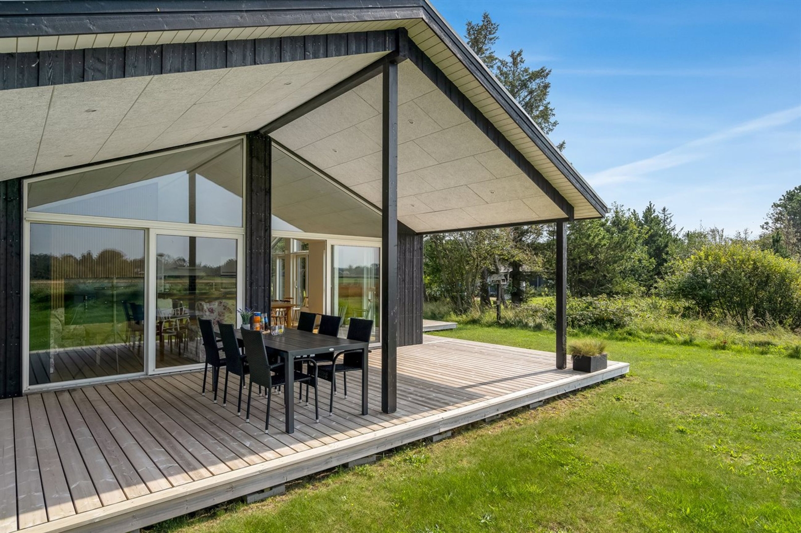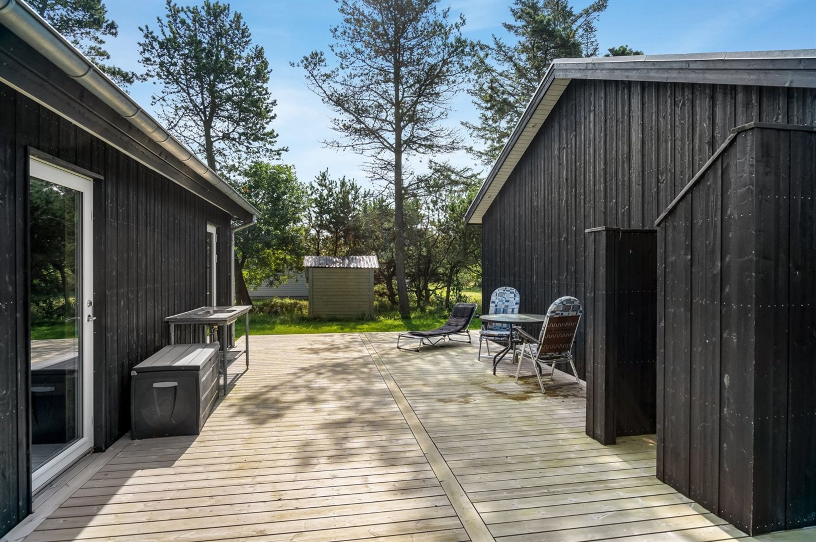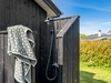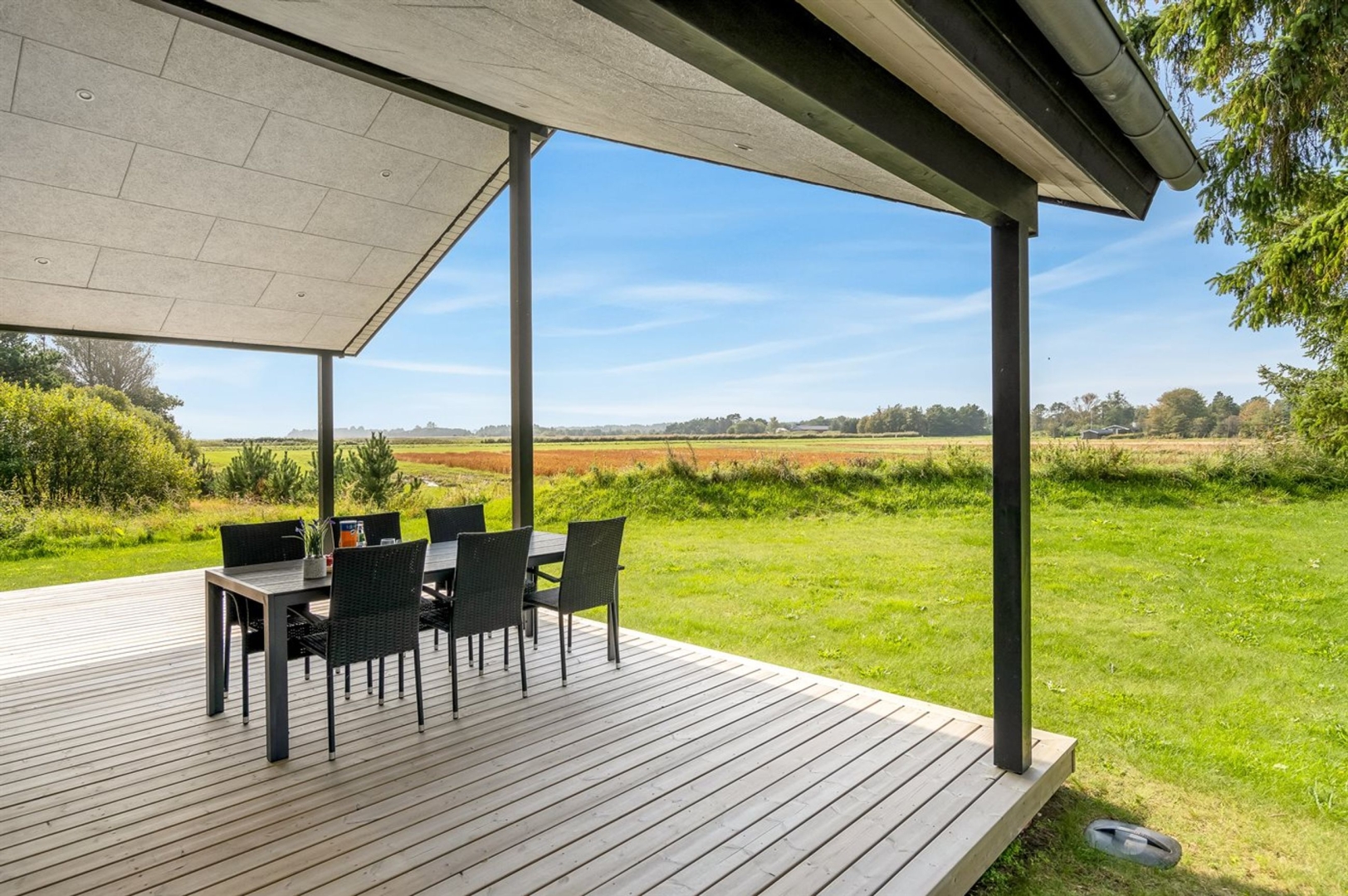 Udendørs er rammerne mindst lige så indbydende: En imprægneret træterrasse hele vejen rundt om huset, lækker terrasse mellem hus og udhus samt udendørs bruser ideel efter strandturen. Den overdækkede terrasse mod vest er udført med spots og Troldtekt-loft og skaber en stemningsfuld ramme for lange sommeraftener.