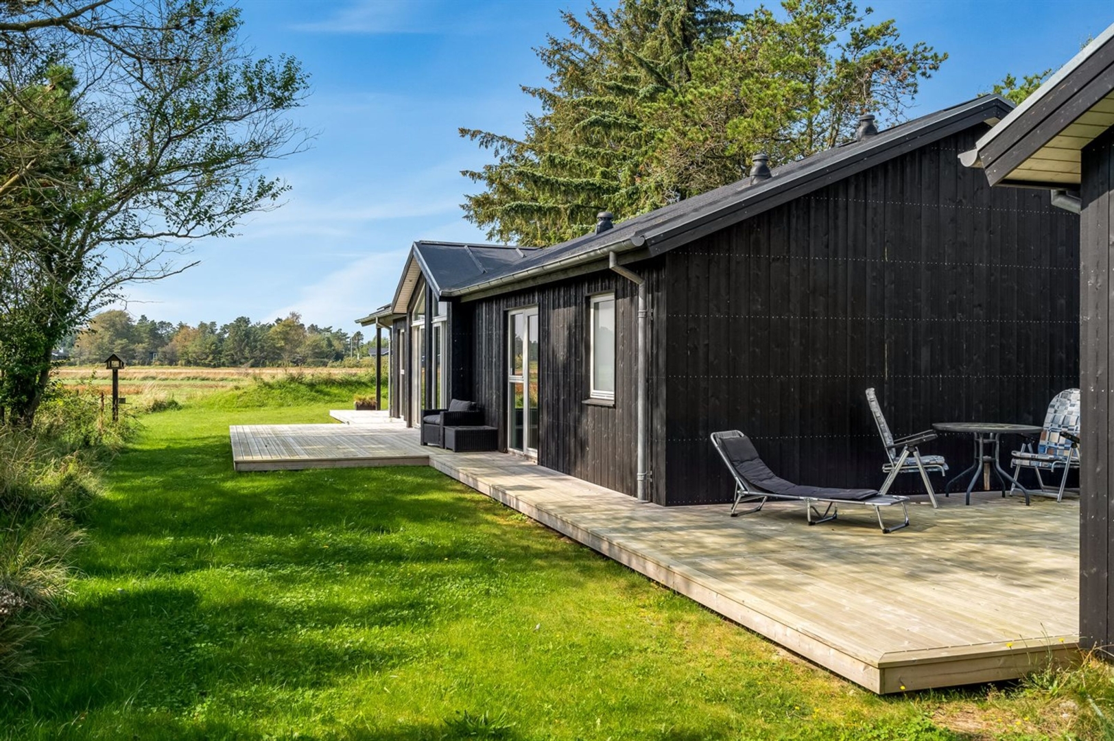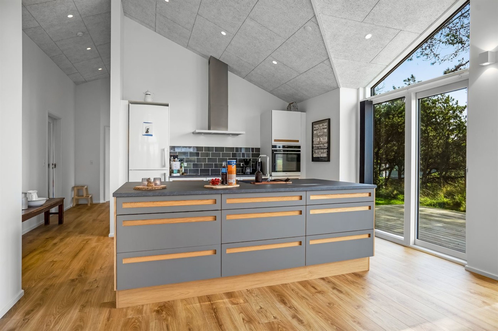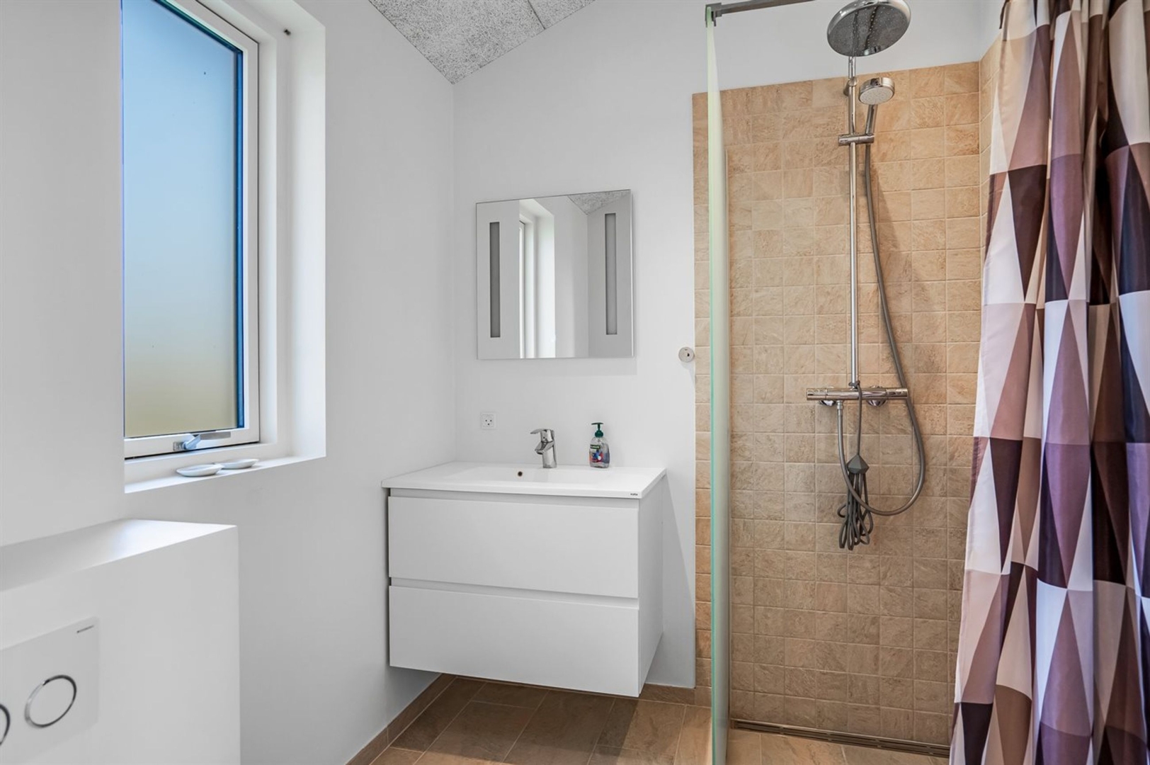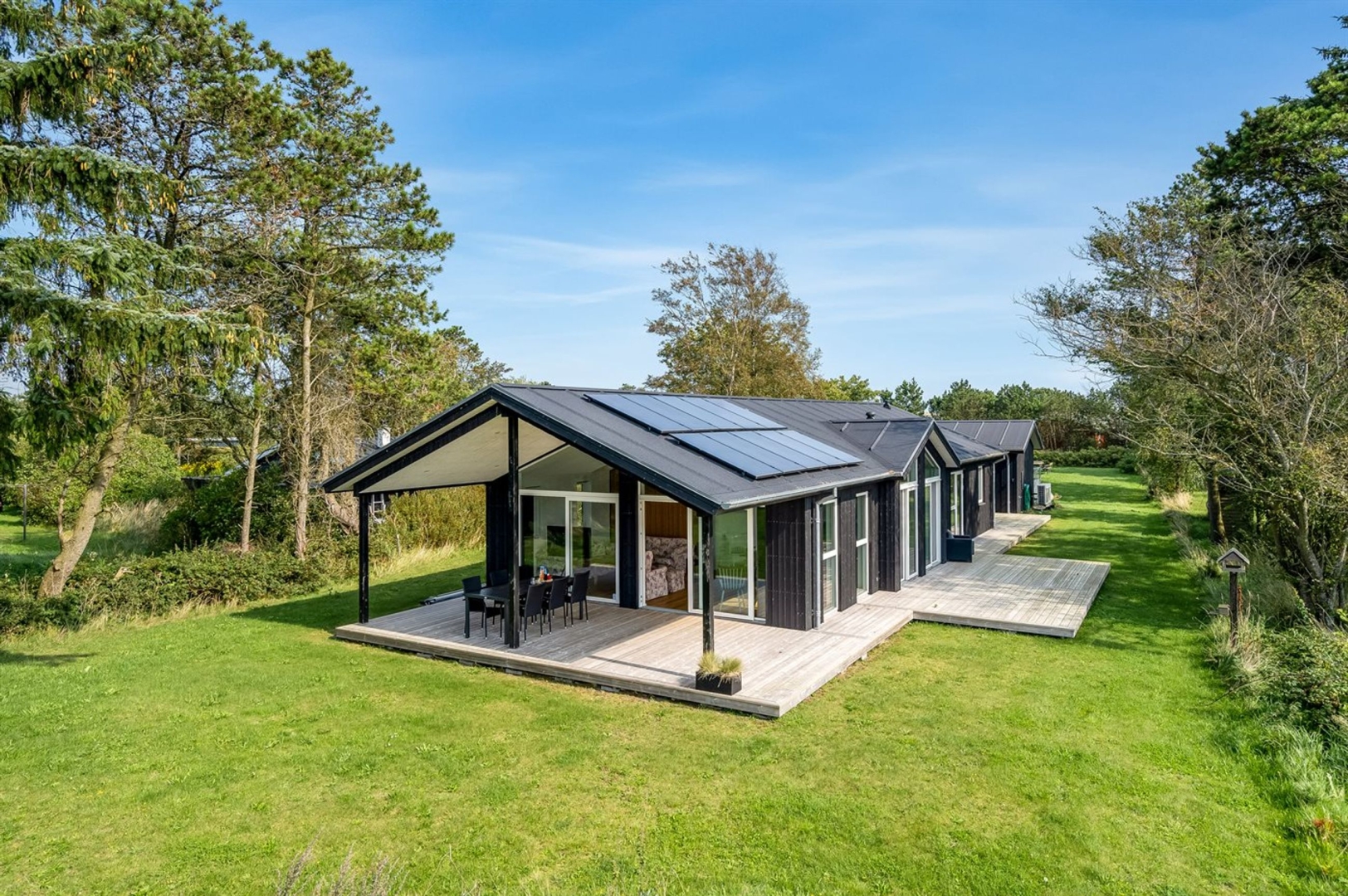 Udendørs er rammerne mindst lige så indbydende: En imprægneret træterrasse hele vejen rundt om huset, lækker terrasse mellem hus og udhus samt udendørs bruser ideel efter strandturen. Den overdækkede terrasse mod vest er udført med spots og Troldtekt-loft og skaber en stemningsfuld ramme for lange sommeraftener.