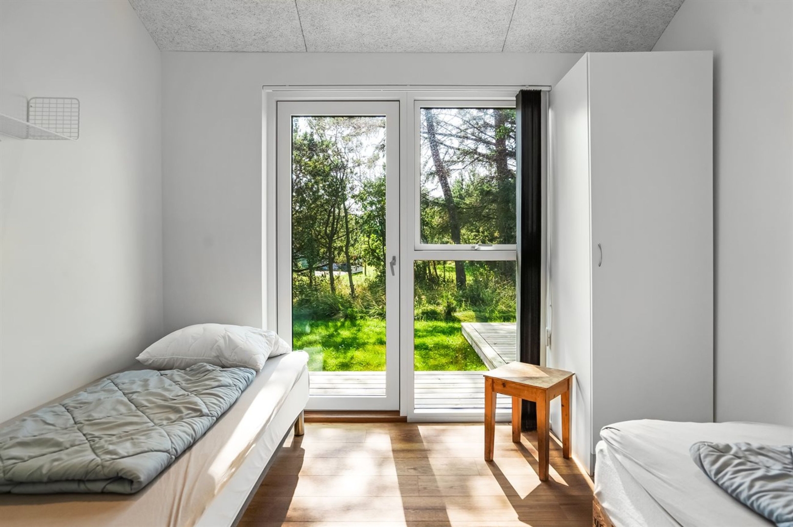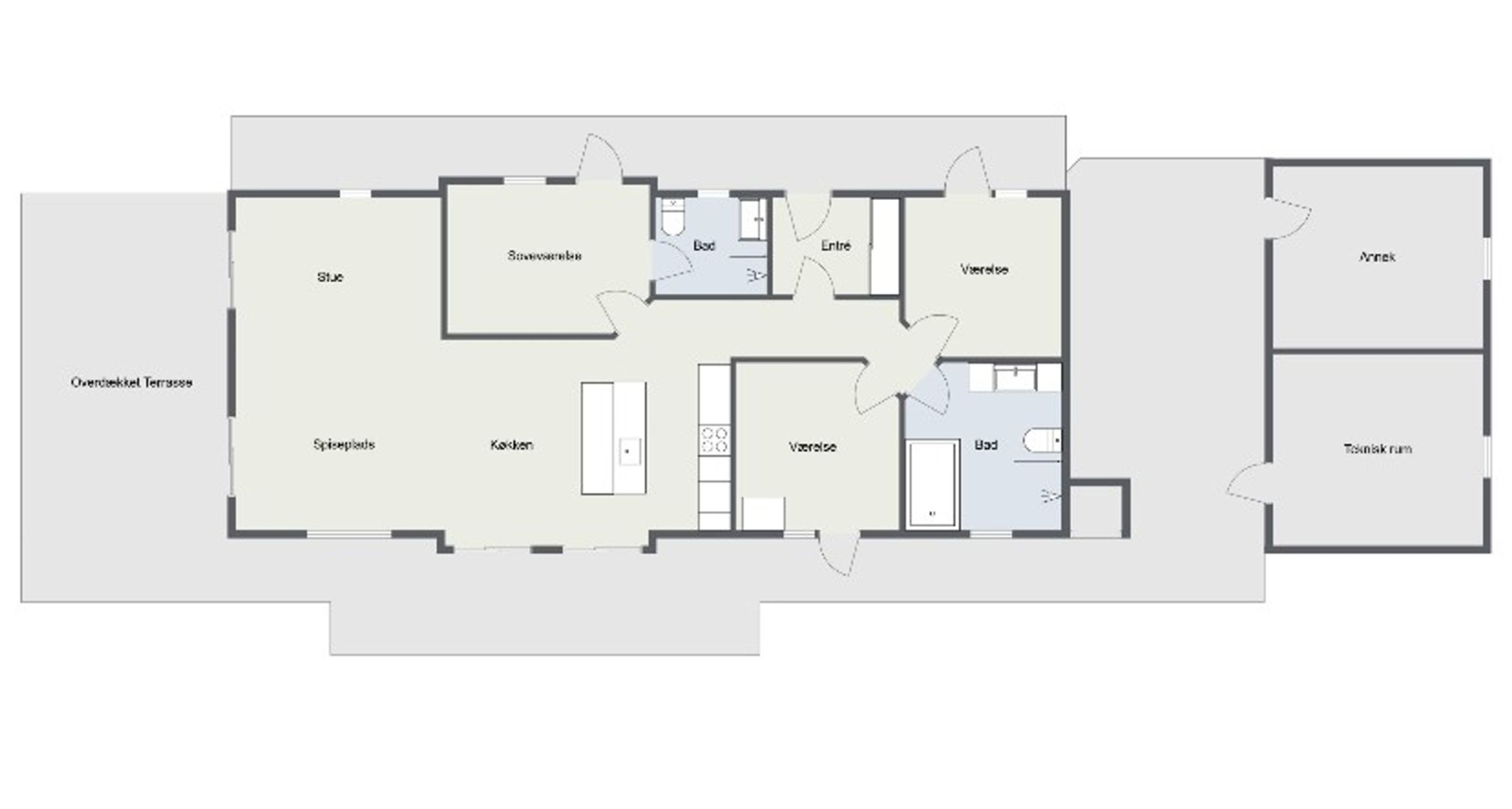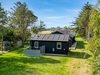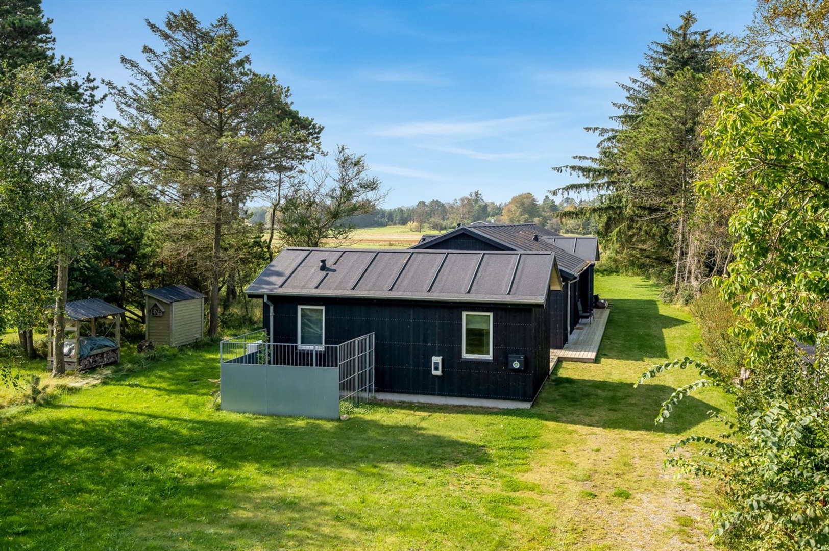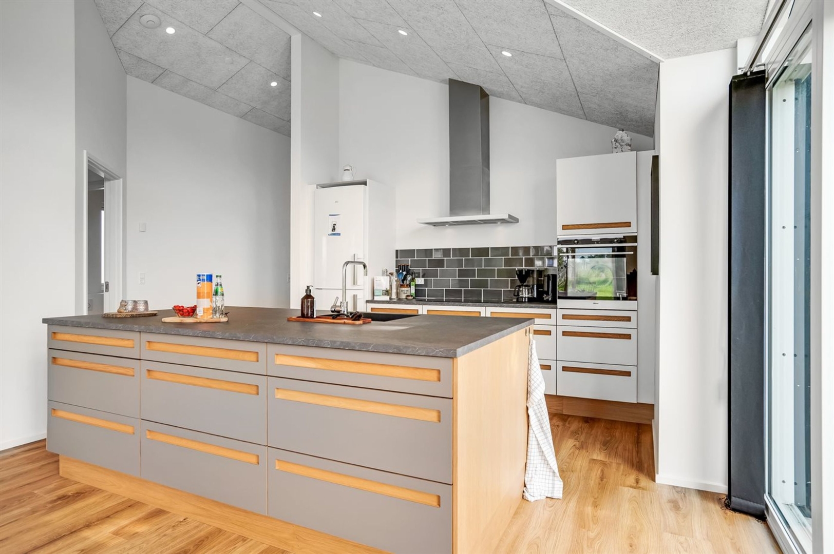 Udendørs er rammerne mindst lige så indbydende: En imprægneret træterrasse hele vejen rundt om huset, lækker terrasse mellem hus og udhus samt udendørs bruser ideel efter strandturen. Den overdækkede terrasse mod vest er udført med spots og Troldtekt-loft og skaber en stemningsfuld ramme for lange sommeraftener.