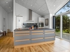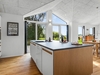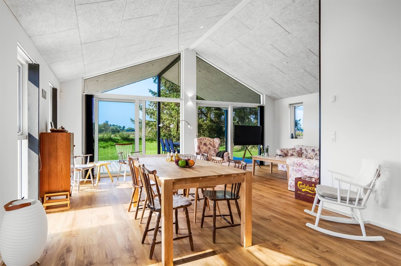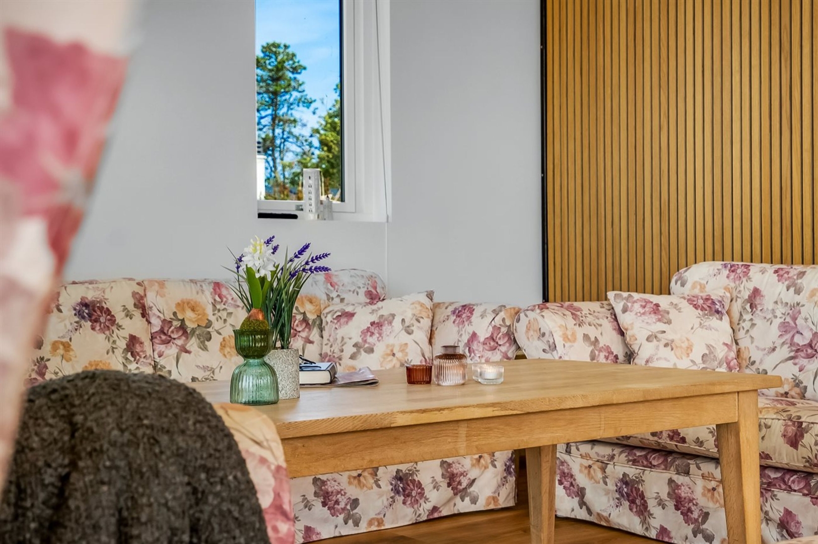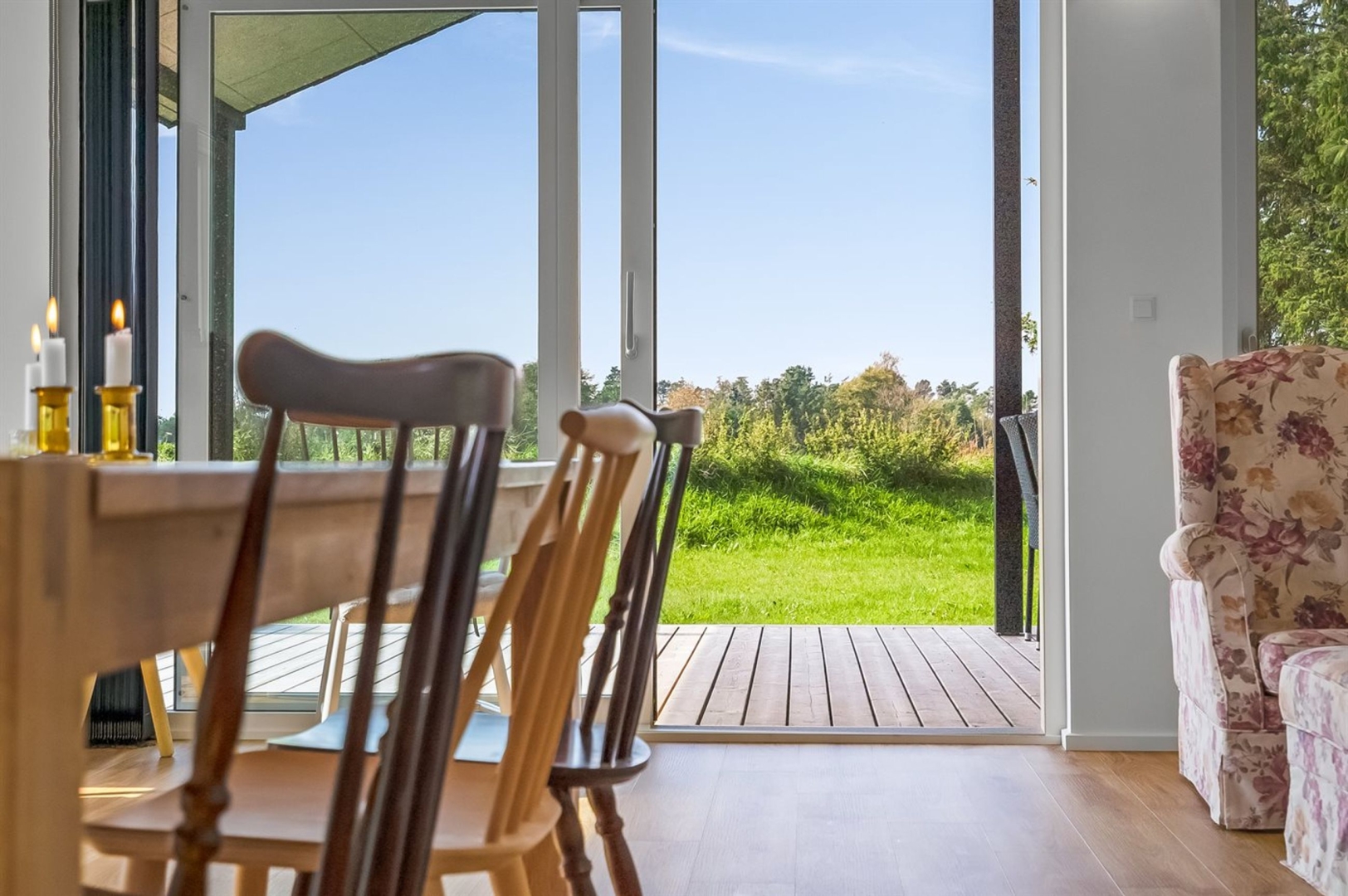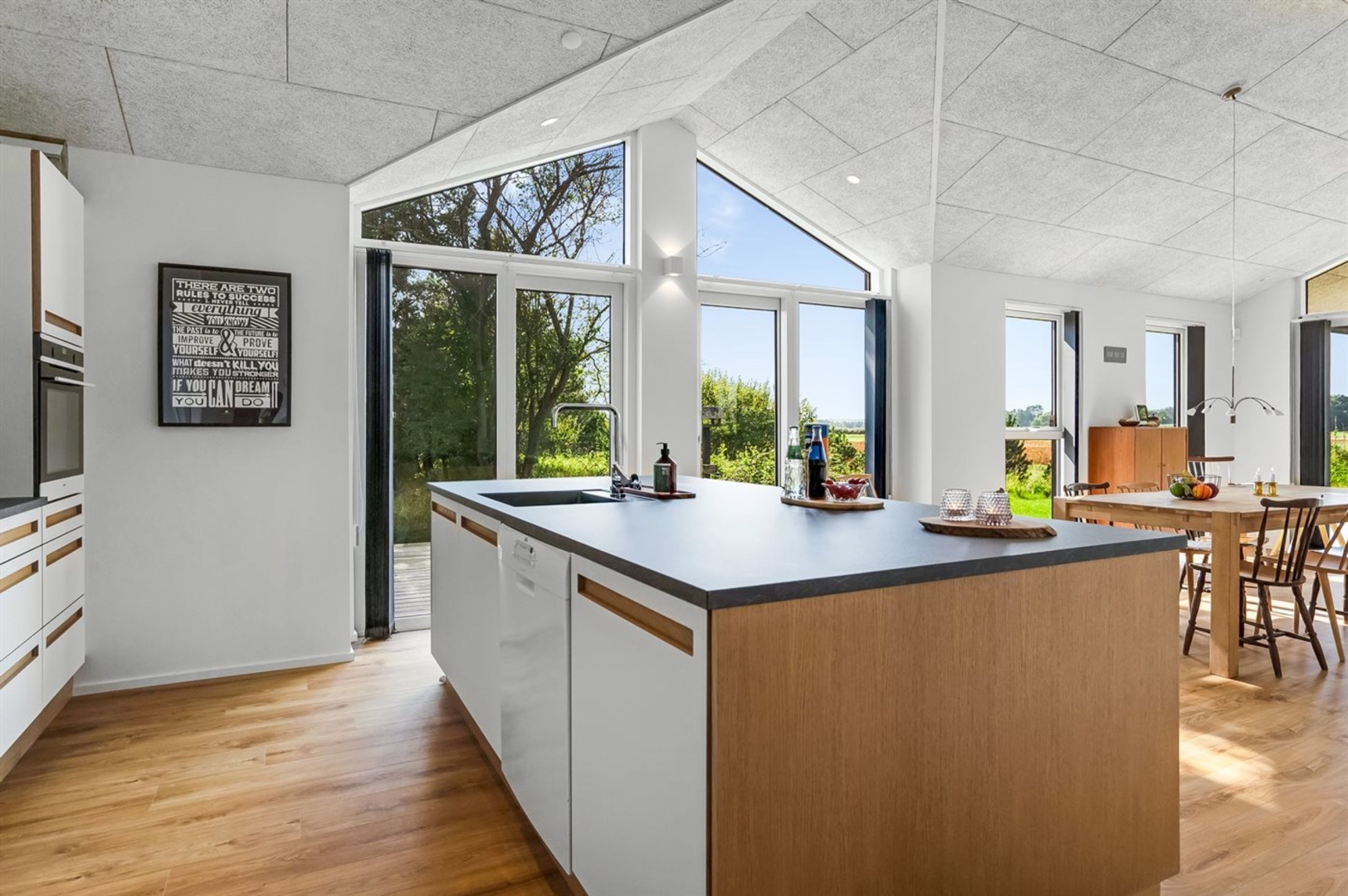 Det stilrene JKE-køkken ligger i åben forbindelse med spiseplads og stue og har skydedør til den sydvendte terrasse. Stuen byder på et fantastisk lysindfald og skydedør til den overdækkede vestvendte terrasse, hvor aftensolen og udsigten over åbne marker kan nydes i fulde drag.