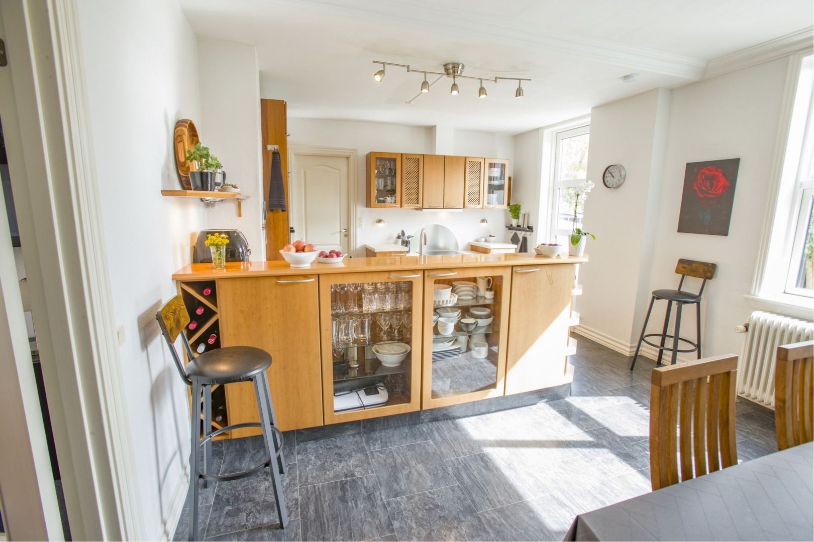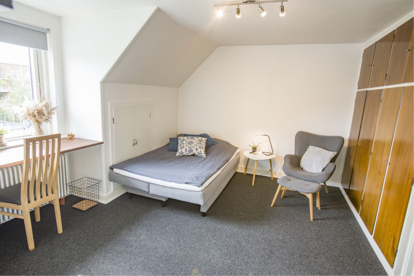 Stueetagen byder på et charmerende soveværelse med stuk samt et stort spisekøkken, der åbner op til en hyggelig opholdsstue gennem dobbelte franske døre. Fra køkkenet er der direkte udgang til en lukket, flisebelagt gårdhave og en velanlagt sydøstvendt have med en skovlignende bøg afgrænsning mod øst perfekt til afslapning og hyggelige stunder.