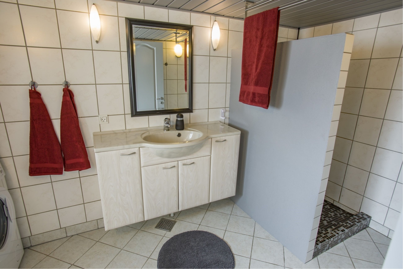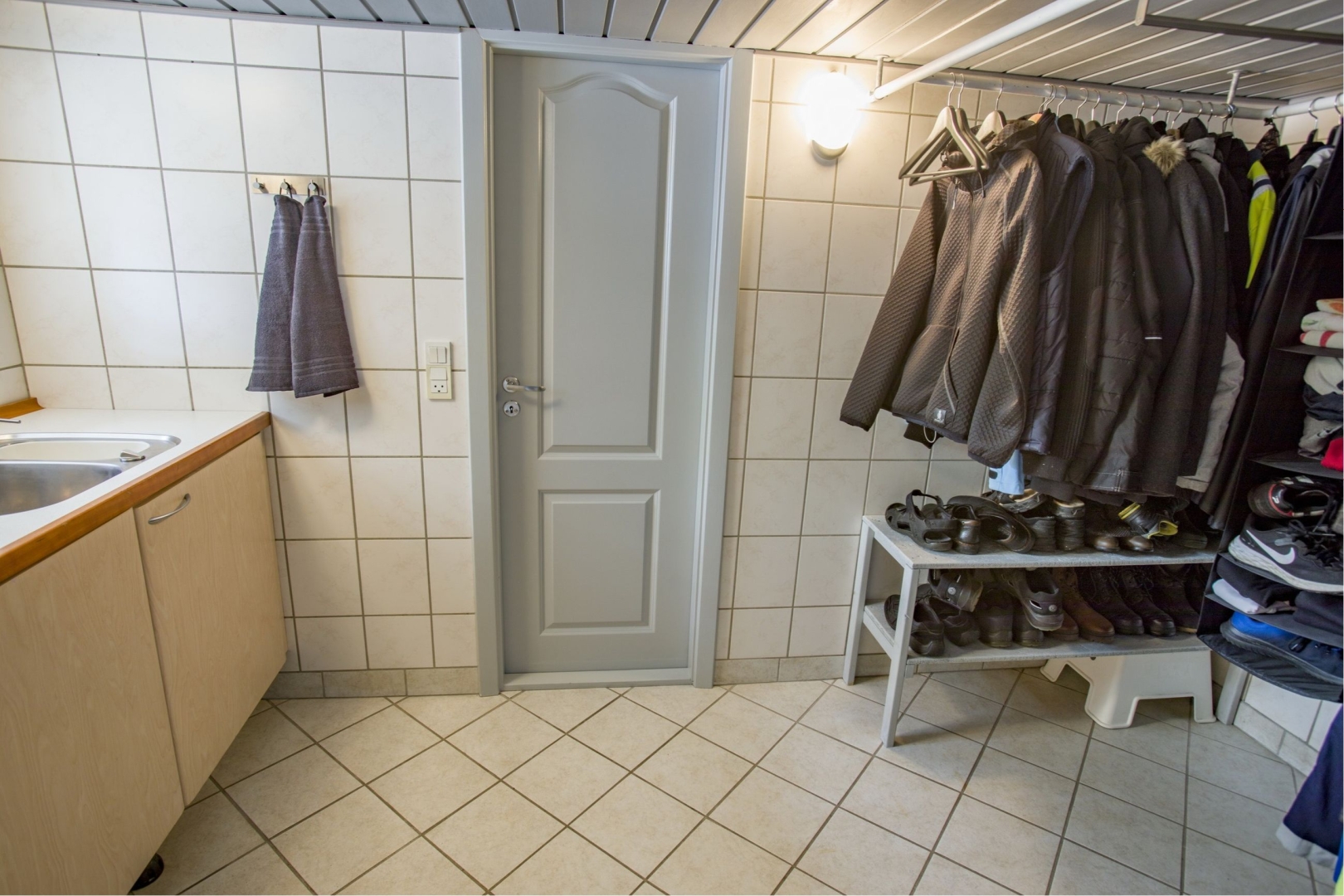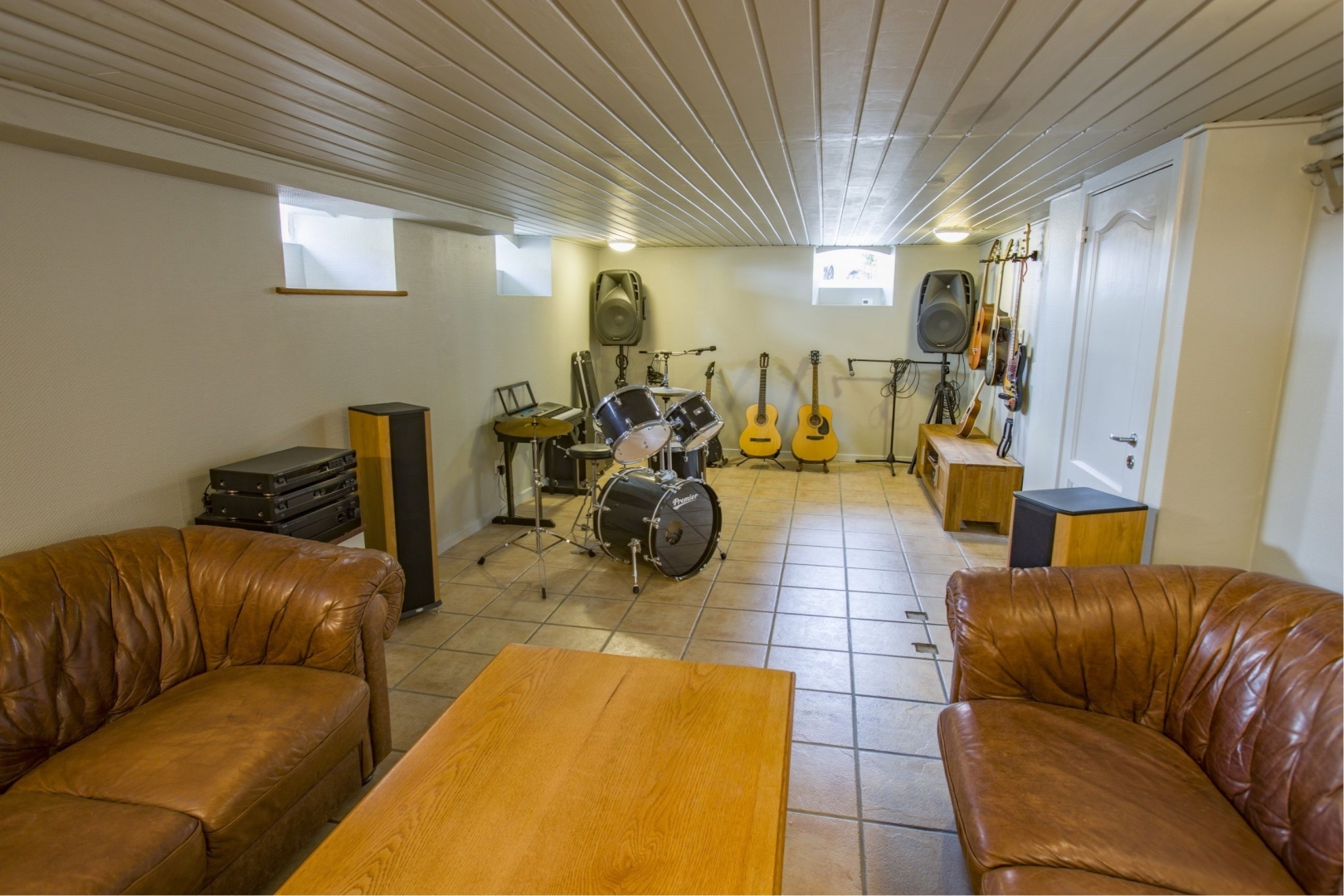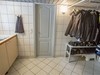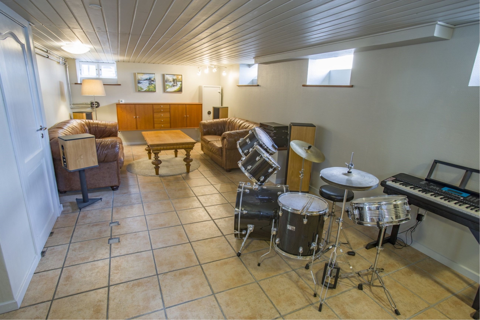 Kælderen rummer flere praktiske rum, herunder en mellemgang, et kontor, et aktivitetsrum med klinkegulv, teknikrum og badeværelse med bruseniche og installeret vaskesøjle. Derudover er der et walk-in closet med bord, vask og opbevaringsmuligheder. Der er gulvvarme i flere rum i kælderen.