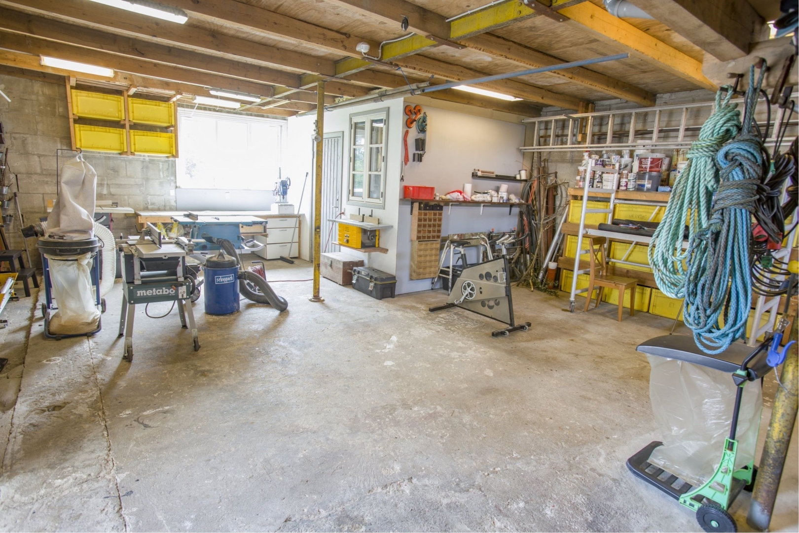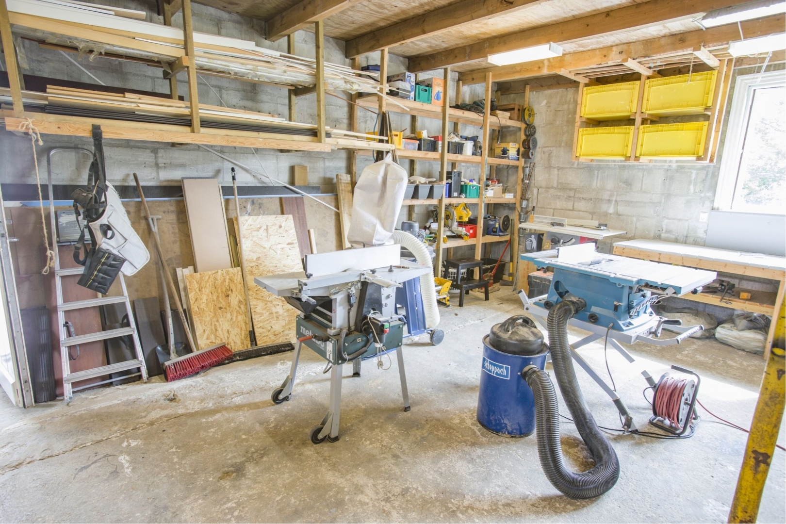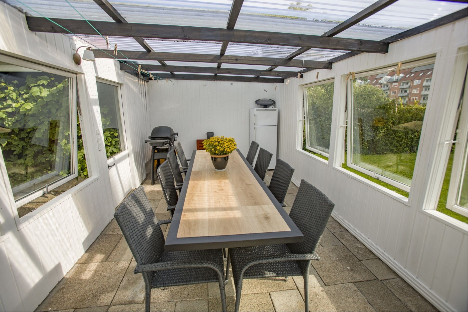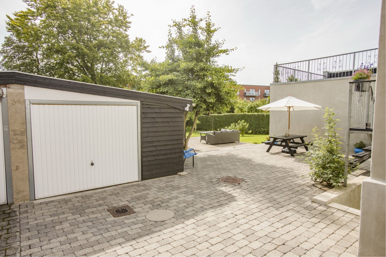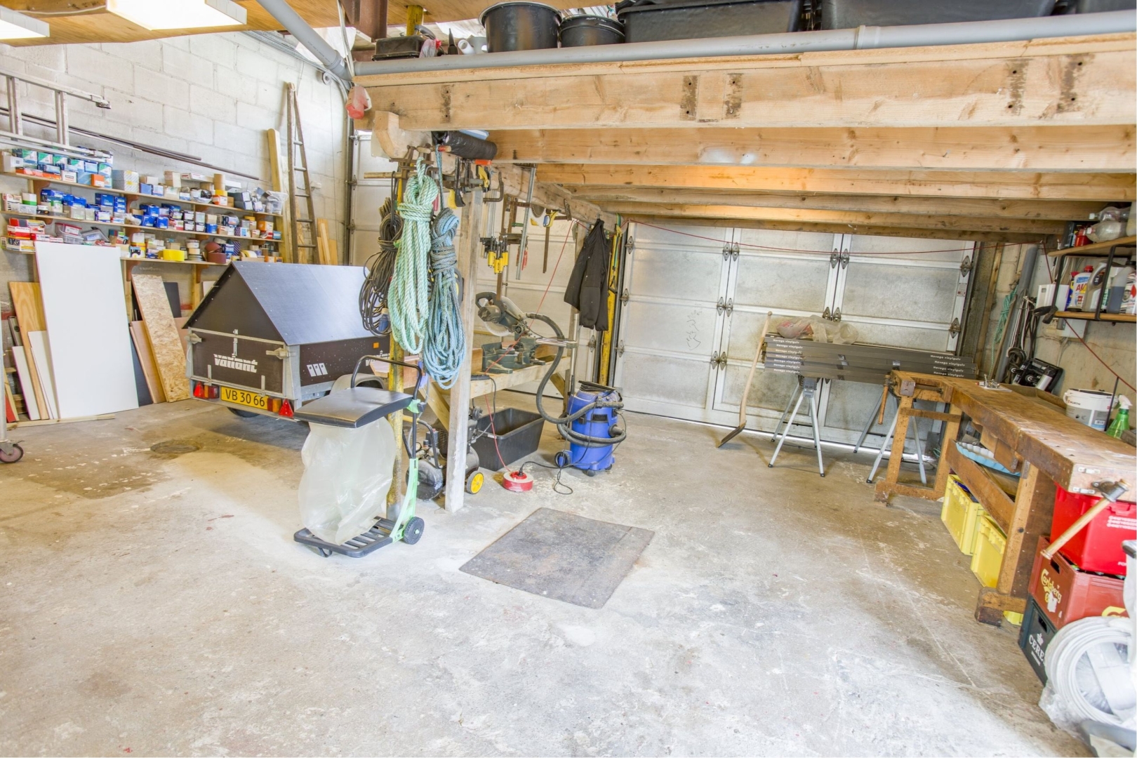 I tilknytning til hovedhuset finder du en garage, et havehus og et redskabsrum. Ejendommen inkluderer også en stor tidligere lastvognsgarage på ca. 70 m², der nu fungerer som værksted. Garagen har et aflåseligt værktøjsrum samt en indskudt etage, der anvendes til opbevaring af materialer m.v. De to aluporte gør adgangen til garageanlægget velegnet til den kreative handyman.
