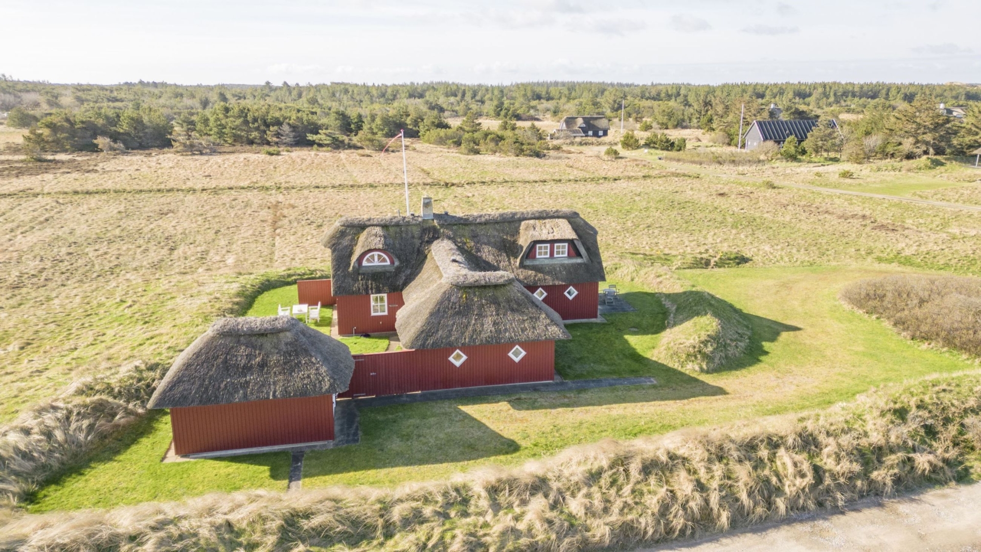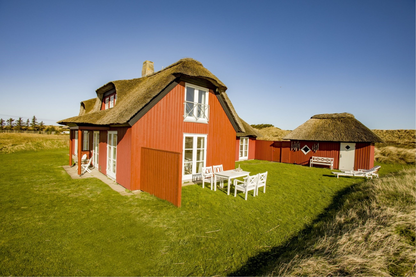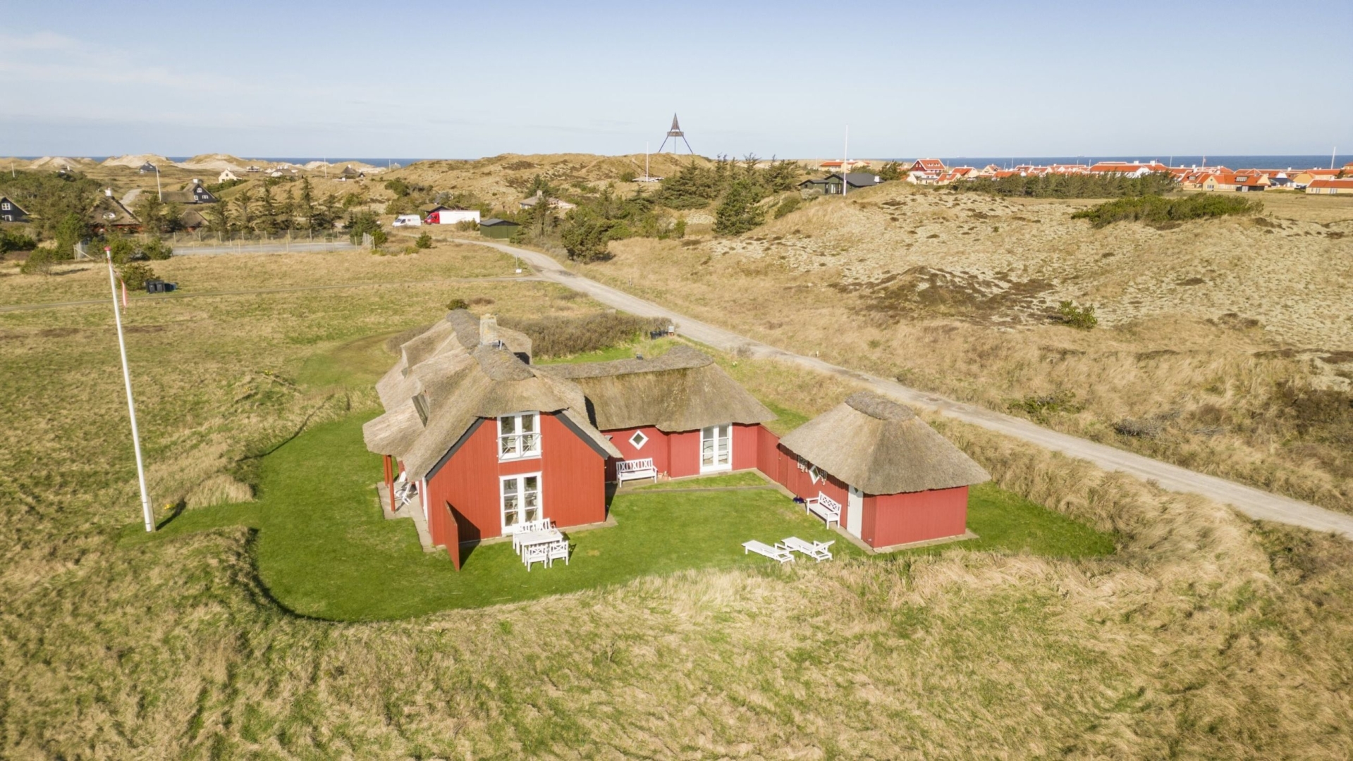 Yderligere er der garagebygning i samme idylliske og charmerende stil som sommerhuset med tilhørende udhus. Udenfor venter en velholdt have fyldt med idyl og ugeneret grund som afskærmes af klit - herunder en flagstang samt flere terrasser, der giver mulighed for afslappende solrige dage.
