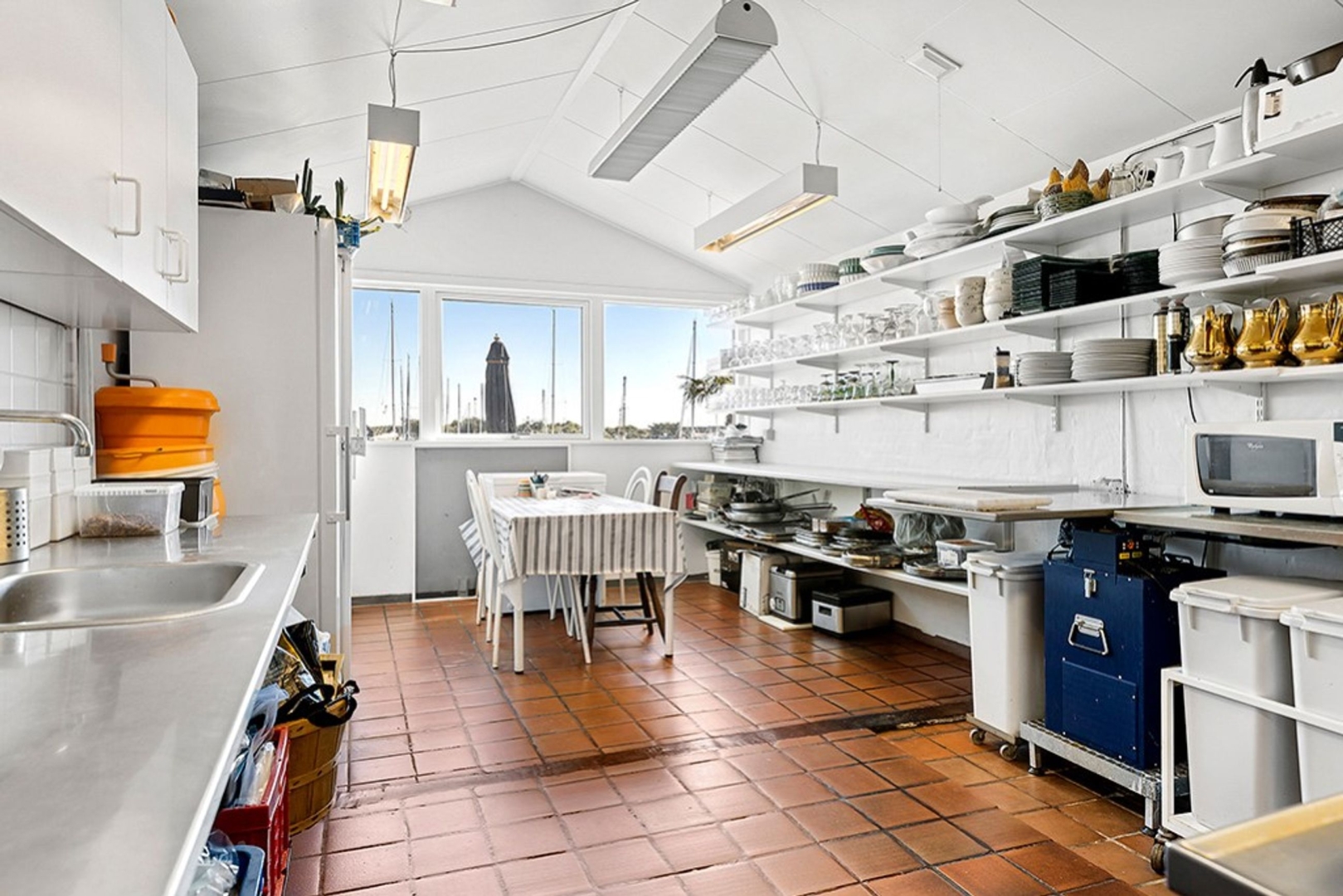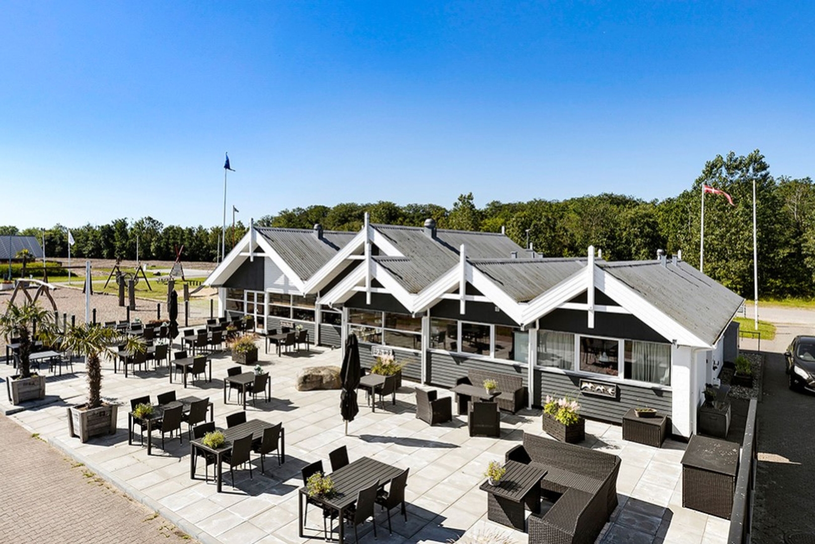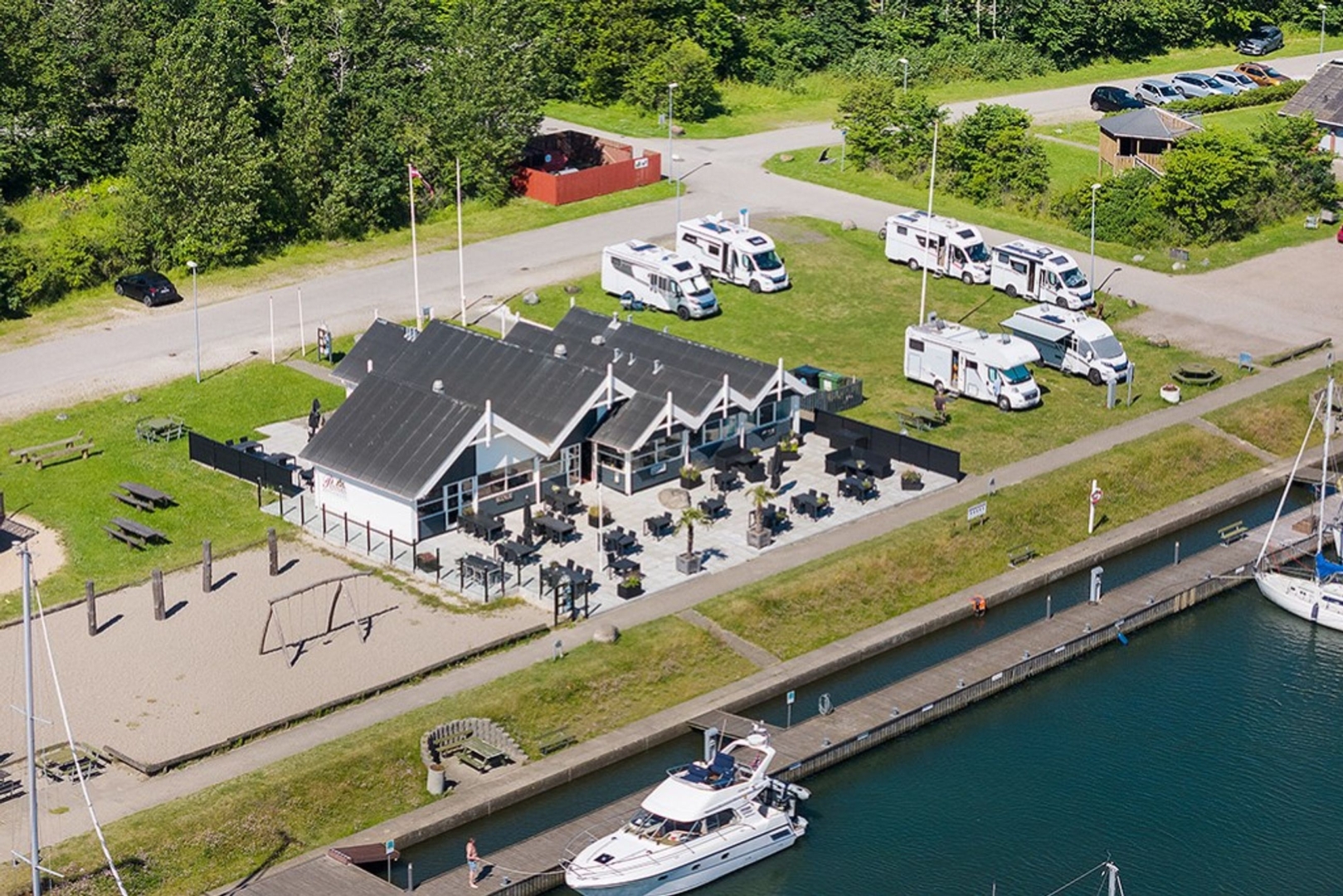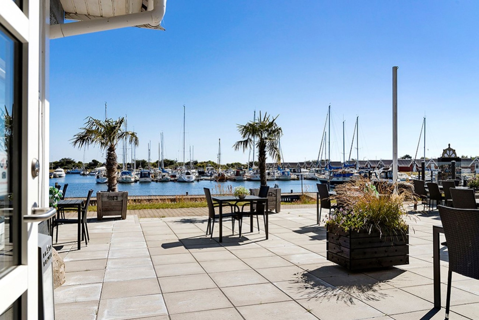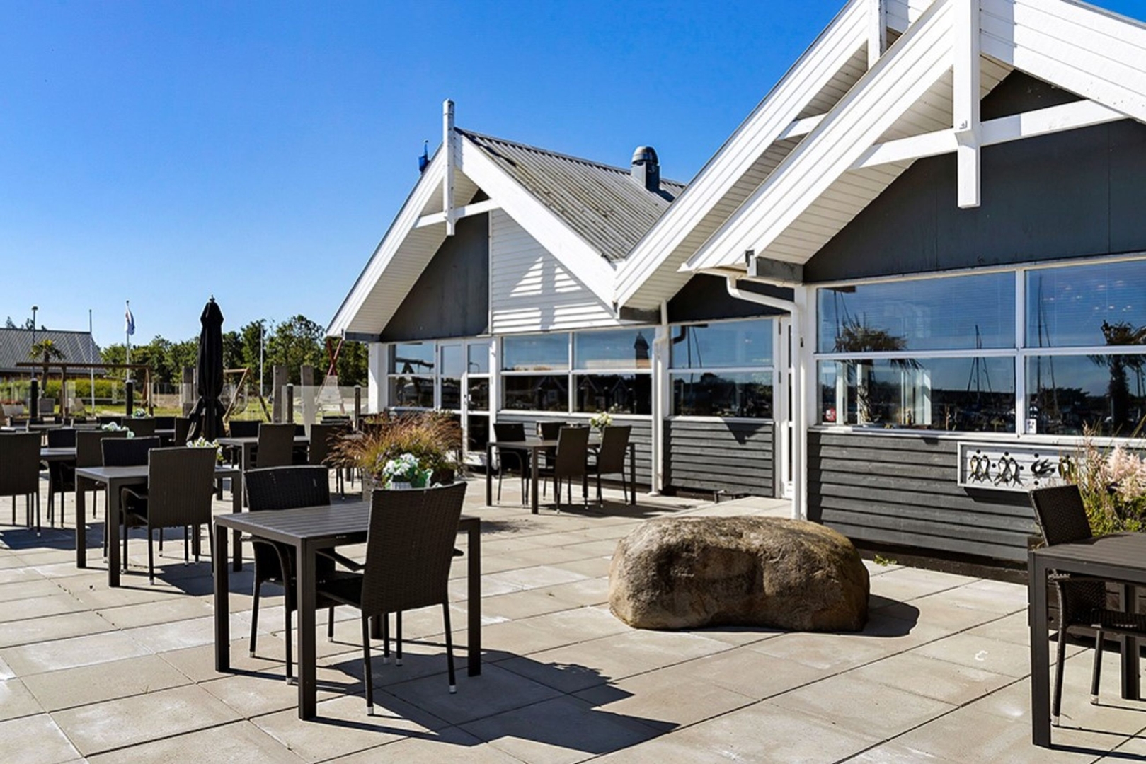 Den nyanlagte 350 m2 flisebelagte terrasse er indrettet med lounge område og plads til spisende gæster på begge sider af huset. Den primære terrasse vender mod sydøst og åbner op for en betagende udsigt over lystbådehavnen og promenaden. Terrassen er flankeret af Mobilhome parkering, med over 700 overnatninger sidste år, på den ene side, og den store populære legeplads på den anden. Terrassen er afskærmet af glas mod legepladsen, så børnefamilier trygt kan følge med i hvad der sker på legepladsen.