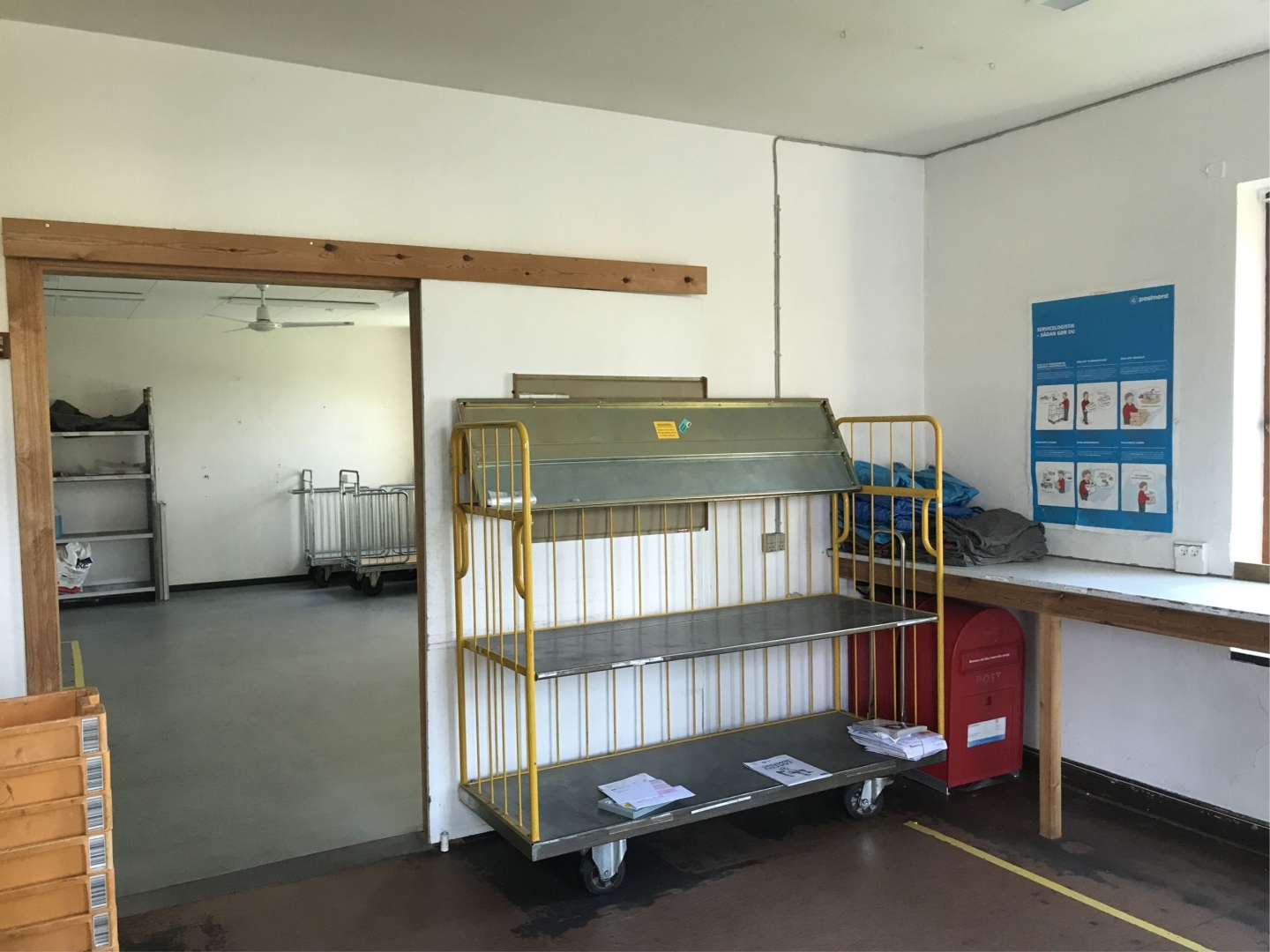 Den vestlige del af bygningen har tidligere været anvendt af Postnord og indeholder: Forrum - Lager/pakkerum - Tidligere ekspeditionslokale Vindfang - Nydeligt køkken og kontor med spiseplads Mellemgang Toilet.