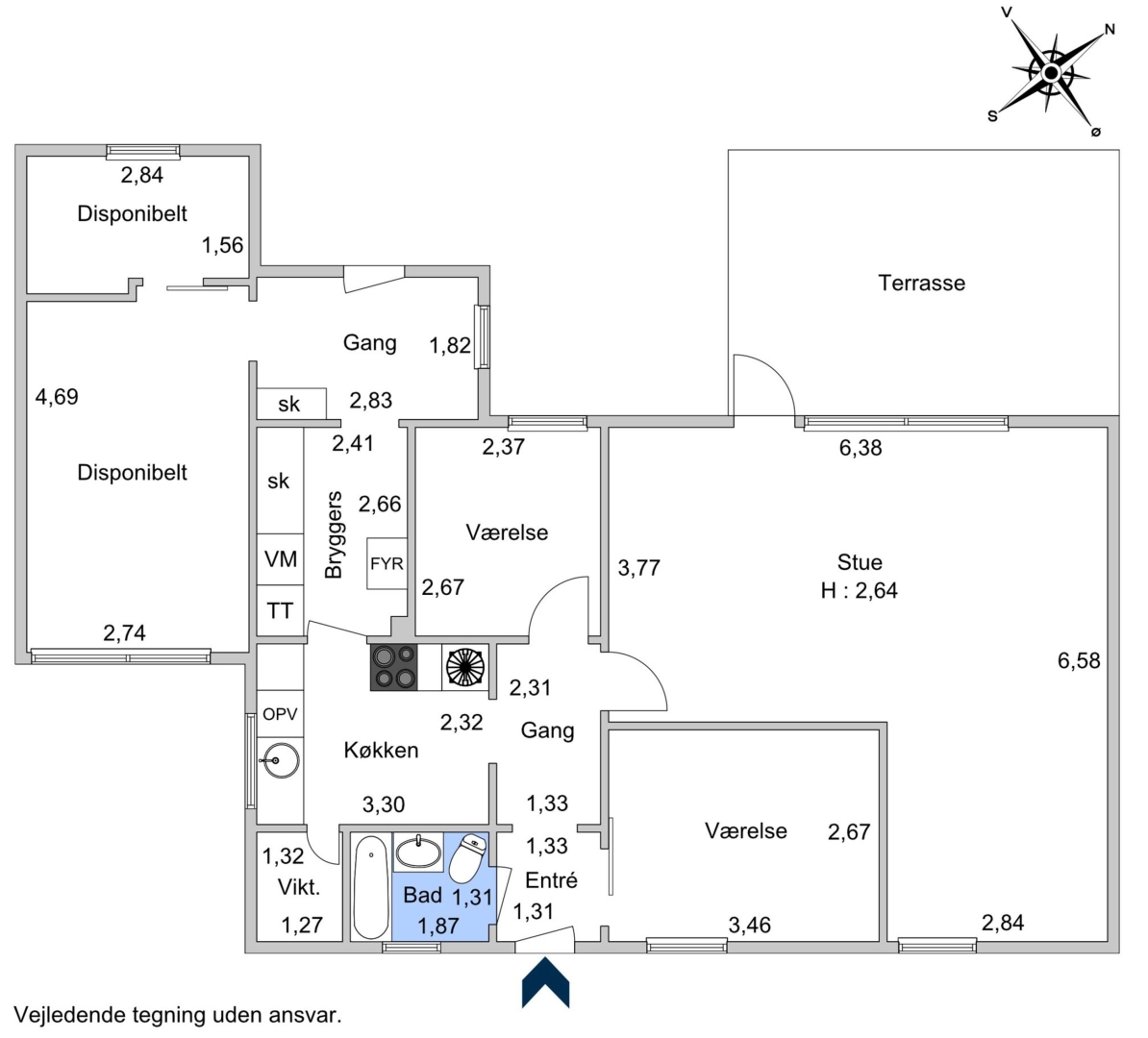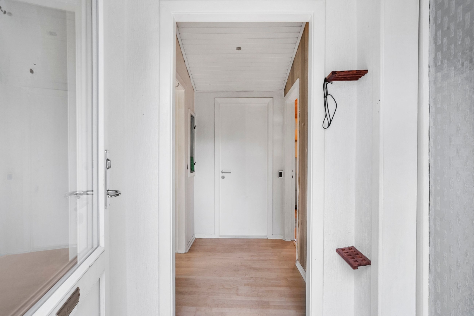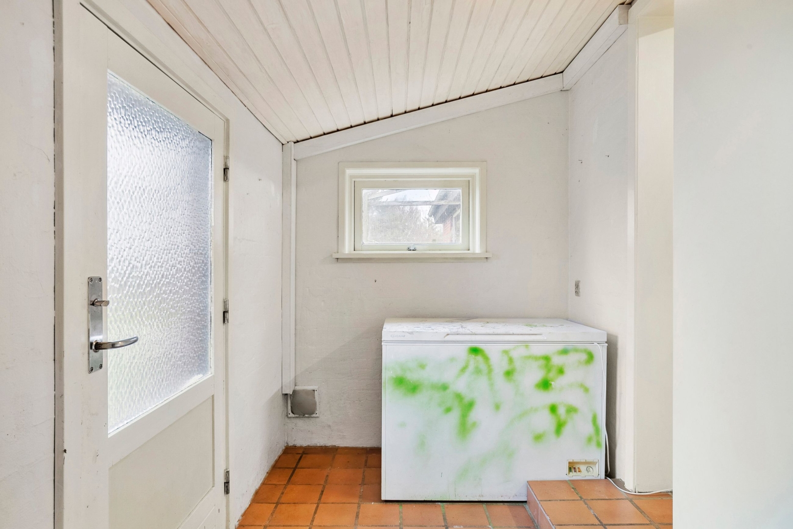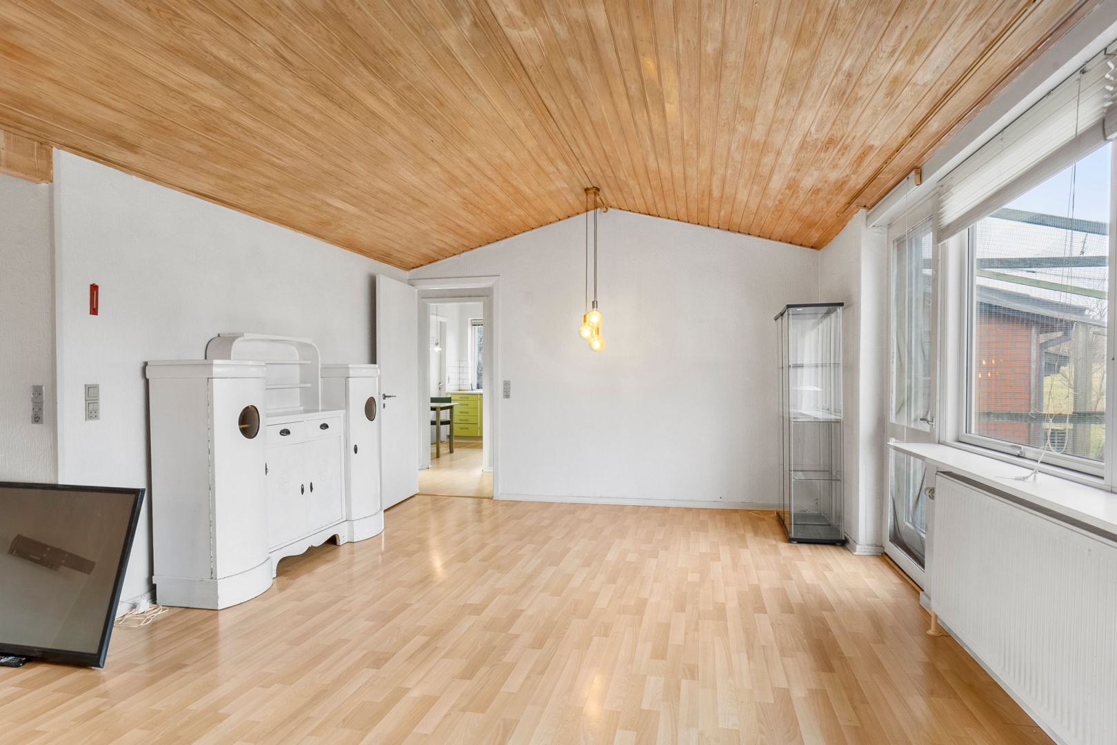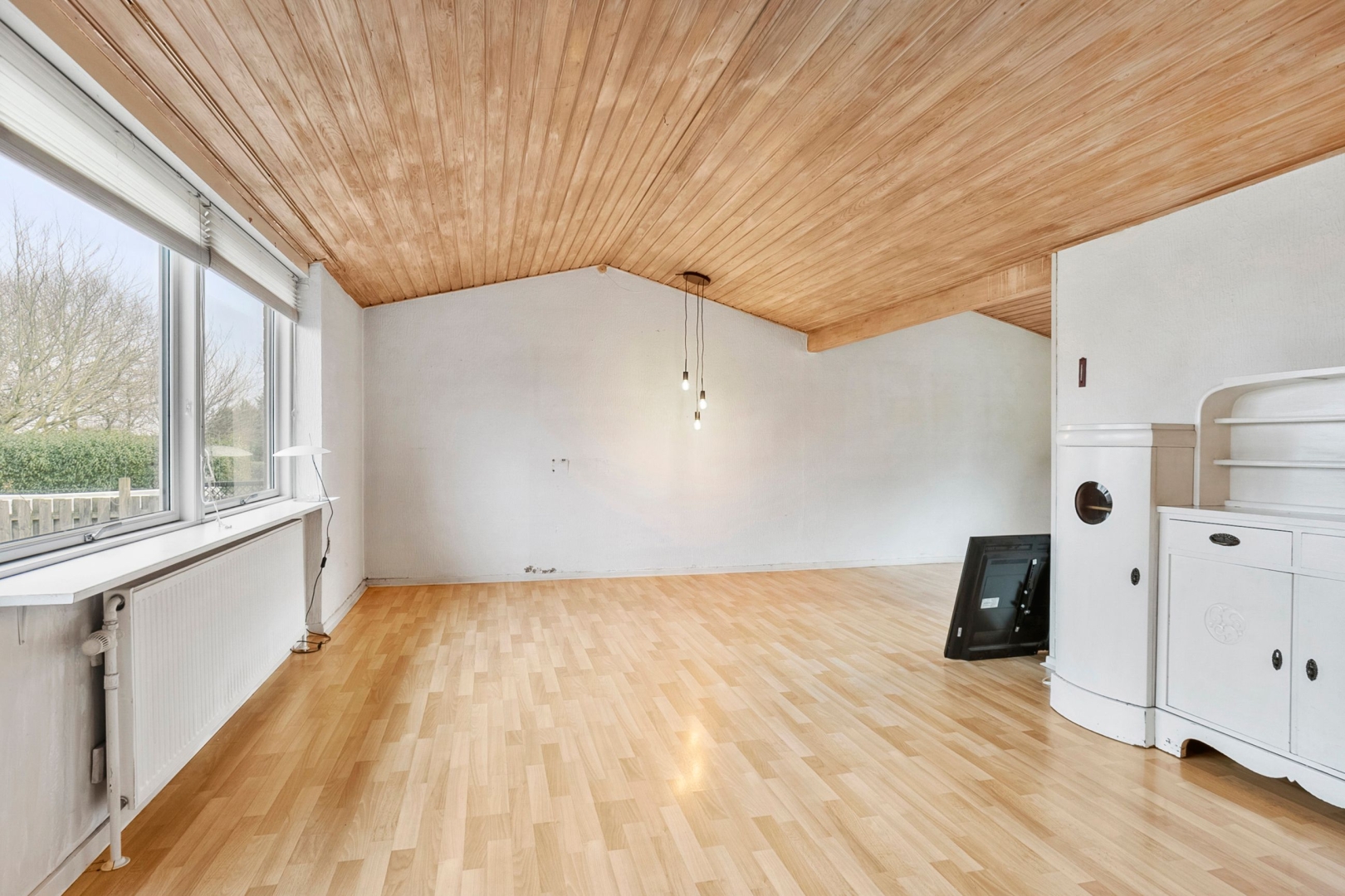Boligen byder på en entré, et soveværelse samt et køkken med adgang til viktualierum. Den kombinerede opholds- og spisestue har et dejligt lysindfald og direkte udgang til terrassen, hvilket skaber en naturlig sammenhæng mellem inde- og udeliv. Derudover rummer huset endnu et værelse, et badeværelse med badekar samt et praktisk bryggers med plads til både vaskemaskine og tørretumbler og videre adgang til baggang. Til ejendommen hører desuden to disponible rum, som i BBR er registreret som garage.