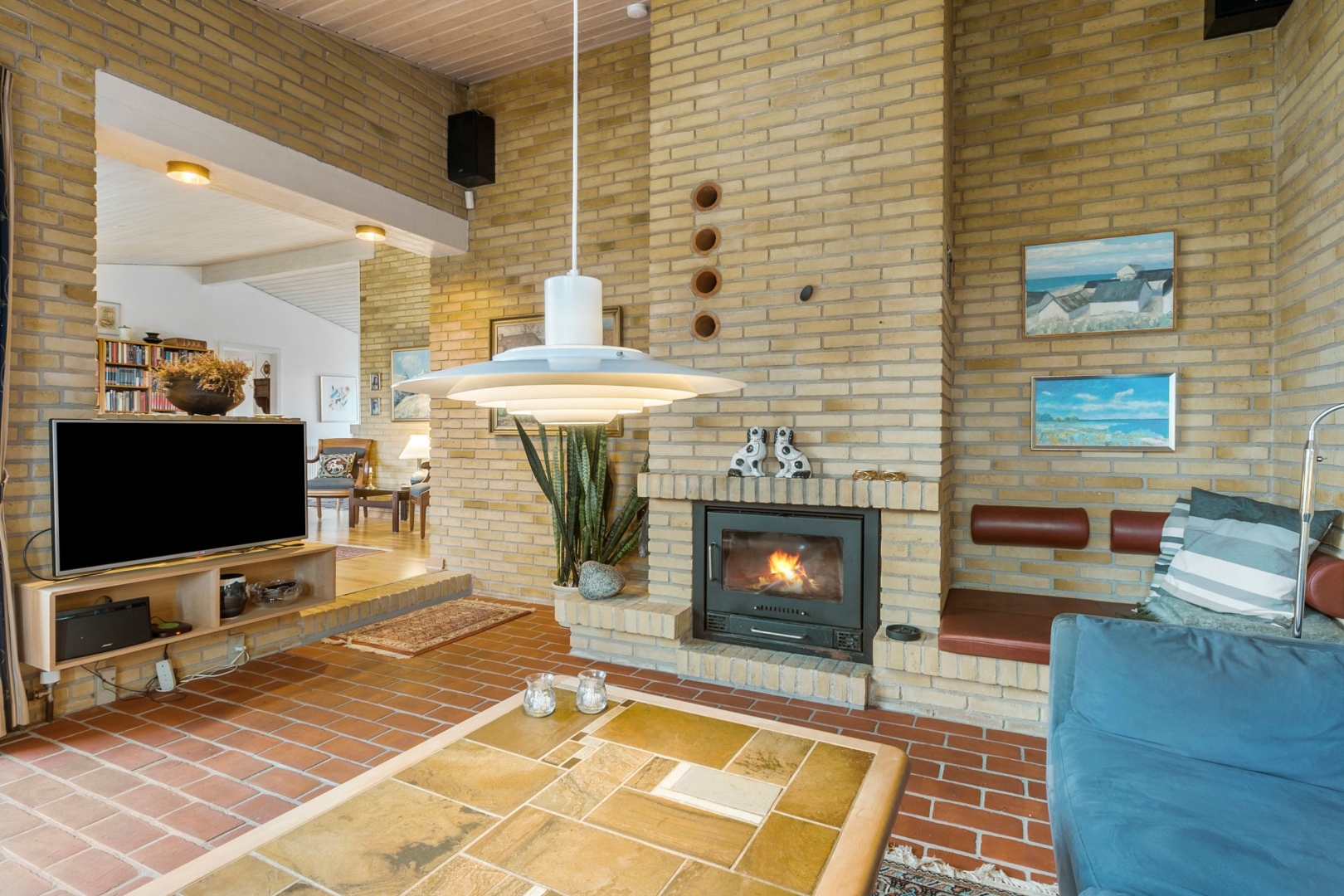 Opholdsstuen er lys og indbydende med trægulv, loft til kip og store vestvendte vinduespartier, som sikrer et dejligt lysindfald. Fra stuen er åben adgang en nedsænket stue med indbygget brændeovnsindsats, klinkegulv med gulvvarme og loft til kip. Fra den nedsænket stue er der udgang til en stor, vestvendt og ugeneret flisebelagt terrasse via en hævesænke dør.